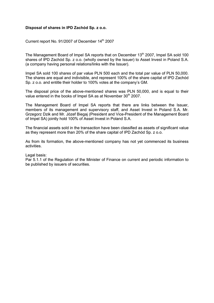 Disposal of shares in IPD Zachód Sp. z o.o. Current report No. 91/2007 of December 14th 2007 The Management Board of Impel SA reports that on December 13th 2007, Impel SA sold 100 shares of IPD Zachód Sp. z o.o. (wholly owned by the Issuer) to Asset Invest in Poland S.A. (a company having personal relations/links with the Issuer). Impel SA sold 100 shares of par value PLN 500 each and the total par value of PLN 50,000. The shares are equal and indivisible, and represent 100% of the share capital of IPD Zachód Sp. z o.o. and entitle their holder to 100% votes at the company’s GM. The disposal price of the above-mentioned shares was PLN 50,000, and is equal to their value entered in the books of Impel SA as at November 30th 2007. The Management Board of Impel SA reports that there are links between the Issuer, members of its management and supervisory staff, and Asset Invest in Poland S.A. Mr. Grzegorz Dzik and Mr. Józef Biegaj (President and Vice-President of the Management Board of Impel SA) jointly hold 100% of Asset Invest in Poland S.A. The financial assets sold in the transaction have been classified as assets of significant value as they represent more than 20% of the share capital of IPD Zachód Sp. z o.o. As from its formation, the above-mentioned company has not yet commenced its business activities. Legal basis: Par 5.1.1 of the Regulation of the Minister of Finance on current and periodic information to be published by issuers of securities.