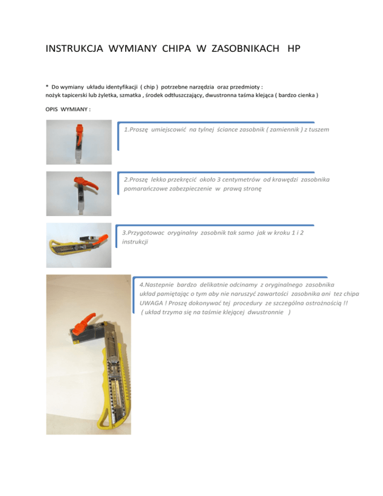 INSTRUKCJA WYMIANY CHIPA W ZASOBNIKACH HP * Do wymiany układu identyfikacji ( chip ) potrzebne narzędzia oraz przedmioty : nożyk tapicerski lub żyletka, szmatka , środek odtłuszczający, dwustronna taśma klejąca ( bardzo cienka ) OPIS WYMIANY : 1.Proszę umiejscowid na tylnej ściance zasobnik ( zamiennik ) z tuszem 2.Proszę lekko przekręcid około 3 centymetrów od krawędzi zasobnika pomaraoczowe zabezpieczenie w prawą stronę 3.Przygotowac oryginalny zasobnik tak samo jak w kroku 1 i 2 instrukcji 4.Nastepnie bardzo delikatnie odcinamy z oryginalnego zasobnika układ pamiętając o tym aby nie naruszyd zawartości zasobnika ani tez chipa UWAGA ! Proszę dokonywad tej procedury ze szczególna ostrożnością !! ( układ trzyma się na taśmie klejącej dwustronnie ) 5. Po dokonaniu procedury kroku 4 powinniśmy uzyskad odcięty układ Na jego drugiej stronie powinna znajdowad się taśma, której nie należy odklejad ani usuwad, jeżeli taśma posiada swoje właściwości klejące nie należy naklejad nowej powłoki. 6. Proszę o przyklejenie w miejscu zaznaczenia na zamienniku układu Układ należy przykleid miejscem styku polaczenia do zatrzasku zasobnika w głowicy Przed przyklejeniem należy odtłuścid podane miejsce środkiem służącym do tego celu . 7. Po dokonaniu czynności z poszczególnych kroków instrukcji zasobnik należy zamontowad w drukarce ! * przed założeniem zasobnika proszę zdemontowad pomaraoczowe zabezpieczenie dolne a po umieszczeniu w drukarce ściągnąd naklejkę z napisem pull z góry zasobnika ( jest to odpowietrznik drukarki ) Dziękujemy życzymy udanych wydruków