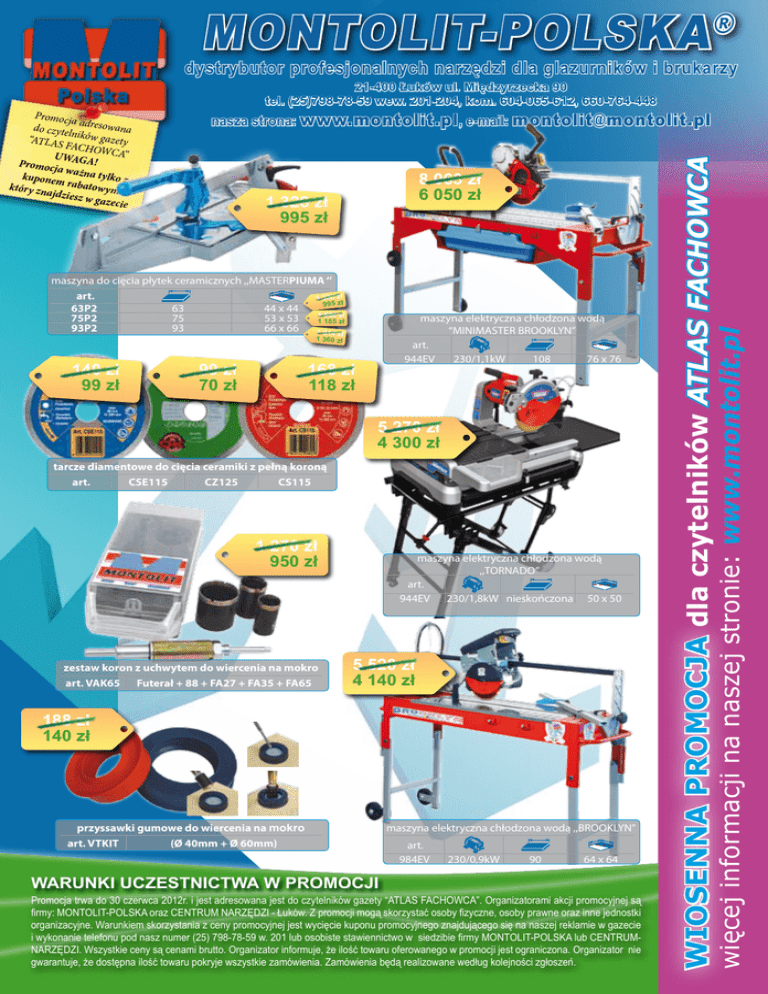 MONTOLIT-POLSKA ® dystrybutor profesjonalnych narzędzi dla glazurników i brukarzy 21-400 Łuków ul. Międzyrzecka 90 tel. (25)798-78-59 wew. 201-204, kom. 604-065-612, 660-764-448 1 328 zł 995 zł maszyna do cięcia płytek ceramicznych ,,MASTERPIUMA ‘’ art. 1 328 zł 995 zł 63P2 63 44 x 44 1 580 zł 75P2 75 53 x 53 1 185 zł 93P2 93 66 x 66 1 814 zł maszyna elektryczna chłodzona wodą “MINIMASTER BROOKLYN” art. 944EV 230/1,1kW 108 76 x 76 1 360 zł 140 zł 99 zł 99 zł 70 zł 168 zł 118 zł 5 270 zł 4 300 zł tarcze diamentowe do cięcia ceramiki z pełną koroną art. CSE115 CZ125 CS115 1 270 zł 950 zł zestaw koron z uchwytem do wiercenia na mokro art. VAK65 Futerał + 88 + FA27 + FA35 + FA65 maszyna elektryczna chłodzona wodą ,,TORNADO’’ art. 944EV 230/1,8kW nieskończona 50 x 50 5 520 zł 4 140 zł 188 zł 140 zł przyssawki gumowe do wiercenia na mokro art. VTKIT (Ø 40mm + Ø 60mm) WARUNKI UCZESTNICTWA W PROMOCJI maszyna elektryczna chłodzona wodą ,,BROOKLYN’’ art. 984EV 230/0,9kW 90 64 x 64 Promocja trwa do 30 czerwca 2012r. i jest adresowana jest do czytelników gazety “ATLAS FACHOWCA”. Organizatorami akcji promocyjnej są firmy: MONTOLIT-POLSKA oraz CENTRUM NARZĘDZI - Łuków. Z promocji mogą skorzystać osoby fizyczne, osoby prawne oraz inne jednostki organizacyjne. Warunkiem skorzystania z ceny promocyjnej jest wycięcie kuponu promocyjnego znajdującego się na naszej reklamie w gazecie i wykonanie telefonu pod nasz numer (25) 798-78-59 w. 201 lub osobiste stawiennictwo w siedzibie firmy MONTOLIT-POLSKA lub CENTRUMNARZĘDZI. Wszystkie ceny są cenami brutto. Organizator informuje, że ilość towaru oferowanego w promocji jest ograniczona. Organizator nie gwarantuje, że dostępna ilość towaru pokryje wszystkie zamówienia. Zamówienia będą realizowane według kolejności zgłoszeń. więcej informacji na naszej stronie: www.montolit.pl 8 063 zł 6 050 zł WIOSENNA PROMOCJA dla czytelników ATLAS FACHOWCA nasza strona: www.montolit.pl , e-mail: [email protected] Promoc ja a do czyte dresowana ln “ATLAS ików gazety FACHO W UWAGA CA“ ! Promoc ja w kupone ażna tylko z m rabato który zn ajdziesz wym w gazec ie centrum PROFESJONALNE WŁOSKIE NARZĘDZIA BUDOWLANE NARZĘDZI FT S.A. ORAZ KAPRIOL ® Nazwa Wymiary Art. Nazwa 25677 wiadro glazurnicze 15l 46 x 26 x 22 23472 kielnia kwadratowa z rączką PCV (16cm) 21,0 0 16,0 zł. 0 zł. 27,0 0 21,0 zł. 0 zł. Art. Nazwa Art. Nazwa 25645 paca gąbką do zmywania fug rączką PCV (3x13x29) 25650 paca do fugowania z rączką PCV (9,5x24,5) 54,0 0 43,0 zł. 0 zł. MIES ZA 718, DŁO 0 575, 0 zł. 00 z ł. TF 56,0 0 44,0 zł. 0 zł. Art. Nazwa Art. Nazwa Art. Nazwa Moc 25250 nakolanniki 11921 młotek gumowy 500g 38621 mieszadło 1200W 43,0 0 34,0 zł. 0 zł. 17,5 0 14,0 zł. 0 zł. Art. Nazwa Art. Nazwa 11981 szczypce glazurnicze 11891 paca do fugowania • stal nierdzewna wysokiej jakości • ostrze ze spiekanych węglików 16,0 0 13,0 zł. 0 zł. Art. Nazwa 11830 paca z gąbką do zmywania fug Stalowa paca 87,0 0 69,0 zł. 0 zł. Wysokiej jakości stalowa paca z hartowanej i polerowanej stali wzmocnionej nitami 19,5 0 15,6 zł. 0 zł. Art. Nazwa Art. Nazwa 11947 nakolanniki FT “ERGO-KEVLAR” 10935 przyssawka do glazury i szkła 107, 00 85,0 zł. 0 zł. Ergonomiczny uchwyt pace “ RO 98,0 TOR” 0 78,0 zł. 0 zł. Wygodny w użyciu antypoślizgowy uchwyt pozwalający na trzymanie pacy pod różnymi kątami. Nawet gdy jesteś leworęczny System szybkiej wymieniany pacy Amortyzowany uchwyt Art. Nazwa 11946 nakolanniki FT “SOFT-GEL” ZESTAW PAC OBROTOWYCH ROTOR - art. 11250 W zestawie: • • • • antypoślizgowy, obrotowy, ergonomiczny uchwyt z tworzywa paca prostokątna z równym brzegiem 120x280 mm paca prostokątna ząbkowana (6x6 mm) 120x280 paca prostokątna ząbkowana (10x10 mm) 120x280 ZAPRASZAMY! CENTRUM-NARZĘDZI - Łuków, 21-400 Łuków, ul. Międzyrzecka 90 www.centrum-narzedzi.pl, www.sklep.centrum-narzedzi.pl, [email protected], tel. 25 798-78-59 więcej informacji na naszej stronie: www.centrum-narzedzi.pl Art. WIOSENNA PROMOCJA dla czytelników ATLAS FACHOWCA 13,0 0 11,0 zł. 0 zł. 89,0 0 72,0 zł. 0 zł.
