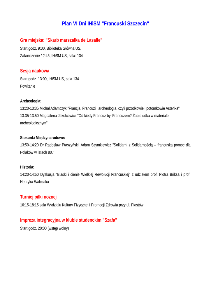Plan VI Dni IHiSM "Francuski Szczecin" Gra miejska: "Skarb marszałka de Lasalle" Start godz. 9:00, Biblioteka Główna US. Zakończenie 12:45, IHiSM US, sala: 134 Sesja naukowa Start godz. 13:00, IHiSM US, sala 134 Powitanie Archeologia: 13:20-13:35 Michał Adamczyk "Francja, Francuzi i archeologia, czyli przodkowie i potomkowie Asterixa" 13:35-13:50 Magdalena Jakołcewicz "Od kiedy Francuz był Francuzem? Żabie udka w materiale archeologicznym" Stosunki Międzynarodowe: 13:50-14:20 Dr Radosław Ptaszyński, Adam Szymkiewicz "Solidarni z Solidarnością – francuska pomoc dla Polaków w latach 80." Historia: 14:20-14:50 Dyskusja "Blaski i cienie Wielkiej Rewolucji Francuskiej" z udziałem prof. Piotra Briksa i prof. Henryka Walczaka Turniej piłki nożnej 16:15-18:15 sala Wydziału Kultury Fizycznej i Promocji Zdrowia przy ul. Piastów Impreza integracyjna w klubie studenckim "Szafa" Start godz. 20:00 (wstęp wolny)