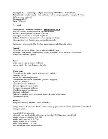 Andrzejki 2014 – rezerwacje i telefon kontaktowy 503139161 – Piotr Misiarz Kamienica Konczakowskich – sala lustrzana – stoły wersja angielska ( okrągłe) 8-10 os. Zabawę poprowadzi DJ Start godz. 19.00 Cena 100zł / os. Przystawka Danie główne ( podane na paterach ) wydanie godz. 19.30 Pieczeń z kaczki w sosie własnym z pomarańczami Polędwiczki wieprzowe zawinięte w boczku Eskalopek z kurczaka w płatkach migdałów Roladki drobiowe ze szpinakiem i z suszonym pomidorem Schab panierowany faszerowany ser szynka pieczarki Są to porcje mięsa około 80g. Średnio na osobę przypada 3kawałki mięsa. Dodatki Ziemniaki gotowane, kluski śląskie, ziemniaczki pieczone Surówka z marchewki, z ananasem na słodko, surówka z selera, buraczki z chrzanem surówka z czerwone kapusty Deser Lody waniliowe z gorącymi malinami napoje ciepłe – kawa z ekspresu , herbata Zimna płyta Półmisek wędlin tradycyjnych wędzonych ( 3 rodzaje) kabanosy, salami, pasztet oraz necówka pieczona Deska serów (sery żółte, pleśniowe, góralskie oscypki) Tymbaliki drobiowe koreczki serowe z dodatkami Tartinki z pastami warzywnymi Śledzie w śmietanie z jabłkami Muszle ( makaron) nadziewany Sałatka z brokułami Dekoracje ozdobne warzywne oraz mięsne – kompozycja firmowa Pieczywo mieszane Kolacja Stroganow wołowy z ryżem ( lekko pikantny ) napoję zimne: sok owocowe 100%( firma Toma) , pepsi, woda mineralna podawane w dzbankach bez ograniczeń cena alkoholi preferowana wino oak view californijskie półwytrawne karafka 0,5l ( białe, czerwone ) 20zł wódka żubrówka biała but. 0,5l 30zł wódka wyborowa but. 0,5l 35zł wódka absolut but. 0,5l 40zł whisky Ballantines 0,5l 50zł Inne alkohole wycena indywidualna.