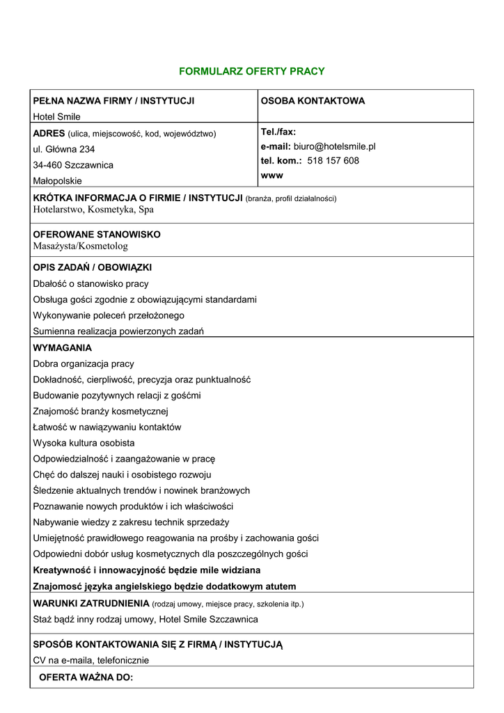 FORMULARZ OFERTY PRACY PEŁNA NAZWA FIRMY / INSTYTUCJI OSOBA KONTAKTOWA Hotel Smile ADRES (ulica, miejscowość, kod, województwo) Tel./fax: ul. Główna 234 e-mail: [email protected] 34-460 Szczawnica tel. kom.: 518 157 608 Małopolskie www KRÓTKA INFORMACJA O FIRMIE / INSTYTUCJI (branża, profil działalności) Hotelarstwo, Kosmetyka, Spa OFEROWANE STANOWISKO Masażysta/Kosmetolog OPIS ZADAŃ / OBOWIĄZKI Dbałość o stanowisko pracy Obsługa gości zgodnie z obowiązującymi standardami Wykonywanie poleceń przełożonego Sumienna realizacja powierzonych zadań WYMAGANIA Dobra organizacja pracy Dokładność, cierpliwość, precyzja oraz punktualność Budowanie pozytywnych relacji z gośćmi Znajomość branży kosmetycznej Łatwość w nawiązywaniu kontaktów Wysoka kultura osobista Odpowiedzialność i zaangażowanie w pracę Chęć do dalszej nauki i osobistego rozwoju Śledzenie aktualnych trendów i nowinek branżowych Poznawanie nowych produktów i ich właściwości Nabywanie wiedzy z zakresu technik sprzedaży Umiejętność prawidłowego reagowania na prośby i zachowania gości Odpowiedni dobór usług kosmetycznych dla poszczególnych gości Kreatywność i innowacyjność będzie mile widziana Znajomosć języka angielskiego będzie dodatkowym atutem WARUNKI ZATRUDNIENIA (rodzaj umowy, miejsce pracy, szkolenia itp.) Staż bądź inny rodzaj umowy, Hotel Smile Szczawnica SPOSÓB KONTAKTOWANIA SIĘ Z FIRMĄ / INSTYTUCJĄ CV na e-maila, telefonicznie OFERTA WAŻNA DO: