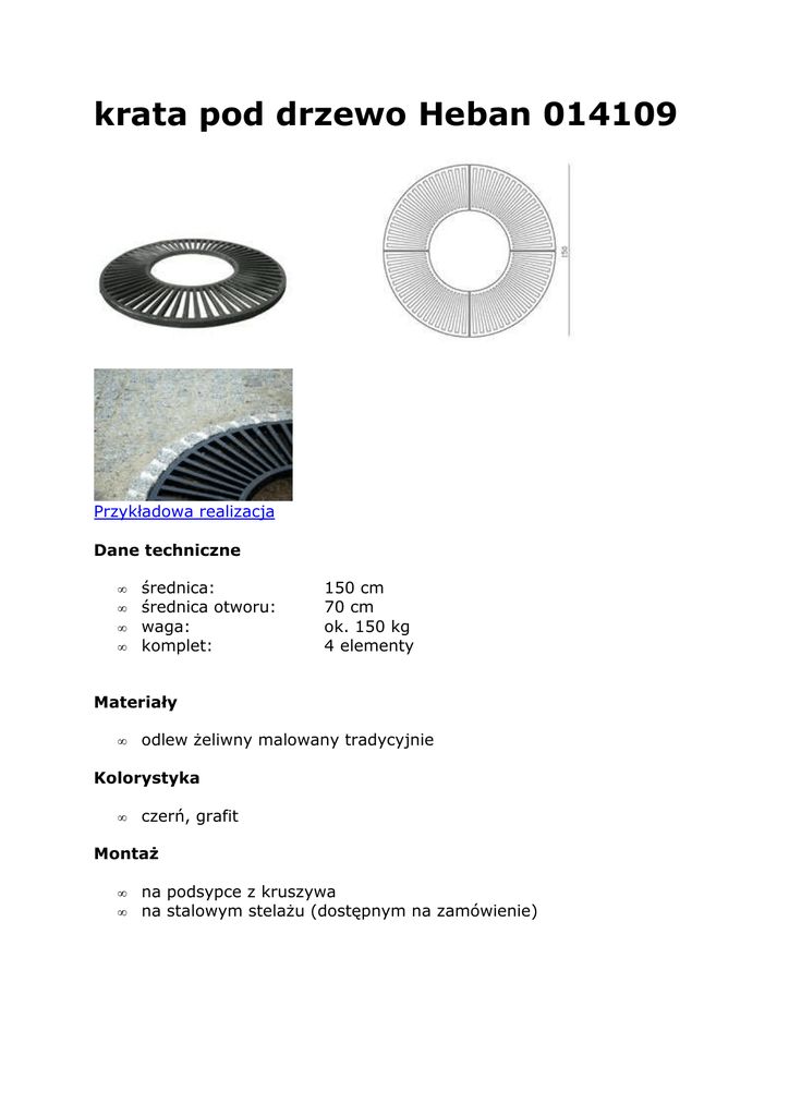 krata pod drzewo Heban 014109 Przykładowa realizacja Dane techniczne • • • • średnica: średnica otworu: waga: komplet: 150 cm 70 cm ok. 150 kg 4 elementy Materiały • odlew Ŝeliwny malowany tradycyjnie Kolorystyka • czerń, grafit MontaŜ • • na podsypce z kruszywa na stalowym stelaŜu (dostępnym na zamówienie)