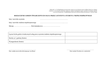 Załącznik nr 3 do Regulaminu przyznawania wsparcia oraz dysponowania środkami dotacji na zadania związane ze stwarzaniem studentom, będącym osobami niepełnosprawnymi warunków do pełnego udziału w procesie kształcenia w Podhalańskiej Państwowej Wyższej Szkole Zawodowej w Nowym Targu ROZLICZENIE GODZIN ŚWIADCZONYCH USŁUG PRZEZ ASYSTENTA STUDENTA NIEPEŁNOSPRAWNEGO Imię i nazwisko asystenta ………………………………………………. Imię i nazwisko studenta niepełnosprawnego ………………………………………...…….. Miesiąc ……………………………. Rok kalendarzowy ……………………………. Łączna liczba godzin świadczonych usług przez asystenta studenta niepełnosprawnego Stawka za 1 godzinę (brutto): Wynagrodzenie (brutto): ………………………….………………….. ………………………….………………….. Data i podpis pracownika dokonującego weryfikacji Data i podpis Prorektora ds. studenckich