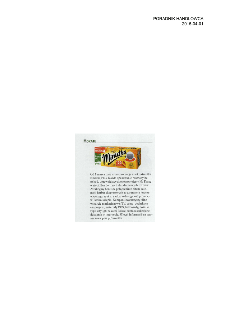 PORADNIK HANDLOWCA 2015-04-01 MOKATE Od 1 marca trwa cross-promocja marki Minutka z marką Plus. Każde opakowanie promocyjne to kod, uprawniający abonentów oferty Na Kartę w sieci Plus do trzech dni darmowych rozmów. Atrakcyjny bonus w połączeniu z hitem kate gorii herbat ekspresowych to gwarancja jeszcze większego zysku. Zadbaj o dostępność promocji w Twoim sklepie. Kampanii towarzyszy silne wsparcie marketingowe: TV, prasa, dodatkowe ekspozycje, materiały POS, billboardy, nośniki typu citylight w całej Polsce, szeroko zakrojone działania w internecie. Więcej informacji na stro nie www.plus.pl/minutlca.