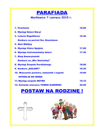 PARAFIADA Marklowice 7 czerwca 2015 r. 1. Powitanie 16.00 2. Występ Dzieci Maryi 3. Loteria Rogalikowa 16.30 Konkurs na portret Św. Stanisława 4. Quiz Biblijny 5. Występ Chóru Spójnia 17.00 6. Występ instrumentalny dzieci 17.30 7. Bieg Samarytański Konkurs na „Wic Kościelny” 8. Występ Zespołu Parafialnego 18.00 9. Konkurs „KOLORY” 18.30 10. Wręczenie pucharu, statuetek i nagród 19.00 INTENCJE DO NIEBA 11. Występ zespołu RETRO 19.15 12. Gwiazda wieczoru TOMEK KAMIŃSKI 20.00 POSTAW NA RODZINĘ !