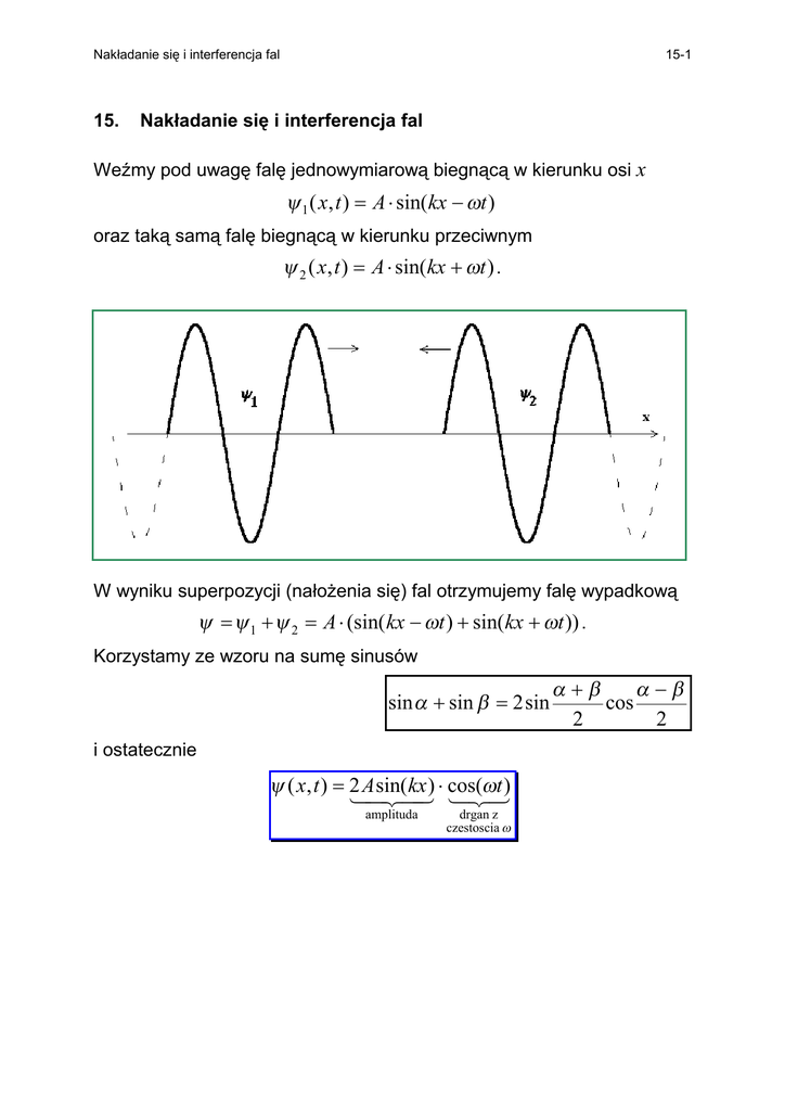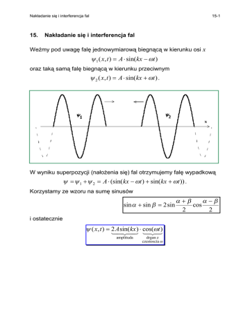 Nakładanie się i interferencja fal 15. 15-1 Nakładanie się i interferencja fal Weźmy pod uwagę falę jednowymiarową biegnącą w kierunku osi x ψ 1 ( x, t ) = A ⋅ sin(kx − ωt ) oraz taką samą falę biegnącą w kierunku przeciwnym ψ 2 ( x, t ) = A ⋅ sin(kx + ωt ) . W wyniku superpozycji (nałożenia się) fal otrzymujemy falę wypadkową ψ = ψ 1 + ψ 2 = A ⋅ (sin( kx − ωt ) + sin(kx + ωt )) . Korzystamy ze wzoru na sumę sinusów sin α + sin β = 2 sin i ostatecznie kx ) ⋅ cos(ωt ) ψ ( x, t ) = 2#A$sin( "$! #"! amplituda drgan z czestoscia ω α+β α−β cos 2 2 Nakładanie się i interferencja fal 15-2 Amplituda drgań wypadkowych zależy od położenia x – inaczej niż dla fali biegnącej – zmieniając się od zera do 2A. Drgania odbywające się w różnych miejscach różnią się fazą o π lub wcale. Tego rodzaju ruch w ośrodku nazywa się falą stojącą. Kwadrat amplitudy fali stojącej jest proporcjonalny do energii drgań elementów ośrodka. Miejsca zerowe sin(kx ) = 0 , o zerowej amplitudzie drgań, nazywają się węzłami fali stojącej. Miejsca ekstremów sin(kx ) = ±1 , o maksymalnej amplitudzie drgań, nazywają się strzałkami fali stojącej. Nakładanie się i interferencja fal 15-3 Sąsiednie strzałki (lub węzły) fali stojącej dzieli odległość ∆x = λ . 2 Dudnienia Jeżeli nakładające się fale różnią się nieco długością sin( k1 x + ω1t ) + sin( k2 x + ω 2t ) , to w yniku nałożenia otrzymujemy: ω − ω2 ω + ω2 k +k k −k 2 sin 1 2 x + 1 t ⋅ cos 1 2 x + 1 t 2 2 2 2 2#sin( k$ ⋅" x +$∆$ ⋅! t ) ⋅ cos( k" ⋅ x$ +ω t) ω$ $$ #$∆$ $⋅! wolnozmienna amplituda drgan o czestosci ω Kiedy ∆k = ∆ω = 0 to mamy do czynienia z interferencją. Nakładanie się i interferencja fal 15-4 Interferencja fal na płaszczyźnie Fala kolista ze źródła punktowego ma postać: r A ⋅ sin(kr − ωt ) = A ⋅ sin 2π ( − νt ) . λ W punktach (a,0) i (–a,0) są źródła punktowe fal kolistych z1 i z2: r z1 = A ⋅ sin 2π ( 1 − νt ) λ z2 = A ⋅ sin 2π ( r2 − νt ) . λ Wypadkowy ruch w ośrodku jest sumą drgań wywołanych przez każdą z fal z osobna z = z1 + z2 r −r r +r z = 2 A ⋅ cos 2π ( 1 2 ) ⋅ sin 2π ( 1 2 − νt ) 2λ$ 2λ$$$ #$$ $"$$ ! #$$ $" ! amplituda wypadkowa drgan o czestotliwosci ν Jeżeli r1 − r2 = ( n + 12 ) λ , to amplituda drgań wypadkowych jest równa zero. Jeżeli r1 − r2 = nλ , to amplituda drgań wypadkowych jest maksymalna. Nakładanie się i interferencja fal 15-5 Równanie r1 − r2 = const jest równaniem hiperboli o ogniskach w (a,0) i (–a,0). Równania hiperbol, wzdłuż których występują maksima amplitudy drgań wypadkowych wyglądają następująco: r1 − r2 = nλ n = 0, ± 1, ± 2, ± 3,... ( x + a ) 2 + y 2 − ( x − a ) 2 + y 2 = nλ 1 2 2 16a 2 x 2 y=± n λ + 2 2 − 4( a 2 + x 2 ) 2 n λ Dla n = 0 otrzymujemy równanie osi y. Nakładanie się i interferencja fal 15-6 W dużych odległościach od źródeł, tzn. dla r1 , r2 >> l , mamy ∆r = nλ ≈ l cosα albo lim cosα = r→∞ nλ l π kierunek głównego maksimum 2 λ cosα1 = l 2λ cosα 2 = maksima interferencyjne rzędu n l 3λ cosα 3 = l α0 = Kąty α n określają zarazem kierunki asymptot hiperbol. W tych kierunkach, w wyniku interferencji, rozchodzi się fala o maksymalnej amplitudzie. Wprowadźmy różnicę faz między źródłami fal. Wtedy ϕ r1 − r2 ϕ 0 r +r − ) ⋅ sin( 1 2 − νt + 0 ) 2λ 2 2λ 2 r −r Warunkim na maksimum amplitudy jest 1 2 − ϕ 0 = n , i dla n = 0 λ λ cosα 0 = ϕ 0 , czyli zmienia się kierunek, w którym występuje l z = z1 + z2 = 2 A ⋅ cos 2π ( maksimum interferencyjne amplitudy fali.