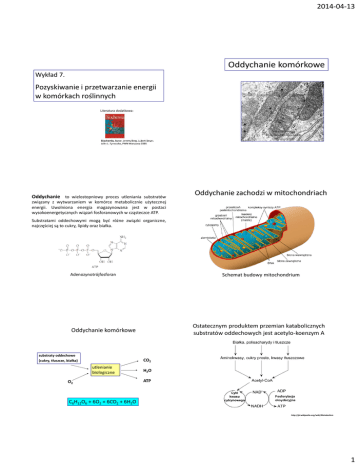 2014-04-13 Oddychanie komórkowe Wykład 7. Pozyskiwanie i przetwarzanie energii w komórkach roślinnych Literatura dodatkowa: Oddychanie to wielostopniowy proces utleniania substratów Oddychanie zachodzi w mitochondriach związany z wytwarzaniem w komórce metabolicznie użytecznej energii. Uwolniona energia magazynowana jest w postaci wysokoenergetycznych wiązań fosforanowych w cząsteczce ATP. Substratami oddechowymi mogą być różne związki organiczne, najczęściej są to cukry, lipidy oraz białka. Adenozynotrójfosforan Schemat budowy mitochondrium Ostatecznym produktem przemian katabolicznych substratów oddechowych jest acetylo-koenzym A Oddychanie komórkowe substraty oddechowe (cukry, tłuszcze, białka) CO2 utlenianie biologiczne O2 H2O ATP C6H12O6 + 6O2 = 6CO2 + 6H2O http://pl.wikipedia.org/wiki/Metabolizm 1 2014-04-13 Glikoliza Oddychanie komórkowe Fosforylacja substratowa Acetylo-CoA Oznaczenia enzymów: 1- heksokinaza, 2 - izomeraza heksozofosforanowa, 3 - 1-fosfofruktokinaza, 4 - aldolaza, 5 - izomeraza triozofosforanowa, 6 - dehydrogenaza aldehydu 3-fosfoglicerynowego, 7 - kinaza fosfoglicerynianu, 8 - mutaza fosfoglicerynianu, 9 - enolaza, 10 - kinaza pirogronianowa, 11 - 1-fosfotransferaza pirofosforan– fruktoza-6-fosforan, 12 fosfofruktokinaza, 13 - inwertaza, 14 - mutaza glukozofosforanowa, 15 - fosforylaza skrobiowa, 16 galaktokinaza, 17 - urydylotransferaza galaktozo1-fosforanu, 18 - 4-epimeraza UDP-galaktozy. W warunkach beztlenowych uruchamiana jest fermentacja http://pl.wikipedia.org/wiki/Oddychanie_kom%C3%B3rkowe Fermentacja umożliwia odtwarzanie w warunkach beztlenowych koniecznego dla glikolizy NAD+ Utlenienie kwasów tłuszczowych http://pl.wikipedia.org/wiki/Oddychanie_kom%C3%B3rkowe 2 2014-04-13 Oddychanie komórkowe - cykl kwasu cytrynowego glikoliza β-oksydacja deaminacja Produktami cyklu Krebsa są dwutlenek węgla i zredukowane nukleotydy Acetylo-CoA → 2CO2 + 3NADH + FADH2 + ATP http://pl.wikipedia.org/wiki/Oddychanie_kom%C3%B3rkowe Substraty, enzymy i produkty cyklu przemian kwasów trójkarboksylowych Cząsteczka Enzym Syntaza cytrynianowa Kondensacja Cytrynian Akonitaza Dehydratacja cis-Akonitan Akonitaza Hydratacja Izocytrynian Substraty/ Produkty/ Koenzymy Koenzymy Typ reakcji Szczawiooctan + Acetylo-CoA CoASH + H+ H2O H2O H2O Dehydrogenaza izocytrynianowa Utlenianie NAD Szczawiobursztynian Dehydrogenaza izocytrynianowa Dekarboksylacja + NADH + H+ H+ CO2 α-Ketoglutaran Dehydrogenaza α-ketoglutaranowa Dekarboksylacja oksydacyjna NAD+ + CoA-SH NADH + H+ + CO2 Bursztynylo-CoA Tiokinaza bursztynianowa Hydroliza GDP +P GTP + CoA-SH Bursztynian Dehydrogenaza bursztynianowa Utlenianie FAD Fumaran Fumaraza H2O L-Jabłczan Dehydrogenaza jabłczanowa Łańcuch oddechowy – ostatni etap oddychania komórkowego Addycja (H2O) Utlenianie NAD FADH2 + Szczawiooctan Oddychanie komórkowe NADH + H+ Spalanie płomieniem a oddychanie komórkowe Składniki łańcucha oddechowego Błona mitochondrialna Łańcuch oddechowy Fosforylacja oksydacyjna Produktami reakcji łańcucha oddechowego są woda i ATP K I – dehydrogenazą NADH, K II – dehydrogenaza bursztynianowa, K III - oksydoreduktazą ubichinon-cytochrom c, K IV – oksydaza cytochromowa, AOX – oksydaza alternatywna, ID – wewnętrzna dehydrogenaza NADH, OD – zewnętrzna dehydrogenaza NAD(P)H, GPDH – mitochondrialna dehydrogenaza glicerolo-3-fosforanu, K V – syntaza ATP, Q – ubichinon, cyt. c - cytochrom c. Kolorem zielonym oznaczono kompleksy obecne jedynie w mitochondriach roślinnych. http://pl.wikipedia.org/wiki/Oddychanie_kom%C3%B3rkowe 3 2014-04-13 Składniki łańcucha oddechowego Bilans energetyczny utleniania komórkowego jednej cząsteczki glukozy Cytochrom FMN ATP → ADP + Pi Ubichinony wg. http://e.sggw.waw.pl/course/view.php?id=432 ΔE=7,3 kcal/mol wg. http://e.sggw.waw.pl/course/view.php?id=432 Współczynnik (iloraz) oddechowy RQ = liczba moli produkowanego CO2 liczba moli zużywanego O2 RQ – ang. Respiratory quotient, dla cukrów wynosi 1, dla kwasów >1, dla białek <1, lipidy 07-08 Wykorzystanie metabolitów przemian oddechowych do syntezy różnych związków 4 2014-04-13 Zagadnienia • Glikoliza, cykl Krebsa, łańcuch oddechowy • Oksydaza alternatywna • Substraty oddechowe a współczynnik oddechowy Przeźrocza dodatkowe Składniki łańcucha oddechowego Oddychanie niezależne od cyjanków Q - ubichinon C - cytochromy AOX - oksydaza alternatywna Źródło: http://pl.wikipedia.org Źródło: http://pl.wikipedia.org 5 2014-04-13 Masa (Da) Grupa prostetyczna I oksydoreduktaza NADHCoQ 85000 FMN FeS II oksydoreduktaza bursztynian-CoQ 97000 FAD FeS III oksydoreduktaza CoQH2cytochrom c hem b561 28700 hem b566 0 hem c1 FeS cytochrom c 13000 hem c IV oksydaza cytochromu c hem a 20000 hem a 3 0 Cua i Cub Kompleks enzymatyczny 6