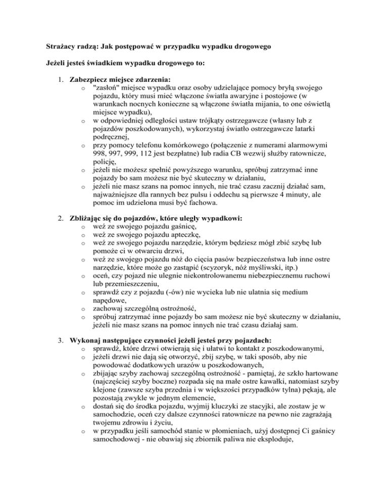StraŜacy radzą: Jak postępować w przypadku wypadku drogowego JeŜeli jesteś świadkiem wypadku drogowego to: 1. Zabezpiecz miejsce zdarzenia: o "zasłoń" miejsce wypadku oraz osoby udzielające pomocy bryłą swojego pojazdu, który musi mieć włączone światła awaryjne i postojowe (w warunkach nocnych konieczne są włączone światła mijania, to one oświetlą miejsce wypadku), o w odpowiedniej odległości ustaw trójkąty ostrzegawcze (własny lub z pojazdów poszkodowanych), wykorzystaj światło ostrzegawcze latarki podręcznej, o przy pomocy telefonu komórkowego (połączenie z numerami alarmowymi 998, 997, 999, 112 jest bezpłatne) lub radia CB wezwij słuŜby ratownicze, policję, o jeŜeli nie moŜesz spełnić powyŜszego warunku, spróbuj zatrzymać inne pojazdy bo sam moŜesz nie być skuteczny w działaniu, o jeŜeli nie masz szans na pomoc innych, nie trać czasu zacznij działać sam, najwaŜniejsze dla rannych bez pulsu i oddechu są pierwsze 4 minuty, ale pomoc im udzielona musi być fachowa. 2. ZbliŜając się do pojazdów, które uległy wypadkowi: o weź ze swojego pojazdu gaśnicę, o weź ze swojego pojazdu apteczkę, o weź ze swojego pojazdu narzędzie, którym będziesz mógł zbić szybę lub pomoŜe ci w otwarciu drzwi, o weź ze swojego pojazdu nóŜ do cięcia pasów bezpieczeństwa lub inne ostre narzędzie, które moŜe go zastąpić (scyzoryk, nóŜ myśliwski, itp.) o oceń, czy pojazd nie ulegnie niekontrolowanemu niebezpiecznemu ruchowi lub przemieszczeniu, o sprawdź czy z pojazdu (-ów) nie wycieka lub nie ulatnia się medium napędowe, o zachowaj szczególną ostroŜność, o spróbuj zatrzymać inne pojazdy bo sam moŜesz nie być skuteczny w działaniu, jeŜeli nie masz szans na pomoc innych nie trać czasu działaj sam. 3. Wykonaj następujące czynności jeŜeli jesteś przy pojazdach: o sprawdź, które drzwi otwierają się i ułatwi to kontakt z poszkodowanymi, o jeŜeli drzwi nie dają się otworzyć, zbij szybę, w taki sposób, aby nie powodować dodatkowych urazów u poszkodowanych, o zbijając szyby zachowaj szczególną ostroŜność - pamiętaj, Ŝe szkło hartowane (najczęściej szyby boczne) rozpada się na małe ostre kawałki, natomiast szyby klejone (zawsze szyba przednia i w większości przypadków tylna) pękają, ale pozostają zwykle w jednym elemencie, o dostań się do środka pojazdu, wyjmij kluczyki ze stacyjki, ale zostaw je w samochodzie, oceń czy dalsze czynności ratownicze na pewno nie zagraŜają twojemu zdrowiu i Ŝyciu, o w przypadku jeśli samochód stanie w płomieniach, uŜyj dostępnej Ci gaśnicy samochodowej - nie obawiaj się zbiornik paliwa nie eksploduje, o jeśli stwierdzisz u poszkodowanych brak oznak pulsu i oddechu przystąp do oŜywiania, najskuteczniejsze działania przedmedyczne wykonasz z dala od uszkodzonych pojazdów ewakuując poszkodowanych. Nie rób tego jednak, jeŜeli nie umiesz zrobić tego prawidłowo, poniewaŜ moŜesz pogłębić urazy, a nawet spowodować śmierć poszkodowanego. 4. Zalarmuj słuŜby ratownicze, a w przypadku gdy: o samochód nie jest naraŜony na niekontrolowany ruch lub przemieszczenie o nie ma wycieków paliwa o odłączona jest instalacja elektryczna pojazdu o miejsce zdarzenia jest odpowiednio zabezpieczone o poszkodowani dają oznaki Ŝycia, ale są uwięzieni w pojeździe, - przystąp do udzielania im pierwszej pomocy (opatrzenia ran, tamowania krwotoków, ustabilizowania kręgosłupa i kończyn ). Kontroluj oddech i czynności serca poszkodowanych, okryj ich kocem lub odzieŜą w celu uniknięcia pogłębienia wstrząsu. Zostań przy poszkodowanych do czasu przybycia ratowników. Pamiętaj aby wszystkie czynności wykonywać z rozwagą, bez niepotrzebnych emocji i dodatkowych zniszczeń, do czasu aŜ przybędą specjalistyczne słuŜby ratownicze. Pamiętaj, Ŝe Ty równieŜ moŜesz się znaleźć w podobnej sytuacji. Materiał opracowali: • • st. kpt. mgr inŜ. Aleksander Adamski, kpt. mgr inŜ. Dariusz Dąbek Katedra Techniki PoŜarniczej, Zakład Ratownictwa Technicznego, Szkoła Główna SłuŜby PoŜarniczej w Warszawie