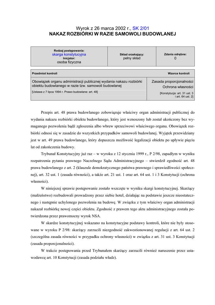 Wyrok z 26 marca 2002 r., SK 2/01 NAKAZ ROZBIÓRKI W RAZIE SAMOWOLI BUDOWLANEJ Rodzaj postępowania: skarga konstytucyjna Inicjator: osoba fizyczna Skład orzekający: pełny skład Przedmiot kontroli Obowiązek organu administracji publicznej wydania nakazu rozbiórki obiektu budowlanego w razie tzw. samowoli budowlanej [Ustawa z 7 lipca 1994 r. Prawo budowlane: art. 48] Zdania odrębne: 0 Wzorce kontroli Zasada proporcjonalności Ochrona własności [Konstytucja: art. 31 ust. 3 i art. 64 ust. 2] Przepis art. 48 prawa budowlanego zobowiązuje właściwy organ administracji publicznej do wydania nakazu rozbiórki obiektu budowlanego, który jest wznoszony lub został ukończony bez wymaganego pozwolenia bądź zgłoszenia albo wbrew sprzeciwowi właściwego organu. Obowiązek rozbiórki odnosi się w zasadzie do wszystkich przypadków samowoli budowlanej. Wyjątek przewidziany jest w art. 49 prawa budowlanego, który dopuszcza możliwość legalizacji obiektu po upływie pięciu lat od zakończenia budowy. Trybunał Konstytucyjny już raz – w wyroku z 12 stycznia 1999 r., P 2/98, zapadłym w wyniku rozpatrzenia pytania prawnego Naczelnego Sądu Administracyjnego – stwierdził zgodność art. 48 prawa budowlanego z art. 2 (klauzule demokratycznego państwa prawnego i sprawiedliwości społecznej), art. 32 ust. 1 (zasada równości), a także art. 21 ust. 1 oraz art. 64 ust. 1 i 3 Konstytucji (ochrona własności). W niniejszej sprawie postępowanie zostało wszczęte w wyniku skargi konstytucyjnej. Skarżący (małżeństwo) rozbudowali prowadzony przez siebie hotel, działając na podstawie jeszcze nieostatecznego i następnie uchylonego pozwolenia na budowę. W związku z tym właściwy organ administracji nakazał rozbiórkę nowej części obiektu. Zgodność z prawem tego aktu administracyjnego została potwierdzona przez prawomocny wyrok NSA. W skardze konstytucyjnej wskazano na konstytucyjne podstawy kontroli, które nie były stosowane w wyroku P 2/98: skarżący zarzucili niezgodność zakwestionowanej regulacji z art. 64 ust. 2 (szczególna zasada równości w przypadku ochrony własności) w związku z art. 31 ust. 3 Konstytucji (zasada proporcjonalności). W trakcie postępowania przed Trybunałem skarżący zarzucili również naruszenie przez ustawodawcę art. 10 Konstytucji (zasada podziału władz). 2 ROZSTRZYGNIĘCIE Art. 48 prawa budowlanego jest zgodny z art. 64 ust. 2 w związku z art. 31 ust. 3 Konstytucji. Trybunał pozostawił bez rozpoznania zarzut niezgodności zaskarżonego przepisu z art. 10 Konstytucji. GŁÓWNE TEZY UZASADNIENIA 1. Naruszający prawo powinien liczyć się z tym, że minimalną konsekwencją jego postępowania będzie – o ile okoliczności faktyczne i charakter naruszenia na to pozwalają – przywrócenie stanu poprzedniego. Nie pozostaje w sprzeczności z konstytucyjnym wymogiem proporcjonalności ograniczeń wolności i praw (art. 31 ust. 3 Konstytucji) zastosowanie takich środków prawnych, które uniemożliwiają sprawcy zachowanie korzyści płynących z naruszenia prawa. 2. Zawarta w art. 31 ust. 3 Konstytucji przesłanka porządku publicznego jest zorientowana na zapewnienie prawidłowego funkcjonowania życia społecznego. Nie jest ona bezpośrednio czy wyłącznie powiązana z państwem, lecz jest związana – w większym stopniu niż pojęcie bezpieczeństwa państwa – z ochroną praw i wolności jednostki przed codziennymi zagrożeniami. 3. Porządek publiczny, o którym jest mowa w ww. przepisie, wymaga w szczególności zapewnienia tzw. ładu architektonicznego i przestrzennego oraz właściwych warunków użytkowania obiektów budowlanych, co ma istotne znaczenie także dla praw i wolności innych osób. Realizacji tych celów służy przede wszystkim konieczność uzyskania pozwolenia na budowę, które właściwy organ wydaje po przeprowadzeniu postępowania sprawdzającego, czy zostały spełnione warunki wymagane w przepisach prawa (por. art. 32-38 prawa budowlanego). 4. Przewidziany w kwestionowanym art. 48 ustawy z dnia 7 lipca 1994 r. – Prawo budowlane nakaz rozbiórki w przypadku samowoli budowlanej sankcjonuje wymóg bezwzględnego przestrzegania obowiązku uzyskania pozwolenia budowlanego – jest środkiem pozwalającym na jego wyegzekwowanie, a tym samym służy ochronie tych samych wartości określonych w art. 31 ust. 3 Konstytucji (porządek publiczny, ochrona środowiska oraz wolności i praw innych osób), których ochronie służy ów wymóg. 5. Nakaz rozbiórki, o którym mowa wyżej, ma charakter restytucyjny, a nie represyjny; nie może on być oceniany jako dodatkowa kara (obok określonej w przepisie karnym, jakim jest art. 90 prawa budowlanego). 6. Przepis art. 49 prawa budowlanego, ograniczający stosowanie art. 48 w sytuacji, gdy od dnia zakończenia budowy obiektu budowlanego lub jego części upłynęło pięć lat, nawiązuje do instytucji przedawnienia (znanej zarówno prawu prywatnemu, jak i prawu publicznemu). Tego rodzaju różnicowania sytuacji podmiotów z uwagi na upływ czasu nie sposób kwestionować z punktu widzenia równości podmiotów stosunków prawnych. 7. W poprzednim stanie konstytucyjnym z uwagi na brak normy, która expressis verbis statuowałaby zasadę zakazu nadmiernej ingerencji w sferę wolności i praw jednostki, konieczne było odwoływanie się do generalnej formuły państwa prawnego jako normatywnego źródła jej obowiązywania. Obecnie zasadę proporcjonalności statuuje, w sposób w 3 pełni samodzielny i całościowy, art. 31 ust. 3 Konstytucji. Wobec jego obowiązywania nie ma już potrzeby sięgania do zasady państwa prawnego (art. 2 Konstytucji). 8. Wyrok Trybunału Konstytucyjnego z 12 stycznia 1999 r., P 2/98 zapadł w wyniku rozpatrzenia pytania prawnego Naczelnego Sądu Administracyjnego, a w niniejszej sprawie postępowanie zostało wszczęte na podstawie skargi konstytucyjnej. Identyczny był w owej sprawie zaskarżony przepis (art. 48 prawa budo