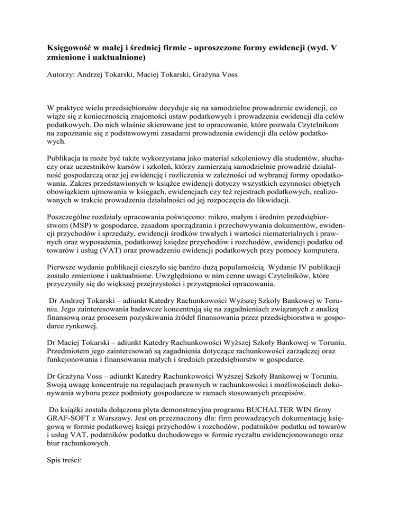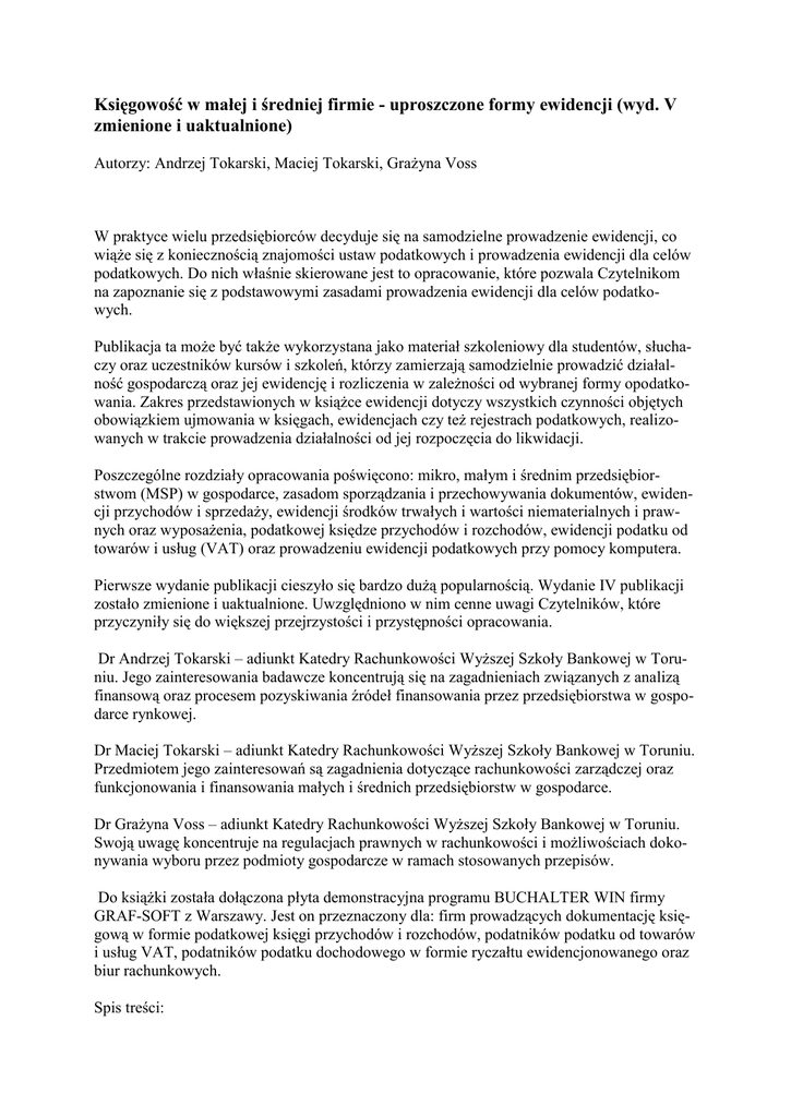 Księgowość w małej i średniej firmie - uproszczone formy ewidencji (wyd. V zmienione i uaktualnione) Autorzy: Andrzej Tokarski, Maciej Tokarski, Grażyna Voss W praktyce wielu przedsiębiorców decyduje się na samodzielne prowadzenie ewidencji, co wiąże się z koniecznością znajomości ustaw podatkowych i prowadzenia ewidencji dla celów podatkowych. Do nich właśnie skierowane jest to opracowanie, które pozwala Czytelnikom na zapoznanie się z podstawowymi zasadami prowadzenia ewidencji dla celów podatkowych. Publikacja ta może być także wykorzystana jako materiał szkoleniowy dla studentów, słuchaczy oraz uczestników kursów i szkoleń, którzy zamierzają samodzielnie prowadzić działalność gospodarczą oraz jej ewidencję i rozliczenia w zależności od wybranej formy opodatkowania. Zakres przedstawionych w książce ewidencji dotyczy wszystkich czynności objętych obowiązkiem ujmowania w księgach, ewidencjach czy też rejestrach podatkowych, realizowanych w trakcie prowadzenia działalności od jej rozpoczęcia do likwidacji. Poszczególne rozdziały opracowania poświęcono: mikro, małym i średnim przedsiębiorstwom (MSP) w gospodarce, zasadom sporządzania i przechowywania dokumentów, ewidencji przychodów i sprzedaży, ewidencji środków trwałych i wartości niematerialnych i prawnych oraz wyposażenia, podatkowej księdze przychodów i rozchodów, ewidencji podatku od towarów i usług (VAT) oraz prowadzeniu ewidencji podatkowych przy pomocy komputera. Pierwsze wydanie publikacji cieszyło się bardzo dużą popularnością. Wydanie IV publikacji zostało zmienione i uaktualnione. Uwzględniono w nim cenne uwagi Czytelników, które przyczyniły się do większej przejrzystości i przystępności opracowania. Dr Andrzej Tokarski – adiunkt Katedry Rachunkowości Wyższej Szkoły Bankowej w Toruniu. Jego zainteresowania badawcze koncentrują się na zagadnieniach związanych z analizą finansową oraz procesem pozyskiwania źródeł finansowania przez przedsiębiorstwa w gospodarce rynkowej. Dr Maciej Tokarski – adiunkt Katedry Rachunkowości Wyższej Szkoły Bankowej w Toruniu. Przedmiotem jego zainteresowań są zagadnienia dotyczące rachunkowości zarządczej oraz funkcjonowania i finansowania małych i średnich przedsiębiorstw w gospodarce. Dr Grażyna Voss – adiunkt Katedry Rachunkowości Wyższej Szkoły Bankowej w Toruniu. Swoją uwagę koncentruje na regulacjach prawnych w rachunkowości i możliwościach dokonywania wyboru przez podmioty gospodarcze w ramach stosowanych przepisów. Do książki została dołączona płyta demonstracyjna programu BUCHALTER WIN firmy GRAF-SOFT z Warszawy. Jest on przeznaczony dla: firm prowadzących dokumentację księgową w formie podatkowej księgi przychodów i rozchodów, podatników podatku od towarów i usług VAT, podatników podatku dochodowego w formie ryczałtu ewidencjonowanego oraz biur rachunkowych. Spis treści: Wprowadzenie 7 Rozdział 1 Formy organizacyjno-prawne przedsiębiorstw w Polsce – Maciej Tokarski 9 1.1. Podział i uwarunkowania działalności MŚP w Polsce 9 1.2. Formy organizacyjno-prawne i ich wpływ na wybór formy opodatkowania 17 1.3. Podatek VAT 27 1.3.1. Podmioty zwolnione z podatku VAT 29 1.3.2. Mali podatnicy VAT 41 1.4. Kryteria wyodrębniania małych i średnich przedsiębiorstw na potrzeby rachunkowości 56 Rozdział 2 Zasady sporządzania i przechowywania dokumentów – Maciej Tokarski 65 2.1. Cechy dowodu i zasady jego sporządzania 65 2.2. Klasyfikacja dowodów księgowych w ujęciu bilansowym i podatkowym 68 2.3. Archiwizacja dokumentów i ksiąg podatkowych 74 2.4. Zakres usług i odpowiedzialności biur rachunkowych i kierownika jednostki za prowadzenie ksiąg podatkowych 83 2.5. Zakończenie współpracy z biurem rachunkowym 101 Rozdział 3 Ewidencja przychodów – podatek zryczałtowany – Andrzej Tokarski 105 3.1. Podmioty objęte i wyłączone ryczałtem od przychodów ewidencjonowanych 105 3.2. Stawki podatkowe 111 3.3. Zakres ewidencji przychodów 114 3.4. Zakres ewidencji przychodów w ryczałcie podmiotów będących podatnikami VAT 119 3.5. Limity ryczałtu 125 3.6. Zasady ustalania podatku w ryczałcie 134 3.7. Deklaracje rozliczeniowe 136 3.8. Wady zryczałtowanego podatku dochodowego 143 Rozdział 4 Ewidencja sprzedaży – Grażyna Voss 147 4.1. Obowiązek prowadzenia ewidencji sprzedaży 147 4.2. Ewidencja sprzedaży przy użyciu kas fiskalnych 149 Rozdział 5 Ewidencja środków trwałych, wartości niematerialnych i prawnych oraz wyposażenia – Andrzej Tokarski 151 5.1. Pojęcie środków trwałych, wartości niematerialnych i prawnych oraz wyposażenia 151 5.2. Ewidencja środków trwałych, wartości niematerialnych i prawnych 158 5.3. Ewidencja wyposażenia 162 Rozdział 6 Podatkowa księga przychodów i rozchodów – Grażyna Voss 6.1. Podmiotowy zakres prowadzenia ksiąg 165 6.2. Dokumenty stanowiące podstawę zapisu w księgach 169 165 6.3. Zasady dokonywania zapisów 171 6.4. Ustalanie podstawy opodatkowania i zaliczki na podatek 6.5. Deklaracje podatkowe 179 6.6. Przykład ewidencji w księdze przychodów i rozchodów 181 Rozdział 7 Ewidencja podatku od towarów i usług (VAT) – Grażyna Voss 7.1. Ewidencja sprzedaży 193 7.2. Ewidencja zakupu 194 7.3. Rozlicznie podatku VAT i deklaracja VAT-7 194 177 183 Rozdział 8 Prowadzenie ewidencji podatkowych przy użyciu komputera – Grażyna Voss 8.1. Wymogi prawne 197 8.2. Zasady przechowywania danych 198 8.3. Ewidencja ryczałtu 199 8.4. Podatkowa księga przychodów i rozchodów 200 Zakończenie Bibliografia 203 205 197