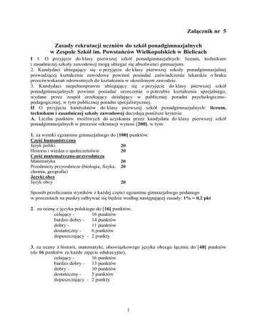 Załącznik nr 5 Zasady rekrutacji uczniów do szkół ponadgimnazjalnych w Zespole Szkół im. Powstańców Wielkopolskich w Bielicach I 1. O przyjęcie do klasy pierwszej szkół ponadgimnazjalnych: liceum, technikum i zasadniczej szkoły zawodowej mogą ubiegać się absolwenci gimnazjum. 2. Kandydaci ubiegający się o przyjęcie do klasy pierwszej szkoły ponadgimnazjalnej prowadzącej kształcenie zawodowe powinni posiadać zaświadczenie lekarskie o braku przeciwwskazań zdrowotnych do kształcenia w określonym zawodzie. 3. Kandydaci niepełnosprawni ubiegający się o przyjęcie do klasy pierwszej szkół ponadgimnazjalnych powinni posiadać orzeczenie o potrzebie kształcenia specjalnego, wydane przez zespół orzekający działający w publicznej poradni psychologicznopedagogicznej, w tym publicznej poradni specjalistycznej. II O przyjęciu kandydatów do klasy pierwszej szkół ponadgimnazjalnych: liceum, technikum i zasadniczej szkoły zawodowej decydują poniższe kryteria: A. Liczba punktów możliwych do uzyskania przez kandydata do klasy pierwszej szkół ponadgimnazjalnych w procesie rekrutacji wynosi [200], w tym: 1. za wyniki egzaminu gimnazjalnego do [100] punktów: Część humanistyczna Język polski 20 Historia i wiedza o społeczeństwie 20 Cześć matematyczno-przyrodnicza Matematyka 20 Przedmioty przyrodnicze (biologia, fizyka, 20 chemia, geografia) Języki obce Język obcy 20 Sposób przeliczania wyników z każdej części egzaminu gimnazjalnego podanego w procentach na punkty odbywać się będzie według następującej zasady: 1% = 0,2 pkt 2. za ocenę z języka polskiego do [16] punktów, celujący 16 punktów bardzo dobry - 14 punktów dobry 11 punktów dostateczny 6 punktów dopuszczający - 2 punkty 3. za oceny z historii, matematyki, obowiązkowego języka obcego łącznie do [48] punktów (do 16 punktów za każde zajęcie edukacyjne), celujący 16 punktów bardzo dobry - 13 punktów dobry 10 punktów dostateczny 5 punktów dopuszczający - 2 punkty 1 4. za inne osiągnięcia kandydata wymienione na świadectwie ukończenia gimnazjum do [36] punktów, w tym : a. za ukończenie gimnazjum z wyróżnieniem [6] punktów, b. za osiągnięcia w konkursach wiedzy organizowanych przez kuratora oświaty albo organizowanych co najmniej na szczeblu powiatowym przez inne podmioty działające na terenie szkół (niezależnie od liczby osiągnięć) [20] punktów, w tym za: uzyskanie tytułu finalisty - 15 punktów w olimpiadach ogólnopolskich oraz konkursach przedmiotowych na szczeblu wojewódzkim, organizowanych i współorganizowanych przez Kujawsko - Pomorskiego Kuratora Oświaty wymienionych poniżej : Konkurs przedmiotowy z języka polskiego, - Konkurs przedmiotowy z matematyki, - Konkurs przedmiotowy z historii, - Konkurs przedmiotowy z fizyki, - Konkurs przedmiotowy z chemii, - Konkurs przedmiotowy z biologii, - Konkurs przedmiotowy z geografii, - Konkurs przedmiotowy z języka angielskiego, - Konkurs przedmiotowy z języka niemieckiego, - Konkurs przedmiotowy z języka rosyjskiego, - Konkurs przedmiotowy z języka francuskiego , - Regionalny konkurs Wiedzy o Samorządzie Terytorialnym dla uczniów klas III gimnazjum - Konkurs Wojewódzki z Fizyki i Astronomii - Konkurs matematyczny „Liga Zadaniowa” dla uczniów klas I i II gimnazjum; - Olimpiada Języka Angielskiego dla Gimnazjalistów - Olimpiada Matematyczna dla Gimnazjalistów - Olimpiada Informatyczna dla Gimnazjalistów; za tytuł laureata – 5 punktów, za tytuł finalisty - 3 punkty w konkursach tematycznych współorganizowanych przez Kujawsko - Pomorskiego Kuratora Oświaty wymienionych poniżej : -Ogólnopolski konkurs historyczny „Losy żołnierza i dzieje oręża polskiego w latach 1768 -1864. Od konfederacji barskiej do powstania styczniowego”. -Ogólnopolski konkurs „Losy Bliskich i losy Dalekich – życie Polaków w latach 1914 – 1989”. c. za jedno z listy osiągnięć wymienionych poniżej: *osiągnięcia sportowe co najmniej na szczeblu powiatowym (niezależnie od liczby osiągnięć) [4] punkty, w tym za: - osiągnięcia na szczeblu krajowym lub międzynarodowym (miejsca od I do VI w zawodach krajowych lub reprezentowanie Polski na arenie międzynarodowej) - 4 punkty - osiągnięcia na szczeblu wojewódzkim (miejsca od I do VI) - 3 punkty - osiągnięcia na szczeblu powiatowym (miejsca od I do III) - 2 punkty dyscypliny indywidualne: akrobatyka sportowa, badminton, biathlon, biathlon letni, bieg na orientację, biegi przełajowe, boks, bowling sportowy, brydż sportowy, gimnastyka artystyczna, gimnastyka sportowa, jeździectwo, judo, kajakarstwo, karate tradycyjne, karate, WKF, kolarstwo szosowe, kolarstwo torowe, kręglarstwo, lekkoatletyka, łucznictwo, łyżwiarstwo figurowe, łyżwiarstwo szybkie short track, modelarstwo kosmiczne, modelarstwo lotnicze, narciarstwo alpejskie, narciarstwo klasyczne - biegi, skoki, kombinacja norweska, pięciobój nowoczesny, pływanie, pływanie synchroniczne, pływanie w płetwach, podnoszenie ciężarów, saneczkarstwo, skoki do wody, snowboard, sport kartingowy, strzelectwo sportowe, szachy, szermierka, taekwondo ITF, 2 taekwondo WAW, taniec sportowy, tenis, tenis stołowy, triathlon, warcaby, wioślarstwo, wspinaczka sportowa, zapasy styl klasyczny, zapasy styl wolny, żeglarstwo, żeglarstwo lodowe; gry zespołowe: baseball, hokej na lodzie, hokej na trawie, kajak polo, koszykówka, korfball, piłka nożna, piłka ręczna, piłka siatkowa, piłka siatkowa plażowa, piłka wodna, rugby, unihokej; *osiągnięcia artystyczne co najmniej na szczeblu powiatowym (niezależnie od liczby osiągnięć) [4] punkty, w tym za: - osiągnięcia na szczeblu krajowym lub międzynarodowym (miejsca od I do VI w zawodach krajowych lub reprezentowanie Polski na arenie międzynarodowej) - 4 punkty - osiągnięcia na szczeblu wojewódzkim (miejsca od I do VI) - 3 punkty - osiągnięcia na szczeblu powiatowym (miejsca od I do III) - 2 punkty *[2] punkt