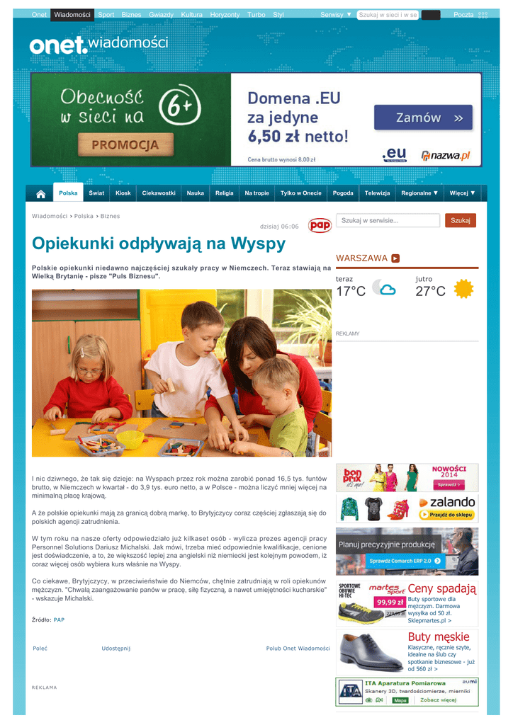 Onet Wiadomości Sport Biznes Gwiazdy Kultura Horyzonty Turbo Styl Serwisy ▼ Poczta Szukaj w sieci i w serwisach... ◦◦◦ ◦◦◦ wiadomości Polska Świat Kiosk Ciekawostki Nauka Religia Na tropie Tylko w Onecie Wiadomości › Polska › Biznes dzisiaj 06:06 Pogoda Telewizja Regionalne ▼ Szukaj w serwisie... Więcej ▼ Szukaj Opiekunki odpływają na Wyspy WARSZAWA Polskie opiekunki niedawno najczęściej szukały pracy w Niemczech. Teraz stawiają na Wielką Brytanię - pisze "Puls Biznesu". teraz 17°C ► jutro 27°C REKLAMY Foto: Thinkstock I nic dziwnego, że tak się dzieje: na Wyspach przez rok można zarobić ponad 16,5 tys. funtów brutto, w Niemczech w kwartał - do 3,9 tys. euro netto, a w Polsce - można liczyć mniej więcej na minimalną płacę krajową. A że polskie opiekunki mają za granicą dobrą markę, to Brytyjczycy coraz częściej zgłaszają się do polskich agencji zatrudnienia. W tym roku na nasze oferty odpowiedziało już kilkaset osób - wylicza prezes agencji pracy Personnel Solutions Dariusz Michalski. Jak mówi, trzeba mieć odpowiednie kwalifikacje, cenione jest doświadczenie, a to, że większość lepiej zna angielski niż niemiecki jest kolejnym powodem, iż coraz więcej osób wybiera kurs właśnie na Wyspy. Co ciekawe, Brytyjczycy, w przeciwieństwie do Niemców, chętnie zatrudniają w roli opiekunów mężczyzn. "Chwalą zaangażowanie panów w pracę, siłę fizyczną, a nawet umiejętności kucharskie" - wskazuje Michalski. Źródło: PAP Ceny spadają Buty sportowe dla mężczyzn. Darmowa wysyłka od 50 zł. Sklepmartes.pl > Buty męskie Poleć REKLAMA Udostępnij Polub Onet Wiadomości Klasyczne, ręcznie szyte, idealne na ślub czy spotkanie biznesowe - już od 560 zł > Koniec bloku reklamowego WARSZAWA ► Zobacz także WIADOMOŚCI LOKALNE Loty z Radomia m.in. do Wielkiej Brytanii, Niemiec i Włoch Inwestorzy zagr. ulokowali w Polsce 1,24 mld euro w br., tworząc 4733… Pracujący u nas cudzoziemcy mają trochę… Polskie opiekunki podbiły… Młodzi na rynku pracy polskie i niemieckie… • Dworzec Gdański po lupą MON • Spływy rzeczne będą nową atrakcją turystyczną Mazowsza Tematy: Biznes, Prasa, Kraj biznes, Praca i kariera, Gospodarka, Dziecko, Zatrudnienie, W. Brytania, Niemcy • Prognoza pogody dla woj. mazowieckiego- 9.06 • Na moście Grota-Roweckiego spłonął samochód • Pasażerowie koczują na Okęciu, mieli wylecieć rano • Odsłonięto pomnik Miry Zimińskiej- Sygietyńskiej więcej wiadomości > Komentarze (32) | Dyskusje (31) popularne najnowsze wątki moje ~ogniopióry : Polski kapitalizm doprowadził do gigantycznego rozwarstwienia społecznego, porównywalnego z krajami afrykańskimi. Mamy potwornie bogata oligarchię, stojąca ponad prawem i miliony biedaków ledwie wiążących koniec z końcem. Co z tego że mamy niezły rozwój gospodarczy jeżeli od kilku lat korzyści ... rozwiń całość 7 minut temu | ocena: 100% | odpowiedzi: 1 oceń: odpowiedz DYSKUSJE LOKALNE • Pijani szefowie policji... Oto "równość" w RP • Po co Polsce Obama? Co nam to dało? • Wybieranie "WYBRANYCH" amatorów władzy nad narodem • Tęcza to obrzydlistwo. Powinna zniknąć ~Dixi : W tej chwili najgorzej zarabiającym społeczeństwem są Polacy. W tym roku najniższa pensja w Rosji przewyższyła polską. I wynosi 22 tysiące rubli, w budżetówce średnio jest to około 33 tysięcy. Przeciętny Polak zarabia 1200 złotych mówię o realnym zarobku a nie teorii i średniej statystycznej. ... rozwiń całość 17 minut temu | ocena: 92% | odpowiedzi: 5 oceń: • Majowe wybory do EuroParlamentu więcej dyskusji > odpowiedz Z OSTATNIEJ CHWILI ~won z Polski : a POwska dzicz złodziejska i anr=typolska ciemnemu ludowi bajki opowiada o "wzroście gospodarczym" i o "20tej gospodarce świata", a prawda jest taka, że tylko w ubiegłym roku, ponad 500tys Polaków z tuskowego złodziejowa uciekło, główmnie młodzieży, a tysiące Polaków, nawet w zbankrutowanej ... rozwiń całość 30 minut temu | ocena: 76% oceń: odpowiedz Jarosław Kaczyński PiS rośnie w siłę. Coraz więcej Polaków oddałoby głos na Kaczyńskiego 07:08 Śląsk ~Perykles : polska tania siła robocza...naród sług i wyrobników... to doskonale odzwierciedla postepowanie władz za ostanie 25 lat... sukces... 8 minut temu | ocena: 100% oceń: Prof. Śliwiński: ustawa o zawodzie fizjoterapeuty konieczna dla bezpieczeństwa pacjentów 07:04 odpowiedz Paweł Wojtunik ~Jan : Za komuny praca była ale wszyscy marzyli o tym żeby wyjechać ale nie było wolno teraz można to wyjeżdżają. 13 minut temu | ocena: 100% oceń: odpowiedz Wojtunik: bywa mi wstyd za warunki, w jakich działa CBA Polityka Premier Tusk postawi na komisarza Bieleckiego? ~dr politologii : Wspolczynnik dzietnosci w Polsce 1,16 Polska jest na 206 miejscu na świecie = w 3050 r. bedzie nas o min. 6mln mniej. Dzietnosc Polaków w W Brytanii 2,27 = pelna zastepowalnosc pokoleń. Wnioski nasuwają się same. Warszawa 31 minut temu | ocena: Loty z Radomia m.in. do Wielkiej Brytanii, Niemiec i Włoch 80% | odpowiedzi: 5 oceń: odpowiedz ~scyt do ~ogniopióry: Polska jest typowym krajem oligarchicznym, władza należy do oligarchii, czyli ludzi bogatych, bardzo wpływowych. A ci swój majątek pomnażają przez wyzysk milionów biedaków. jak zauważyłeś tak jest w Afryce ale też w Bangladeszu. Władza i oligarchia trzymają się razem a zwykły człowiek zostaje ... rozwiń całość dzisiaj 07:25 oceń: odpowiedz euro kolchoznik : Ot do czego doprowadziły rządy post-styropianowej bandy. Na zmianę jedni i drudzy z małymi przerwami na rządy popłuczyn po PZPR, demontują ten kraj. I tylko Zielona Partia Kurtyzan niezmiennie przyklejona do prawie każdego rządu żeby pilnować swoich interesów (koryt). Dzięki działaniom tej "... rozwiń całość 4 minuty temu | ocena: 100% oceń: odpowiedz 06:45 06:38 06:33 Papież Franciszek Chińskie media: Pekin wznow
