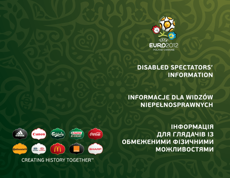 Disabled Spectators’ Information Informacje dla widzów niepełnosprawnych Інформація для глядачів із обмеженими фізичними можливостями Contents | Spis treści | Зміст Useful information 3 Maps6 Przydatne informacje 4 Mapy6 Корисна інформація 5 Карти6 All information is correct at the time of print. Please visit uefa.com for more details. Wszystkie zamieszczone informacje są zgodne ze stanem faktycznym w dniu drukowania broszury. W celu uzyskania dalszych informacji prosimy wejść na stronę uefa.com. Уся інформація є точною на час друку. Більш докладну інформацію ви зможете знайти на сайті uefa.com. Produced by UEFA Events S.A. © UEFA 2012, January 3 At every match seats have been allocated to disabled spectators and one accompanying person. This booklet includes useful information and access maps for spectators who require wheelchair access and for those who are visually or hearing impaired. Audio head-sets for descriptive commentary Spectators who have requested visually impaired category tickets will receive their audio head-sets at their seats, before the match. Companion A companion ticket holder will only be permitted to enter the stadium if escorting a disabled spectator. Parking Disabled spectator ticket holders will require a parking pass to enter the dedicated parking. The pass will be sent separately. It is advisable to arrive at least 2 hours before kick-off (check your ticket for exact time). Questions For any questions related to access for disabled spectators, please refer to UEFA EURO 2012 section on uefa.com, FAQ or send in your questions to the customer service. Updates of all maps will be available on our website. 45 Na każdy mecz przydzielono miejsca dla kibiców niepełnosprawnych oraz jednej osoby towarzyszącej. Ta broszura zawiera przydatne informacje oraz mapy dostępu dla widzów, którzy poruszają się na wózku inwalidzkim oraz dla osób z uszkodzonym wzrokiem lub słuchem. Zestawy słuchawkowe (komentarz audiodeskryptywny) Widzowie, którzy wnioskowali o bilety dla osób z uszkodzonym wzrokiem otrzymają zestawy słuchawkowe przed meczem, po zajęciu miejsc. Osoba towarzysząca Osoba towarzysząca posiadająca bilet będzie mogła wejść na stadion tylko wraz z niepełnosprawnym widzem. Parking W celu uzyskania dostępu do dedykowanego parkingu, osoby posiadające bilet dla widzów niepełnosprawnych będą potrzebowały przepustki parkingowej. Przepustka zostanie przesłana osobno. Prosimy o przybycie co najmniej 2 godziny przed rozpoczęciem meczu (dokładną godzinę rozpoczęcia spotkania prosimy sprawdzić na bilecie). Pytania W celu uzyskania informacji na temat dostępu dla widzów niepełnosprawnych prosimy odwiedzić witrynę uefa.com (zakładka UEFA EURO 2012), dział najczęściej zadawanych pytań (FAQ) lub przesłać pytania do działu obsługi klienta. Aktualizacje wszystkich map będą dostępne na naszej stronie internetowej. На кожен матч було виділено певну кількість місць для вболівальників із обмеженими фізичними можливостями та їхніх супроводжуючих осіб. У цьому буклеті ви знайдете корисну інформацію та карти маршрутів входу на стадіон для глядачів, що пересуваються на інвалідних візках, а також глядачів, що мають вади зору або слуху. Навушники для прослуховування описових коментарів Глядачі, що замовили квитки для вболівальників із вадами зору, зможуть отримати навушники до початку матчу на своїх місцях. Супроводжуюча особа Глядач, що має квиток супроводжуючої особи, може увійти до стадіону лише у разі супроводу вболівальника з обмеженими фізичними можливостями. Паркування Уболівальники, що є власниками квитків для осіб з обмеженими фізичними можливостями, мають пред’явити перепустку на спеціальний паркувальний майданчик. Такі перепустки надсилатимуться окремо. Рекомендуємо приїжджати щонайменше за 2 години до початку матчу (точний час початку матчу зазначено на квитку). Запитання Відповіді на будь-які запитання, пов’язані з доступом глядачів з обмеженими фізичними можливостями на стадіони, ви зможете знайти на сторінці частих питань FAQ у розділі УЄФА ЄВРО 2012 на сайті uefa.com; ви також можете надіслати свої запитання нашій службі підтримки клієнтів. Оновлені версії карт Ви зможете знайти на нашому веб-сайті. 67 0 100 150 200 250m ska iej row Sta Uc zni ow s ka 50 Ma ry na rk iP ol sk iej STADIUM STADION Ża glo wa SECURITY PERIMETER ENTRANCE PARKING PARKING AIRPORT LOTNISKO Poko le ń Le Gda TRAIN ńsk Nar wic ka chii Jan a Ko chanowskiego Gdańsk Stadion BUS AUTOBUS TRAM TRAMWAJ METRO METRO METPO GDANSK GDAŃSK ГДАНСЬК 89 ela ńs ka 0 kowska Marszał szt ka Ju go sło wi a ńs Ka 100 150 200 250m Grunw ska aldzka zyń Byc 50 a sk uń m Ru ka Bułgars SECURITY PERIMETER ENTRANCE Węgo rk