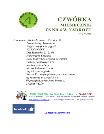 CZWÓRKA MIESIĘCZNIK ZS NR 4 W NADROŻU Nr 37/2016 W numerze: Nadeszła zima…W końcu Poszukiwany krwiodawca Wyjątkowy puchaty gość VII KONCERT Dni Seniorów 21-22.01 Harcerze w Orszaku Losy żołnierza i orędzia polskiego Pokazy pomiarowe TPI Szalone kalambury Strony Łukasza W. c.d. Zapałczane zagadki Marta T. o swym pierwszym scenariuszu Jej radosnej twórczości c.d. III przegląd poezji Jana Pawła II 24 finał WOŚP 1el.facebook.com/4nadro Będziemy Cię pamiętać… Mateusz Serwach kl. II TPS Dla każdego z nas, czy jesteśmy na to gotowi, czy nie, w końcu nadejdzie kres. Nie będzie więcej wschodów słońca, minut, godzin ani dni. Wszystkie zgromadzone przedmiot trafią do kogoś innego. Bogactwo, sława, czy tymczasowa władza staną się nieistotne. Nie będzie ważne co posiadałeś, ani co byłeś winien. Uraza , złość, frustracje i zazdrość w końcu znikną. Ambicje i plany stracą ważność. Sukcesy i porażki, niegdyś tak istotne, także .Nie będzie miało znaczenia skąd przybyłeś, ani po której stronie stałeś na końcu. Znaczenie będzie miało nie to, co kupiłeś, ale to, co zbudowałeś. Nie, co dostałeś , ale co dałeś. Nie to, czego się nauczyłeś, ale czego nauczyłeś innych. Nie to, ile osób znałeś, ale ilu osobom będzie Ciebie brak, gdy odejdziesz. Znaczenia nie będą miały Twoje wspomnienia, lecz wspomnienia żyjące w osobach, które Cię kochały, którym na Tobie zależało. Znaczenie będzie miało na jak długo zostaniesz w pamięci innych, w czyjej pamięci i za co. Pozostaniesz, Mateuszu na zawsze w pamięci całej społeczności Zespołu Szkół Nr 4 w Nadrożu. IX EDYCJA OLIMPIADY LOSY ŻOŁNIERZA I ORĘDZIA POLSKIEGO - "Od Obertyna do Wiednia. Rzeczpospolita Obojga Narodów". Trzech uczniów naszej Szkoły: Adrian Cywiński z kl. III LO, Paweł Kępczyński z kl. III LO, Mateusz Skierkowski z kl. I TG wzięło udział w Etapie rejonowym konkursu "Losy żołnierza i dzieje oręża polskiego w latach 1531-1683. Od Obertyna do Wiednia. Rzeczpospolita Obojga Narodów" w dniu 15 grudnia 2015 roku we Włocławku Dwóch z nich Adrian i Mateusz zakwalifikowali się do etapu wojewódzkiego, który odbędzie się 22 marca 2016 roku. Życzymy Wam powodzenia! Z wielką radością przyłączyliśmy się do wiekiej ogólnopolskiej akcji. Cieszymy się, że zebrana kwota zawiera również nasz finansowy wkład. Nasi harcerze wspierali akcję WOŚP w Rypinie. JEJ RADOSNA TWÓRCZOŚĆ MARTA PORZECZKA KRZAK Uczennica kl. IV technikum budowlanego to od nas odchodzą światełka dusz wznoszą się wysoko wszechświat mają w zasięgu serca ich ostatni zimny dotyk stawia mocno na ziemi ostatnia nauka do końca życia potok łez pokrywa ścieżkę naszego losu oczyszczając z kłamstw i brudów całego półświatka tętnijmy życiem za nich niech odpoczywają w obłokach sfer niebieskich na wieki przeszczęśliwi amen Ze stron fanów poezji i wierszy Łukasza Woźnikowskiego „Ta grupa powstała dla osób, które kochają życie i naturę. I jeśli napiszę bzdurę, to piszcie śmiało, nie będzie mnie bolało. Ważne, żeby czas mijał miło, a po nocach wszystkim Wam się dobrze śniło” - Ł. Woźnikowski III LO Rok 2015 już za nami Może go powspominamy Chwile porażki Chwile chwały Przeszedł do historii Roczek cały Były łzy radości Wizyty wielu gości Wybory prezydenckie Imprezy studenckie Lato nam w kość dawało Słoneczko nas nie omijało Piłkarze na boisku bosko grali Przepustkę do Francji otrzymali To były czasy - które już za nami Rok 2016 - przed Wami Życzę każdemu wszystkiego dobrego w nowym roku. Sukcesów zdrowia i szczęścia i tego co pragnie nasza dusza niech ona daleko rusza Harcerze z naszego Hufca również uczestniczyli w dniu 6.01 2016 roku w Orszaku Trzech Króli w Rypinie ! Od P. Brzezickiej Położenie naszej szkoły w centrum kilkudziesięcioletniego parku dostarcza nam codziennie niezwykłych emocji z powodu wyjątkowych gości. Udało się nam jednego utrwalić na fotografii. Cóż to za gatunek sówki? Kto dokona poprawnej identyfikacji może liczyć na przychylność nauczyciela biologii „Na skrzydłach roztańczonych marzeń…” Pełni talentów uczniowie i absolwenci Zespołu Szkół nr 4 im. Ziemi Dobrzyńskiej w Nadrożu zaprezentowali swoje umiejętności podczas siódmego koncertu dla społeczności powiatu rypińskiego „Na skrzydłach roztańczonych marzeń”. O popularności imprezy w środowisku lokalnym świadczy zapełniona po brzegi gośćmi sala gimnastyczna szkoły. W pierwszej części koncertu zaprezentowano utwory o charakterze refleksyjnym i romantycznym. Chór wykonał m.in. utwór „Wszystko ma swój czas” z repertuaru „Perfectu” i „Na skrzydłach roztańczonych marzeń” Piotra Rubika. W pierwszej części wysłuchano interpretacji utworów : „Nieuchwytna” w wykonaniu Michała Wiśniewskiego, „Dobranoc ,panowie” Joanny Rucińskiej, „Najlepsze dziś wypełni się” Mateusza Wiśniewskiego i „Wybieram Cię” Joanny Koryckiej. Podczas przerwy goście udali się do stołówki szkolnej, gdzie przy filiżance kawy odbyły się spotkania towarzyskie. W drugiej części koncertu publiczność wysłuchała piosenek świątecznych i kolęd. Panująca na sali atmosfera zachęcała do wspólnego śpiewania. Opiekę nad szkolnym chórem sprawuje Jolanta Tofil – Dykowska, słowo mówione przygotowała Milena Sobocińska – Krupska, scenografię opracował zespół nauczycieli przedmiotów zawodowych pod kierunkiem kierownika kształcenia praktycznego Jerzego Kosobuckiego. Występujących na szkolnej scenie solistów, jak i chórzystów wyróżniał profesjonalizm i zaangażowanie. Znane piosenki wykonywane przez młodych artystów nabrały zupełnie nowego wymiaru. Klimat i atmosfera Zespołu Szkół nr 4 w Nadrożu przyczyniają się do stałej obecności absolwentów podczas imprez organizowanych dla środowiska. M. Bednarczuk Pokazy pomiarowe 