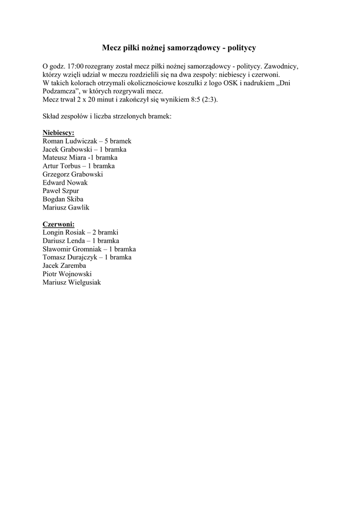 Mecz piłki nożnej samorządowcy - politycy O godz. 17:00 rozegrany został mecz piłki nożnej samorządowcy - politycy. Zawodnicy, którzy wzięli udział w meczu rozdzielili się na dwa zespoły: niebiescy i czerwoni. W takich kolorach otrzymali okolicznościowe koszulki z logo OSK i nadrukiem „Dni Podzamcza”, w których rozgrywali mecz. Mecz trwał 2 x 20 minut i zakończył się wynikiem 8:5 (2:3). Skład zespołów i liczba strzelonych bramek: Niebiescy: Roman Ludwiczak – 5 bramek Jacek Grabowski – 1 bramka Mateusz Miara -1 bramka Artur Torbus – 1 bramka Grzegorz Grabowski Edward Nowak Paweł Szpur Bogdan Skiba Mariusz Gawlik Czerwoni: Longin Rosiak – 2 bramki Dariusz Lenda – 1 bramka Sławomir Gromniak – 1 bramka Tomasz Durajczyk – 1 bramka Jacek Zaremba Piotr Wojnowski Mariusz Wielgusiak