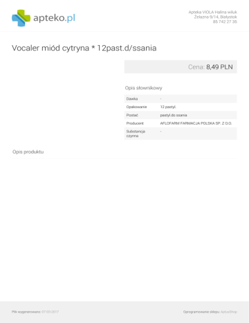 Apteka VIOLA Halina wiluk Żelazna 9/14, Białystok 85 742 27 35 Vocaler miód cytryna * 12past.d/ssania Cena: 8,49 PLN Opis słownikowy Dawka - Opakowanie 12 pastyl. Postać pastyl.do ssania Producent AFLOFARM FARMACJA POLSKA SP. Z O.O. Substancja czynna - Opis produktu Plik wygenerowano: 07-03-2017 Powered by TCPDF (www.tcpdf.org) Oprogramowanie sklepu: AptusShop