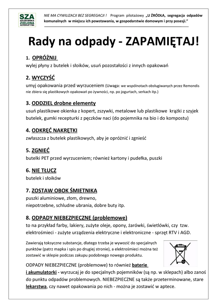 NIE MA CYWILIZACJI BEZ SEGREGACJI ! Program pilotażowy „U ŹRÓDŁA, segregacja odpadów komunalnych w miejscu ich powstawania, w gospodarstwie domowym i przy posesji.” Rady na odpady - ZAPAMIĘTAJ! 1. OPRÓŻNIJ wylej płyny z butelek i słoików, usuń pozostałości z innych opakowań 2. WYCZYŚĆ umyj opakowania przed wyrzuceniem (Uwaga: we wspólnotach obsługiwanych przez Remondis nie zbiera się plastikowych opakowań po żywności, np. po jogurtach, serkach itp.) 3. ODDZIEL drobne elementy usuń plastikowe okienka z kopert, zszywki, metalowe lub plastikowe krążki z szyjek butelek, gumki recepturki z pęczków naci (do pojemnika na bio i do kompostu) 4. ODKRĘĆ NAKRĘTKI zwłaszcza z butelek plastikowych, aby je opróżnić i zgnieść 5. ZGNIEĆ butelki PET przed wyrzuceniem; również kartony i pudełka, puszki 6. NIE TŁUCZ butelek i słoików 7. ZOSTAW OBOK ŚMIETNIKA puszki aluminiowe, złom, drewno, niepotrzebne, schludne ubrania, dobre buty itp. 8. ODPADY NIEBEZPIECZNE (problemowe) to na przykład farby, lakiery, zużyte oleje, opony, żarówki, świetlówki, czy tzw. elektrośmieci - zużyte urządzenia elektryczne i elektroniczne - sprzęt RTV i AGD. Zawierają toksyczne substancje, dlatego trzeba je wywozić do specjalnych punktów (patrz mapka i spis po drugiej stronie), a elektrośmieci można też zostawić w sklepie podczas zakupu podobnego nowego produktu. ODPADY NIEBEZPIECZNE (problemowe) to również baterie i akumulatorki - wyrzucaj je do specjalnych pojemników (są np. w sklepach) albo zanoś do punktu odpadów problemowych. NIEBEZPIECZNE są także przeterminowane, stare lekarstwa, czy nawet opakowania po nich - można je zostawić w aptece. NIE MA CYWILIZACJI BEZ SEGREGACJI ! Program pilotażowy „U ŹRÓDŁA, segregacja odpadów komunalnych w miejscu ich powstawania, w gospodarstwie domowym i przy posesji.” Lokalizacja punktów zbiórki odpadów problemowych w Szczecinie ul. Duńska 14 Warszewo/Arkońskie/Niebuszewo. Od wtorku do piątku Eko-Punkt otwarty w godzinach 8.00-16.00. Wskazówki dojazdu: Skrzyżowanie ulic Duńska, Krasińskiego i Belgijska. Znajduje się vis a vis sklepu NETTO. ul. Dworska (Plac Słowińców) Gumieńce. Od wtorku do piątku Eko-Punkt otwarty od 7.00-15.00. Wskazówki dojazdu: Plac pomiędzy ulicami Wierzbową i Dworską. ul. Gdańska Międzyodrze Od wtorku do piątku Eko-Punkt otwarty 8.00-16.00. Wskazówki dojazdu: Kierując się w stronę Prawobrzeża zjedź za Mostem Długim na Wyspę Pucką przed stacją benzynową. Zjazd na Wyspę Pucką pod Trasą Zamkową. ul. Helska (róg ul. Goleniowskiej) Prawobrzeże/Dąbie Od wtorku do piątku Eko-Punkt otwarty od 9.00-17.00. Wskazówki dojazdu: 100 metrów za sklepem LIDL. ul.Firlika 31 (Drzetowo-Grabowo) Od wtorku do piątku Eko-Punkt otwarty od 8.00-16.00. Wskazówki dojazdu: Znajduje się przy wjeździe do Stoczni Szczecińskiej. Znajduje się vis a vis sklepu NETTO. Uważaj na ruch jednokierunkowy! W PONIEDZIAŁKI wszystkie punkty pracują od godziny 10.00 do 18.00! • Istnieje też możliwość odpłatnego oddania odpadów niebezpiecznych do unieszkodliwienia na terenie Spółki Remondis Szczecin, przy ul. Żołnierskiej 56.