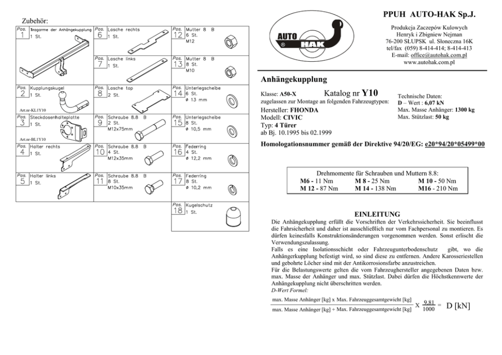 PPUH AUTO-HAK Sp.J. Zubehör: Produkcja Zaczepów Kulowych Henryk i Zbigniew Nejman 76-200 SŁUPSK ul. Słoneczna 16K tel/fax (059) 8-414-414; 8-414-413 E-mail: [email protected] www.autohak.com.pl Anhängekupplung Y10 Klasse: A50-X Katalog nr zugelassen zur Montage an folgenden Fahrzeugtypen: Technische Daten: D – Wert : 6,07 kN Max. Masse Anhänger: 1300 kg Max. Stützlast: 50 kg Art.nr-KL1Y10 Hersteller: FHONDA Modell: CIVIC Typ: 4 Türer ab Bj. 10.1995 bis 02.1999 Art.nr-BL1Y10 Homologationsnummer gemäß der Direktive 94/20/EG: e20*94/20*05499*00 Drehmomente für Schrauben und Muttern 8.8: M6 - 11 Nm M 8 - 25 Nm M 10 - 50 Nm M 12 - 87 Nm M 14 - 138 Nm M16 - 210 Nm EINLEITUNG Die Anhängekupplung erfüllt die Vorschriften der Verkehrssicherheit. Sie beeinflusst die Fahrsicherheit und daher ist ausschließlich nur vom Fachpersonal zu montieren. Es dürfen keinesfalls Konstruktionsänderungen vorgenommen werden. Sonst erlischt die Verwendungszulassung. Falls es eine Isolationsschicht oder Fahrzeugunterbodenschutz gibt, wo die Anhängerkupplung befestigt wird, so sind diese zu entfernen. Andere Karosseriestellen und gebohrte Löcher sind mit der Antikorrosionsfarbe anzustreichen. Für die Belastungswerte gelten die vom Fahrzeughersteller angegebenen Daten bzw. max. Masse der Anhänger und max. Stützlast. Dabei dürfen die Höchstkennwerte der Anhängekupplung nicht überschritten werden. D-Wert Formel: max. Masse Anhänger [kg] x Max. Fahrzeuggesamtgewicht [kg] max. Masse Anhänger [kg] + Max. Fahrzeuggesamtgewicht [kg] X 9,81 = 1000 D [kN] MONTAGE - und BETRIEBSANLEITUNG DER ANHÄNGEKUPPLUNG Anbauanleitung Die Löcher im Fahrzeug von unten, wie auf der Zeichnung gezeigt, markieren, dann die Löcher mit dem Bohrer ø11mm sorgfältig bohren (man bohrt an den Schweißstellen der Längsträgern an dem Fahrzeugboden). 2. Die obige Lachen (Pos.8) auf die ausgeführten Löcher im Kofferraum legen. 3. Die Seitenhalter (Pos. 4 u. 5) von unten ans Fahrzeug legen und durch die großen Laschen (Pos. 4 u. 6) die Schrauben M10x35mm (Pos.10) (siehe Zeichnung 1) verschrauben. 4. Die Laschen (Pos.5) von unten ans Fahrzeug legen und durch die großen Laschen (Pos. 8) die Schrauben M10x35mm (Pos.10) verschrauben. 5. Die Laschen (Pos. 6 u. 7) an das Fahrzeug von unten legen, durch die Löcher (Pos.B) und die großen Laschen (Pos.8) die Schrauben M10x35mm (Pos.10) verschrauben. 6. Die Tragarme der Anhängerkupplung (Pos.1) mit den Schrauben M12x35mm (Pos.9) an den montierten Halter durch die Löcher (Pos. C) verschrauben. 7. Alle Schrauben gemäß den Angaben in der Tabelle verschrauben. 8. Die Stoßstange und innere Verkleidungen des Kofferraums montieren. 9. Die Kupplungskugel (Pos.2) und den der Steckdosenhalter (Pos.3) an den montierten Tragarmen der Anhängerkupplung mit den mitgelieferten Schrauben M12x75mm (Pos.9) verschrauben. 10. Die Elektroinstallation gemäß der Bedienungsanleitung des Herstellers anschließen. 11. Falls nötig, den durch die Montage beschädigten Farbanstrich an der Anhängerkupplung ausbessern. B 8 B A 6 11 A 4 8 7 10 A 1 9 B 11 5 C 3 2 der Längsträger 10 11 Die Anhängekupplung (Katalognummer Y10) ist für folgende Fahrzeugtypen zugelassen: HONDA CIVIC 4 Türer, ab Bj. 10.1995 bis 02.1999, dient zum ziehen der Anhänger mit der Gesamtlast von 1300 kg und der Kugelstützlast von max.50 kg. Das hintere Teil des Fahrzeuges der Längsträger 1. 79 5 Zeichnung 2.Blick auf das Fahrzeug von unten, nach der Demontage der Stoßstange ACHTUNG VON DEM HERSTELLER Die Zuverlässigkeit der Anhängekupplung ist jedoch auch von der ordnungsgemäßen Montage und der richtigen Nutzung abhängig. Daher werden Sie gebeten, sorgfältig die folgende Montageanleitung zu lesen und sich an die entsprechenden Anweisungen zu beachten. Die Anhängekupplung muss an den vom Fahrzeughersteller vorgeschriebenen Befestigungsstellen montiert werden. Nach dem Anbau der Anhängekupplung sind die nationalen Vorschriften zur Anbauabnahme und zur Änderung der Fahrzeugpapiere zu beachten. Das Fahrzeug sollte mit seitlichen Blinkern und Rückspiegeln, deren Abstand mindestens der Anhängerbreite entspricht, ausgestattet werden. Alle Befestigungsschrauben sind nach ca. 1 000 km Anhängerbetrieb zu prüfen und nachzuziehen. Die Kugel der Anhängekupplung ist sauber zu halten und zu fetten. (D) (CZ) (F) (GB) (PL) (SK) Der Freiraum nach Anhang VII, Abbildung 30 der Richtlinie 94/20/EG ist zu gewährleisten. Volný prostor ve smyslu Přílohy VII,obr. 30 Směrnice č. 94/20/EG musí být zaručen. L´espace libre doit être garanti conformément à ľannexe VII, illustracion 30 de la directive 94/20/ CE. The clearance specified in apendix VII, diagram 30 of guideline 94/20/EC must be guaranteed. Zagwarantować swobodną przestrzeń zgodnie z załącznikiem VII, rysunek 30 dyrektywy 94/20/CE. Volný priestor v zmysle Prílohy VII, obr. 30 Smernice 94/20/EC musí byť zaručená. (D) (CZ) (F) (GB) (PL) (SK) * bei zulässigem Gesamtgewicht des Fahrzeuges * při celkové přípustné hmotnosti vozidla * pour poids total en charge autorizé du véhicule * at gross vehicle weight rating * przy dopuszczalnym ciężarze całkowitym pojazdu * pri celkovej prípustnej hmotnosti vozidla FITTING INSTRUCTION The instruction of the assembly B Left directional lights Rear fog lights Ground Right directional lights Right side parking lights Stoplights Left side parking lights 8 B A 6 11 A 4 8 7 10 A 1 10. Connect electric wires of 7-poles socket according to the instruction of the car. (Recommend to make at authorized service station) 11. Complete paint layer damaged during installation. 9 B 11 5 10 C 3 1. Disassemble rear bumper and covers inside trunk. 2. Underneath the car mark points according to figure 1. Next drill holes using bit ø11mm, make very carefully. 3. Inside the trunk put suitable upper fish-plates (pos.8). 4. Underneath the car put side brackets (pos. 4 and 5) and through holes (pos. A) and fishplates (pos. 8) f