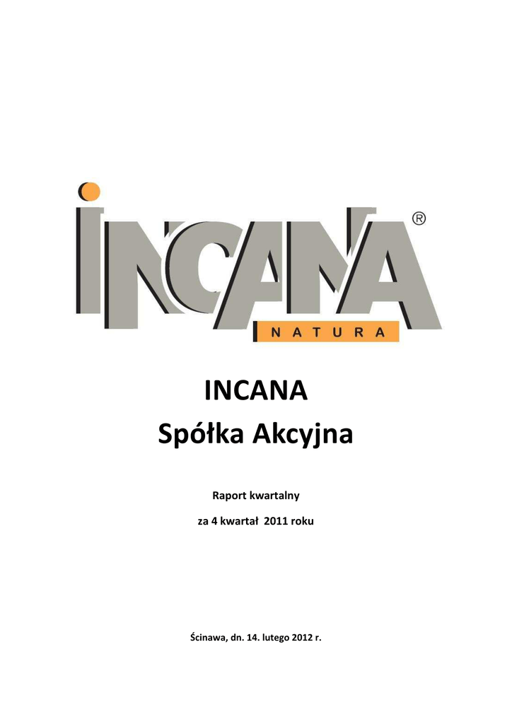INCANA Spółka Akcyjna Raport kwartalny za 4 kwartał 2011 roku Ścinawa, dn. 14. lutego 2012 r. INCANA Spółka Akcyjna SPIS TREŚCI 1. 2. INFORMACJE OGÓLNE ..................................................................................................................... 3 1.1 Podstawowe dane o Spółce .................................................................................................... 3 1.2 Organy Emitenta...................................................................................................................... 3 1.3 Struktura akcjonariatu ............................................................................................................. 4 DANE FINANSOWE .......................................................................................................................... 5 2.1 Wybrane dane finansowe z bilansu ........................................................................................ 5 2.2 Wybrane dane finansowe z rachunku zysków i strat .............................................................. 5 3. KOMENTARZ ZARZĄDU NA TEMAT CZYNNIKÓW I ZDARZEŃ, KTÓRE MIAŁY WPŁYW NA OSIĄGNIĘTE WYNIKI FINANSOWE ........................................................................................................... 6 4. INFORMACJE ZARZĄDU NA TEMAT AKTYWNOŚCI, JAKĄ W OKRESIE OBJĘTYM RAPORTEM EMITENT PODEJMOWAŁ W OBSZARZE ROZWOJU PROWADZONEJ DZIAŁALNOŚCI ............................... 8 5. STANOWISKO ZARZĄDU ODNOŚNIE MOŻLIWOŚCI ZREALIZOWANIA PUBLIKOWANYCH PROGNOZ WYNIKÓW NA 2011 ROK W ŚWIETLE WYNIKÓW ZAPREZENTOWANYCH W RAPORCIE ZA IV KWARTAŁ 2011 ......................................................................................................................................................... 8 6. OŚWIADCZENIE ZARZĄDU ............................................................................................................... 9 RAPORT ZA IV KWARTAŁ 2011 R 2|Strona INCANA Spółka Akcyjna 1. INFORMACJE OGÓLNE 1.1 Podstawowe dane o Spółce Pełna nazwa Siedziba Telefon: Faks: Adres poczty elektronicznej: Adres strony internetowej: Podstawowy przedmiot działalności Kapitał zakładowy Organ prowadzący rejestr, numer KRS NIP: REGON: Czas trwania jednostki INCANA Spółka Akcyjna ul. Witosa 10 59-330 Ścinawa woj. dolnośląskie +48 76 84 37 080 +48 76 84 37 317 [email protected] www.incana.pl 23.61Z Produkcja wyrobów budowlanych z betonu Kapitał zakładowy wynosi 1.097.680,00 zł i dzieli sie na: 3.650.000 akcji imiennych serii A 3.650.000 akcji na okaziciela serii B 2.306.800 akcji na okaziciela serii C 1.370.000 akcji na okaziciela serii D Sad Rejonowy dla Wrocławia-Fabrycznej we Wrocławiu, IX Wydział Gospodarczy Krajowego Rejestru Sadowego, numer KRS: 0000311708 547-200-74-43 072917202 Nieograniczony 1.2 Organy Emitenta W skład Zarządu INCANA S.A. na dzień 31 grudnia 2011 r. oraz na dzień sporządzenia niniejszego raportu wchodzi: • Dariusz Suchy – Prezes Zarządu W skład Rady Nadzorczej INCANA S.A. na dzień 31 grudnia 2011 r. oraz na dzień sporządzenia niniejszego raportu wchodzą: • Ryszard Bartosik – Przewodniczący Rady Nadzorczej • Krystyna Bartosik– Wiceprzewodniczący Rady Nadzorczej • Klaudiusz Bartosik – Członek Rady Nadzorczej • Marek Bartosik – Członek Rady Nadzorczej • Sabina Nalborczyk– Członek Rady Nadzorczej • Roberto Grosso – Członek Rady Nadzorczej RAPORT ZA IV KWARTAŁ 2011 R 3|Strona INCANA Spółka Akcyjna W dniu 10 października 2011 r. miały miejsce następujące zmiany w składzie Rady Nadzorczej: - odwołana ze składu Rady Nadzorczej została Pani Katarzyna Dębowską, - powołany do składu Rady Nadzorczej został Pan Marek Bartosik. 1.3 Struktura akcjonariatu Poniższa tabela przedstawia strukturę akcjonariatu ze szczegółowym wykazem akcjonariuszy posiadających co najmniej 5% udziału w głosach na Walnym Zgromadzeniu Spółki. (zgodnie z zawiadomieniami akcjonariuszy z art. 69 Ustawy o Ofercie Publicznej) Tabela 1 Struktura akcjonariatu (według stanu na dzień 14.02.2012 r.) Akcjonariusz Liczba akcji Udział w KZ Liczba głosów Udział w ogólnej liczbie głosów Ryszard Bartosik 2 641 870 24,07% 2 641 870 18,06% Krystyna Bartosik 2 007 500 18,29% 4 015 000 27,45% Roberto Grosso 1 825 000 16,63% 2 737 500 18,72% Dariusz Suchy 1 690 680 15,40% 2 420 680 16,55% WDM Capital S.A.* 747 900 6,81% 747 900 5,11% Pozostali 2 063 850 18,80% 2 063 850 14,11% Suma 10 976 800 100,00% 14 626 800 100,00% *z podmiotami zależnymi RAPORT ZA IV KWARTAŁ 2011 R 4|Strona INCANA Spółka Akcyjna 2. DANE FINANSOWE Spółka prezentuje wybrane dane finansowe za IV kwartał 2011 roku wraz z danymi porównywalnymi za IV kwartał 2010 r. oraz dane narastające za okres od 1 stycznia 2011 r. do 31 grudnia 2011 r. wraz z danymi porównywalnymi za analogiczny okres roku poprzedniego. 2.1 Wybrane dane finansowe z bilansu Tabela 2 Wybrane dane z bilansu Spółki (w zł) Wyszczególnienie 31.12.2011 r. 31.12.2010 r. 30.09.2011 r. 30.09.2010 r. Kapitał własny 4 771 904,26 3 428 898,77 4 717 764,58 3 098 101,48 Kapitał podstawowy 1 097 680,00 960 680,00 1 097 680,00 730 000,00 0,00 0,00 0,00 0,00 1 981 588,78 1 522 051,16 2 162 600,20 1 809 738,33 0,00 0,00 0,00 0,00 227 476,62 413 295,85 291 778,75 148 910,77 227 476,62 413 295,85 291 778,75 148 910,77 0,00 164 971,94 57 934,50 424 273,14 2 831 274,22 3 133 293,01 2 742 015,44 2 961 829,80 Należności długoterminowe Należności krótkoterminowe Inwestycje długoterminowe Inwestycje krótkoterminowe Środki pieniężne i inne aktywa pieniężne Zobowiązania długoterminowe Zobowiązania krótkoterminowe 2.2 Wybrane dane finansowe z rachunku zysków i strat Tabela 3 Wybrane dane z rachunku zysków i strat Spółki (w zł) 01.10.2011- 01.10.2010- 01.01.2011- 01.01.2010- 31.12.2011 r. 31.12.2010 r. 31.12.2011 r. 31.12.2010 r. 2 219 285,52 1 556 211,72 9 350 850,51 6 532 843,25 Wyszczególnienie Przycho
