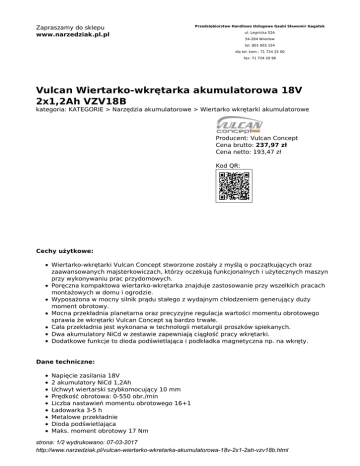 Zapraszamy do sklepu www.narzedziak.pl.pl Przedsiębiorstwo Handlowo Usługowe Gaabi Sławomir Gagatek ul. Legnicka 52A 54-204 Wrocław tel. 801 003 154 dla tel. kom.: 71 724 25 00 fax: 71 724 20 96 Vulcan Wiertarko-wkrętarka akumulatorowa 18V 2x1,2Ah VZV18B kategoria: KATEGORIE > Narzędzia akumulatorowe > Wiertarko wkrętarki akumulatorowe Producent: Vulcan Concept Cena brutto: 237,97 zł Cena netto: 193,47 zł Kod QR: Cechy użytkowe: Wiertarko-wkrętarki Vulcan Concept stworzone zostały z myślą o początkujących oraz zaawansowanych majsterkowiczach, którzy oczekują funkcjonalnych i użytecznych maszyn przy wykonywaniu prac przydomowych. Poręczna kompaktowa wiertarko-wkrętarka znajduje zastosowanie przy wszelkich pracach montażowych w domu i ogrodzie. Wyposażona w mocny silnik prądu stałego z wydajnym chłodzeniem generujący duży moment obrotowy. Mocna przekładnia planetarna oraz precyzyjne regulacja wartości momentu obrotowego sprawia że wkrętarki Vulcan Concept są bardzo trwałe. Cała przekładnia jest wykonana w technologii metalurgii proszków spiekanych. Dwa akumulatory NiCd w zestawie zapewniają ciągłość pracy wkrętarki. Dodatkowe funkcje to dioda podświetlająca i podkładka magnetyczna np. na wkręty. Dane techniczne: Napięcie zasilania 18V 2 akumulatory NiCd 1,2Ah Uchwyt wiertarski szybkomocujący 10 mm Prędkość obrotowa: 0-550 obr./min Liczba nastawień momentu obrotowego 16+1 Ładowarka 3-5 h Metalowe przekładnie Dioda podświetlająca Maks. moment obrotowy 17 Nm strona: 1/2 wydrukowano: 07-03-2017 http://www.narzedziak.pl/vulcan-wiertarko-wkretarka-akumulatorowa-18v-2x1-2ah-vzv18b.html strona: 2/2 wydrukowano: 07-03-2017 http://www.narzedziak.pl/vulcan-wiertarko-wkretarka-akumulatorowa-18v-2x1-2ah-vzv18b.html