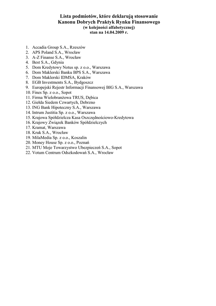 Lista podmiotów, które deklarują stosowanie Kanonu Dobrych Praktyk Rynku Finansowego (w kolejności alfabetycznej) stan na 14.04.2009 r. 1. Accadia Group S.A., Rzeszów 2. APS Poland S.A., Wrocław 3. A-Z Finanse S.A., Wrocław 4. Best S.A., Gdynia 5. Dom Kredytowy Notus sp. z o.o., Warszawa 6. Dom Maklerski Banku BPS S.A., Warszawa 7. Dom Maklerski IDMSA, Kraków 8. EGB Investments S.A., Bydgoszcz 9. Europejski Rejestr Informacji Finansowej BIG S.A., Warszawa 10. Fines Sp. z o.o., Sopot 11. Firma WielobranŜowa TRUS, Dębica 12. Giełda Siedem Czwartych, Debrzno 13. ING Bank Hipoteczny S.A., Warszawa 14. Intrum Justitia Sp. z o.o., Warszawa 15. Krajowa Spółdzielcza Kasa Oszczędnościowo-Kredytowa 16. Krajowy Związek Banków Spółdzielczych 17. Kramat, Warszawa 18. Kruk S.A., Wrocław 19. MilaMedia Sp. z o.o., Koszalin 20. Money House Sp. z o.o., Poznań 21. MTU Moje Towarzystwo Ubezpieczeń S.A., Sopot 22. Votum Centrum Odszkodowań S.A., Wrocław