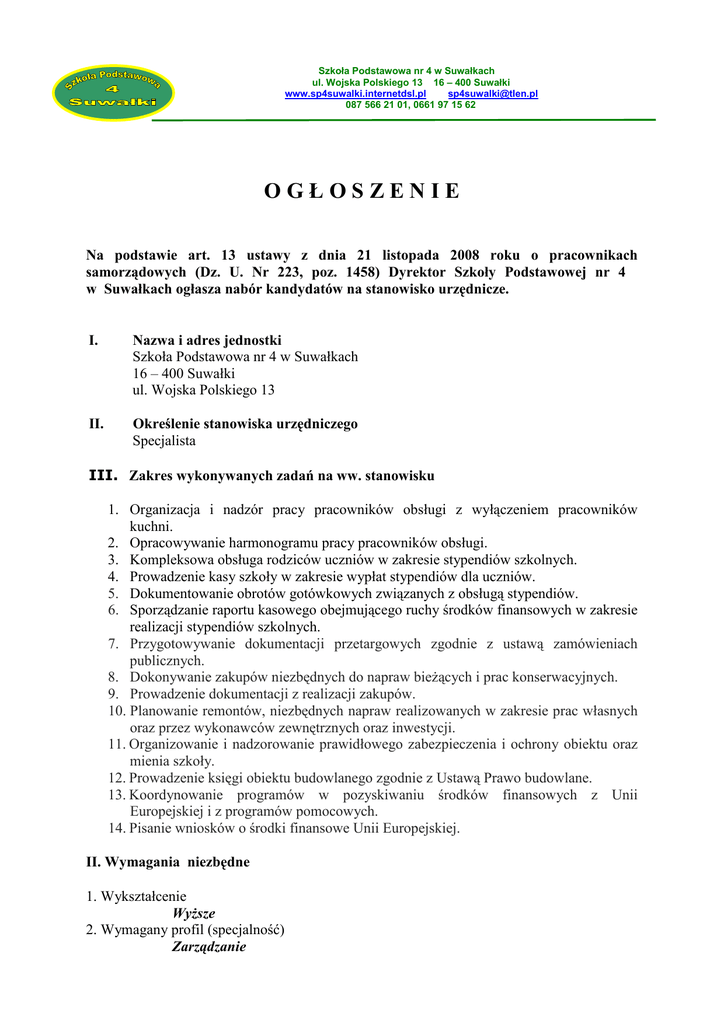 Szkoła Podstawowa nr 4 w Suwałkach ul. Wojska Polskiego 13 16 – 400 Suwałki www.sp4suwalki.internetdsl.pl [email protected] 087 566 21 01, 0661 97 15 62 OGŁOSZENIE Na podstawie art. 13 ustawy z dnia 21 listopada 2008 roku o pracownikach samorządowych (Dz. U. Nr 223, poz. 1458) Dyrektor Szkoły Podstawowej nr 4 w Suwałkach ogłasza nabór kandydatów na stanowisko urzędnicze. I. Nazwa i adres jednostki Szkoła Podstawowa nr 4 w Suwałkach 16 – 400 Suwałki ul. Wojska Polskiego 13 II. Określenie stanowiska urzędniczego Specjalista III. Zakres wykonywanych zadań na ww. stanowisku 1. Organizacja i nadzór pracy pracowników obsługi z wyłączeniem pracowników kuchni. 2. Opracowywanie harmonogramu pracy pracowników obsługi. 3. Kompleksowa obsługa rodziców uczniów w zakresie stypendiów szkolnych. 4. Prowadzenie kasy szkoły w zakresie wypłat stypendiów dla uczniów. 5. Dokumentowanie obrotów gotówkowych związanych z obsługą stypendiów. 6. Sporządzanie raportu kasowego obejmującego ruchy środków finansowych w zakresie realizacji stypendiów szkolnych. 7. Przygotowywanie dokumentacji przetargowych zgodnie z ustawą zamówieniach publicznych. 8. Dokonywanie zakupów niezbędnych do napraw bieŜących i prac konserwacyjnych. 9. Prowadzenie dokumentacji z realizacji zakupów. 10. Planowanie remontów, niezbędnych napraw realizowanych w zakresie prac własnych oraz przez wykonawców zewnętrznych oraz inwestycji. 11. Organizowanie i nadzorowanie prawidłowego zabezpieczenia i ochrony obiektu oraz mienia szkoły. 12. Prowadzenie księgi obiektu budowlanego zgodnie z Ustawą Prawo budowlane. 13. Koordynowanie programów w pozyskiwaniu środków finansowych z Unii Europejskiej i z programów pomocowych. 14. Pisanie wniosków o środki finansowe Unii Europejskiej. II. Wymagania niezbędne 1. Wykształcenie WyŜsze 2. Wymagany profil (specjalność) Zarządzanie 3. Wykształcenie uzupełniające Techniczne 3. Obligatoryjne uprawnienia Pełna zdolność do czynności prawnych i korzystania pełni z praw publicznych. Stan zdrowia pozwalający na zatrudnienie na ww. stanowisku. Nieposzlakowana opinia. Niekaralność za przestępstwa popełnione umyślnie. 4. Doświadczenie zawodowe Praca na stanowisku administracyjny – min.3 lat. Praca na stanowisku kierowniczym – min. 1 rok. 5. Predyspozycje osobowościowe Samodzielność, odpowiedzialność, systematyczność, sumienność, dyspozycyjność, wysoka kultura osobista, umiejętność pracy w zespole. 6. Umiejętności zawodowe Umiejętność obsługi komputera z systemem operacyjnym Windows XP/Vista. Znajomość programów komputerowych: Microsoft Word, Excel, Power Point, Outlook. Dobra znajomość Internetu. Znajomość Kodeksu pracy, Ustawy o systemie oświaty, Ustawy o ochronie danych osobowych, Ustawy Prawo budowlane, Ustawy o pomocy społecznej. Umiejętność kierowania ludźmi. III. Wymagane dokumenty i oświadczenia 1. Uwierzytelniona kopia dyplomu ukończenia studiów wyŜszych i szkoły średniej technicznej oraz innych form doskonalenia zawodowego. 2. Kopia świadectwa pracy potwierdzającego zatrudnienie na stanowisku administracyjnym lub zaświadczenie o aktualnej pracy na ww. stanowisku. 3. CV i list motywacyjny. 4. Kserokopie dowodu osobistego. 5. Aktualne zaświadczenie lekarskie o braku przeciwwskazań do pracy na stanowisku Specjalista. 6. Oświadczenie o korzystaniu z pełni praw publicznych. 7. Opinia z poprzedniego miejsca pracy. 8. Zaświadczenie kandydata o niekaralności za przestępstwo popełnione umyślnie. 9. Oświadczenie o wyraŜeniu zgody na przetwarzanie danych osobowych zawartych w ofercie pracy dla potrzeb dokonania naboru pracowników, zgodnie z ustawą z dnia 29 sierpnia 1997r. o ochronie danych osobowych (DZ.U. z 2002 r. Nr 101 poz.926 z późniejszymi zmianami) INNE INFORMACJE 1. Oferty z wymaganymi dokumentami naleŜy składać w Sekretariacie Szkoły Podstawowej nr 4 w Suwałkach 16 – 400 Suwałki ul. Wojska Polskiego 13, w zamkniętych kopertach z adresem i numerem telefonu kontaktowego składającego ofertę wraz z dopiskiem „nabór na stanowisko Specjalisty”. Termin składania ofert do dnia 18 marca 2009 roku w godzinach pracy sekretariatu od 700-1500. 2. Dodatkowych informacji w sprawie zatrudnienia udziela p. Beata Szpot tel. 0875662101, 0875630402. 3. Oferty, które wpłyną do szkoły po wyŜej wymienionym terminie nie będą rozpatrywane. 4. Nabór na wolne stanowisko urzędnicze prowadzony będzie w dwóch etapach. etap I: przeprowadzenie analizy formalnej złoŜonych przez kandydata dokumentów etap II: przeprowadzeniu rozmowy kwalifikacyjnej w przypadku kandydatów spełniających wymagania formalne. 5. O terminie i miejscu rozmowy kwalifikacyjnej kandydaci zostaną powiadomieni indywidualnie. 6. Informacja o wyniku naboru będzie umieszczana na stronie internetowej Biuletynu Informacji Publicznej Urzędu Miejskiego w Suwałkach oraz na tablicach informacyjnych Urzędu Miejskiego w Suwałkach i w Szkole Podstawowej nr 4 w Suwałkach. Dyrektor Szkoły Podstawowej nr 4 w Suwałkach mgr Jolanta Nowakowska Suwałki, 4 marca 2009 roku
