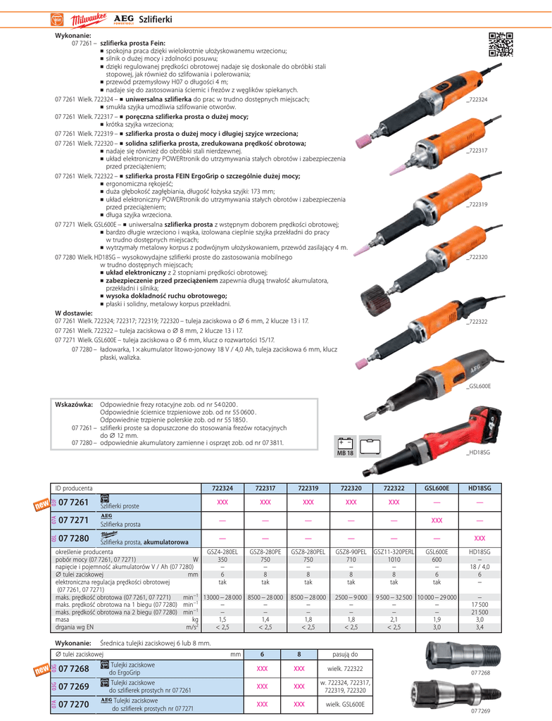 Szlifierki Wykonanie: 07 7261 – szlifierka prosta Fein: spokojna praca dzięki wielokrotnie ułożyskowanemu wrzecionu; silnik o dużej mocy i zdolności posuwu; dzięki regulowanej prędkości obrotowej nadaje się doskonale do obróbki stali stopowej, jak również do szlifowania i polerowania; przewód przemysłowy H07 o długości 4 m; nadaje się do zastosowania ściernic i frezów z węglików spiekanych. 07 7261 Wielk. 722324 – uniwersalna szlifierka do prac w trudno dostępnych miejscach; smukła szyjka umożliwia szlifowanie otworów. 07 7261 Wielk. 722317 – poręczna szlifierka prosta o dużej mocy; krótka szyjka wrzeciona; 07 7261 Wielk. 722319 – szlifierka prosta o dużej mocy i długiej szyjce wrzeciona; 07 7261 Wielk. 722320 – solidna szlifierka prosta, zredukowana prędkość obrotowa; nadaje się również do obróbki stali nierdzewnej. układ elektroniczny POWERtronik do utrzymywania stałych obrotów i zabezpieczenia przed przeciążeniem; 07 7261 Wielk. 722322 – szlifierka prosta FEIN ErgoGrip o szczególnie dużej mocy; ergonomiczna rękojeść; duża głębokość zagłębiania, długość łożyska szyjki: 173 mm; układ elektroniczny POWERtronik do utrzymywania stałych obrotów i zabezpieczenia przed przeciążeniem; długa szyjka wrzeciona. 07 7271 Wielk. GSL600E – uniwersalna szlifierka prosta z wstępnym doborem prędkości obrotowej; bardzo długie wrzeciono i wąska, izolowana cieplnie szyjka przekładni do pracy w trudno dostępnych miejscach; wytrzymały metalowy korpus z podwójnym ułożyskowaniem, przewód zasilający 4 m. 07 7280 Wielk. HD18SG – wysokowydajne szlifierki proste do zastosowania mobilnego w trudno dostępnych miejscach; układ elektroniczny z 2 stopniami prędkości obrotowej; zabezpieczenie przed przeciążeniem zapewnia długą trwałość akumulatora, przekładni i silnika; wysoka dokładność ruchu obrotowego; płaski i solidny, metalowy korpus przekładni. W dostawie: 07 7261 Wielk. 722324; 722317; 722319; 722320 – tuleja zaciskowa o ⌀ 6 mm, 2 klucze 13 i 17. 07 7261 Wielk. 722322 – tuleja zaciskowa o ⌀ 8 mm, 2 klucze 13 i 17. 07 7271 Wielk. GSL600E – tuleja zaciskowa o ⌀ 6 mm, klucz o rozwartości 15/17. 07 7280 – ładowarka, 1×akumulator litowo-jonowy 18 V / 4,0 Ah, tuleja zaciskowa 6 mm, klucz płaski, walizka. _722324 _722317 _722319 _722320 _722322 _GSL600E Wskazówka: Odpowiednie frezy rotacyjne zob. od nr 54 0200 . Odpowiednie ściernice trzpieniowe zob. od nr 55 0600 . Odpowiednie trzpienie polerskie zob. od nr 551850 . 07 7261 – szlifierki proste sa dopuszczone do stosowania frezów rotacyjnych do ⌀ 12 mm. 07 7280 – odpowiednie akumulatory zamienne i osprzęt zob. od nr 073811. MB 18 722317 722319 722320 722322 GSL600E HD18SG 03F 722324 07 7261 Szlifierki proste XXX XXX XXX XXX XXX — — 07A ID producenta _HD18SG 07 7271 Szlifierka prosta — — — — — XXX — — — — — XXX GSL600E 600 − 6 tak HD18SG − 18 / 4,0 6 − 07 7280 03L — — Szlifierka prosta, akumulatorowa GSZ4-280EL GSZ8-280PE określenie producenta pobór mocy (07 7261, 07 7271) W 350 750 napięcie i pojemność akumulatorów V / Ah (07 7280) − − ⌀ tulei zaciskowej mm 6 8 elektroniczna regulacja prędkości obrotowej tak tak (07 7261, 07 7271) maks. prędkość obrotowa (07 7261, 07 7271) min−1 13000 − 28 000 8500 − 28 000 − − maks. prędkość obrotowa na 1 biegu (07 7280) min−1 − − maks. prędkość obrotowa na 2 biegu (07 7280) min−1 masa kg 1,5 1,4 < 2,5 < 2,5 drgania wg EN m/s2 Wykonanie: 07A 03G 03G 07 7269 07 7270 GSZ8-90PEL GSZ11-320PERL 710 1010 − − 8 8 tak tak 8500 − 28 000 − − 1,8 < 2,5 2500 − 9 000 − − 1,8 < 2,5 9 500 − 32 500 10 000 − 29 000 − − − − 2,1 1,9 < 2,5 3,0 − 17 500 21 500 3,0 3,4 Średnica tulejki zaciskowej 6 lub 8 mm. ⌀ tulei zaciskowej 07 7268 GSZ8-280PEL 750 − 8 tak mm Tulejki zaciskowe do ErgoGrip Tulejki zaciskowe do szlifierek prostych nr 077261 Tulejki zaciskowe do szlifierek prostych nr 077271 6 8 pasują do XXX XXX wielk. 722322 XXX XXX w. 722324, 722317, 722319, 722320 XXX XXX wielk. GSL600E 07 7268 07 7269