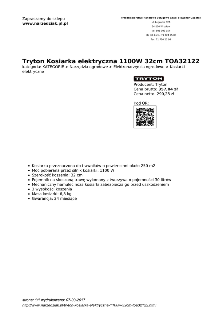 Zapraszamy do sklepu www.narzedziak.pl.pl Przedsiębiorstwo Handlowo Usługowe Gaabi Sławomir Gagatek ul. Legnicka 52A 54-204 Wrocław tel. 801 003 154 dla tel. kom.: 71 724 25 00 fax: 71 724 20 96 Tryton Kosiarka elektryczna 1100W 32cm TOA32122 kategoria: KATEGORIE > Narzędzia ogrodowe > Elektronarzędzia ogrodowe > Kosiarki elektryczne Producent: Tryton Cena brutto: 357,04 zł Cena netto: 290,28 zł Kod QR: Kosiarka przeznaczona do trawników o powierzchni około 250 m2 Moc pobierana przez silnik kosiarki: 1100 W Szerokość koszenia: 32 cm Pojemnik na skoszoną trawę wykonany z tworzywa o pojemności 30 litrów Mechaniczny hamulec noża kosiarki zabezpiecza go przed uszkodzeniem 3 wysokości koszenia Masa kosiarki: 6,8 kg Gwarancja: 24 miesiące strona: 1/1 wydrukowano: 07-03-2017 http://www.narzedziak.pl/tryton-kosiarka-elektryczna-1100w-32cm-toa32122.html