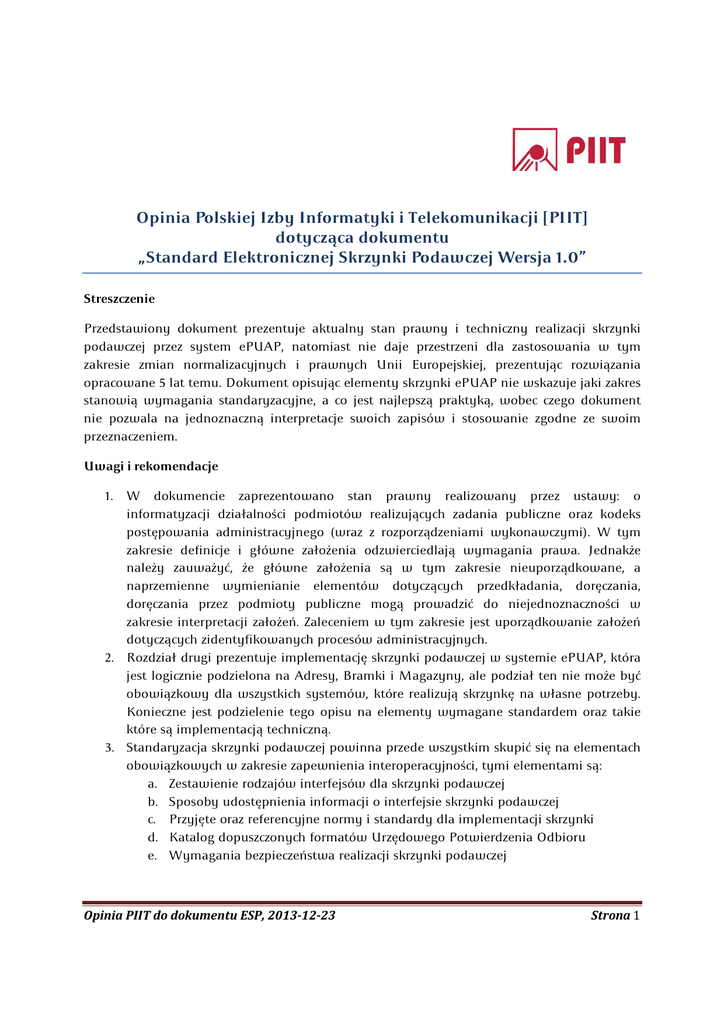 Opinia Polskiej Izby Informatyki i Telekomunikacji [PIIT] dotycząca dokumentu „Standard Elektronicznej Skrzynki Podawczej Wersja 1.0” Streszczenie Przedstawiony dokument prezentuje aktualny stan prawny i techniczny realizacji skrzynki podawczej przez system ePUAP, natomiast nie daje przestrzeni dla zastosowania w tym zakresie zmian normalizacyjnych i prawnych Unii Europejskiej, prezentując rozwiązania opracowane 5 lat temu. Dokument opisując elementy skrzynki ePUAP nie wskazuje jaki zakres stanowią wymagania standaryzacyjne, a co jest najlepszą praktyką, wobec czego dokument nie pozwala na jednoznaczną interpretacje swoich zapisów i stosowanie zgodne ze swoim przeznaczeniem. Uwagi i rekomendacje 1. W dokumencie zaprezentowano stan prawny realizowany przez ustawy: o informatyzacji działalności podmiotów realizujących zadania publiczne oraz kodeks postępowania administracyjnego (wraz z rozporządzeniami wykonawczymi). W tym zakresie definicje i główne założenia odzwierciedlają wymagania prawa. Jednakże należy zauważyć, że główne założenia są w tym zakresie nieuporządkowane, a naprzemienne wymienianie elementów dotyczących przedkładania, doręczania, doręczania przez podmioty publiczne mogą prowadzić do niejednoznaczności w zakresie interpretacji założeń. Zaleceniem w tym zakresie jest uporządkowanie założeń dotyczących zidentyfikowanych procesów administracyjnych. 2. Rozdział drugi prezentuje implementację skrzynki podawczej w systemie ePUAP, która jest logicznie podzielona na Adresy, Bramki i Magazyny, ale podział ten nie może być obowiązkowy dla wszystkich systemów, które realizują skrzynkę na własne potrzeby. Konieczne jest podzielenie tego opisu na elementy wymagane standardem oraz takie które są implementacją techniczną. 3. Standaryzacja skrzynki podawczej powinna przede wszystkim skupić się na elementach obowiązkowych w zakresie zapewnienia interoperacyjności, tymi elementami są: a. Zestawienie rodzajów interfejsów dla skrzynki podawczej b. Sposoby udostępnienia informacji o interfejsie skrzynki podawczej c. Przyjęte oraz referencyjne normy i standardy dla implementacji skrzynki d. Katalog dopuszczonych formatów Urzędowego Potwierdzenia Odbioru e. Wymagania bezpieczeństwa realizacji skrzynki podawczej Opinia PIIT do dokumentu ESP, 2013-12-23 Strona 1 f. 4. 5. 6. 7. 8. 9. Warunki techniczno-organizacyjne dla generacji urzędowego potwierdzenia odbioru w trybie automatycznym jak i ręcznym, w trybie przedkładania i doręczania g. Mechanizmy budowania zaufania wobec urzędowych potwierdzeń odbioru i skrzynki podawczej h. Warunki prawidłowej weryfikacji urzędowego potwierdzenia odbioru i. Możliwe rozszerzenia Dokument nie opisuje standardów dotyczących formatu dokumentu stanowiącego Elektroniczne Potwierdzenie Odbioru, ograniczając się jedynie do prezentowanej zawartości informacyjnej. Zakres tego dokumentu powinien zostać rozszerzony o szczegółowy opis formatów realizacji urzędowego potwierdzenia odbioru, zależnych od przyjętych interfejsów, sposobów generacji oraz warunków prawidłowej weryfikacji. Dokument nie opisuje sposobu zapewnienia integralności UPO wraz z przekazywanym dokumentem, zapewnienie integralności jest wymaganiem prawnym a jego możliwe implementacje powinny odwoływać się do norm. Dokument nie odnosi się w jaki sposób może być realizowane UPO dla zestawów dokumentów, zamiast pojedynczego dokumentu. Mechanizm papierowy pisma przewodniego nie realizuje wymagań integralności obowiązkowych w przetwarzaniu elektronicznym, wobec czego standard powinien to zaadresować. Przepis prawa wskazują, że skrzynka podawcza powinna być identyfikowana przez adres URI, natomiast nie określają że jedynym dopuszczalnym mechanizmem dla skrzynki podawczej jest mechanizm opisany protokołem http lub https. Aktualny rozwój informatyki nie powinien ograniczać się jedynie do standardów opartych o mechanizmy web i umożliwić różne mechanizmy komunikacji. Dotyczy to zarówno możliwości wykorzystania powszechnie stosowanego mechanizmu poczty elektronicznej jak i coraz częściej stosowanych mechanizmów związanych z urządzeniami mobilnymi. Ma to szczególne znaczenie w kontekście faktu iż dla mechanizmów poczty elektronicznej są przyjęte w Europie standardy realizacji usług zapewnienia niezaprzeczalności przesłania i doręczenia. Parlament Europejski pracuje nad rozporządzeniem Parlamentu Europejskiego i Rady w sprawie identyfikacji elektronicznej i usług zaufania w odniesieniu do transakcji elektronicznych na rynku wewnętrznym (eIDAS), który w rozdziale 7 określa ramy prawne dla standaryzacji usług doręczeń. Usługa skrzynki podawczej powinna być w tym zakresie niesprzeczna z projektowanymi przepisami i umożliwiać łatwe dostosowanie. Standard powinien zakreślić rekomendacje w zakresie zgodności z wymaganiami projektowanego rozporządzenia. ETSI w ramach realizowanego mandatu Unii Europejskiej (M/460) przeprowadza reformę ram standaryzacyjnych dla usług zaufania, która mam być odpowiedzią na mechanizmy prawne opisane rozporządzeniem eIDAS. W ramach działań ETSI przygotowano grupę standardów realizujących elektroniczne doręczenia (skrzynkę podawczą) – ETSI TS 102 640 Electronic Signatures and Infrastructures (ESI); Registered Electronic Mail (REM). Standaryzacja skrzynki podawczej, która powinna Opinia PIIT do dokumentu ESP, 2013-12-23 Strona 2 funkcjonować w UE nie może pomijać standardów wskazanych dla realizacji skrzynki podawczej. Bardzo ważny jest fakt iż wskazana norma opisuje strukturę elementów potwierdzenia nadania, odbioru wskazując sposób zapisu i standaryzując proces weryfikacji. Realizacja struktury UPO zgodnie z wymaganiami normy zapewni jej międzynarodową rozpoznawalność i możliwość współpracy z innymi systemami realizującymi ww. usług. 10. Stosowanie skrzynki podawczej wymaga zbudowania mechaniz