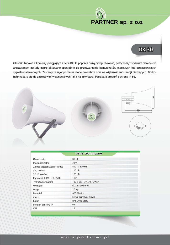 R 008 DK 30 PP * L TSPRE HE 24:2 AU 54- ER * EN RTIFIZIE RT ZE DRUCKKAMMER-LAUTSPRECHER HORN SPEAKER C DRUCKKAMMER-LAUTSPRECHER Dieser leistungsstarke Druckkammerlautsprecher mit dem hohen Sicherheitsstandard, entsprechend der No EN 54-24:2008 ist hervorragend für die Sprachalarmierung ausgestattet. Alle unsere nach EN 54-24:2 zertifizierten Druckkammerlautsprecher sind mit einer Keramikklemme, Thermosicherung und einem tempera beständigen Kabel ausgestattet, dadurch bieten sie eine erhöhte Sicherheit im Brandfall. Diese Druckkammerlautsprecher sind durch ihre hohe Leistungsfähigkeit, verbunden mit einem hohen Schalldru speziell für die Wiedergabe von Sprachdurchsagen bzw. Signalwarnungen ausgelegt. Sie eignen sich hervorrag für den Gebrauch im Innen- und Außenbereich. Die Ausführung mit 2 Kabelverschraubungen ermöglicht ein Dur schleifen zum nächsten Lautsprecher ohne das ein zusätzlicher Anschlußkasten benötigt wird. DK 30 Głośniki tubowe z komorą sprzęgającą z serii DK 30 poprzez dużą przepustowość, połączoną z wysokim ciśnieniem HORN SPEAKER This powerful horn speaker with the safety standards, according to the EN 54-24:2008 is excellent for voice alarm. akustycznym zostały zaprojektowane specjalnie do przetwarzania komunikatów głosowych lub ostrzegawczych of our certified horn speakers according to the EN 54-24:2008 are equipped ceramic terminal block, thermal f JAG R O Acoustic Solutions sygnałów alarmowych. Zestawy te and są odporne na słone resistant powietrze na większość substancji nieżrących. Doskohave a temperature cable,oraz because they offer increased security in a fire case. The horn speaker the DK series are applicable for the reproduction announcements nale nadaje się do zastosowań wewnętrznych jakparticularly i na zewnątrz. Posiadają stopień of ochrony IP 66. and warnings. Due to their excel capability and enormous sound pressure they are perfectly suitable for indoor as well as for outdoor use. The mo with 2 cable glands allowed to loop in loop out the cabling thus avoiding the need for an additional junction bo Technische Daten / Specifications Zertifizierung / Certification: EN 54-24 :2008 - 1438/CPD/0212 Nennbelastbarkeit / Loading rate: 30 Watt Übertragungsbereich / Frequency range (-10dB): 400 - 7 500 Hz SPL 1W / 1m: SPL Pmax / 1m: 110 dB 125 dB SPL 1W / 4 m: SPL Pmax / 4m: 89,3 dB 98,1 dB Abstrahlwinkel / Coverage angle (0.5/1/2/4 kHz): 150°/90°/55°/30° Übertrager / Transformer: 100 V, 30/15/7,5/3,75 Watt Abmessungen / Dimensions: Ø238 x 302 mm Gewicht / Weight: 2,3 kg Material / Material: ABS-Kunststoffgehäuse / ABS- plastic housing Schutzart / Protection IP 66 Anschluss / Connection: 3 polige Keramikklemme / 3-pole ceramic clamp Farbe / Colour: RAL-7035 Grau / RAL 7035 grey VPE / Packing unit: 6 JA G GR RO O Acoustic Solutions J AGR A GRO O Acoustic Solutions JA JAG GR RO O Acoustic Solutions JA JAG GR R O Acoustic Solutions Acoustic Solutions Acoustic Solutions Acoustic Solutions J AG J AGR A GR O JAG JA GR RO O JAG JA GR RO O AGRO JA G GR RO O Acoustic Solutions J AGR A GRO O Acoustic Solutions JA JAG GR RO O Acoustic Solutions JA JAG GR R O Acoustic Solutions Acoustic Solutions 30