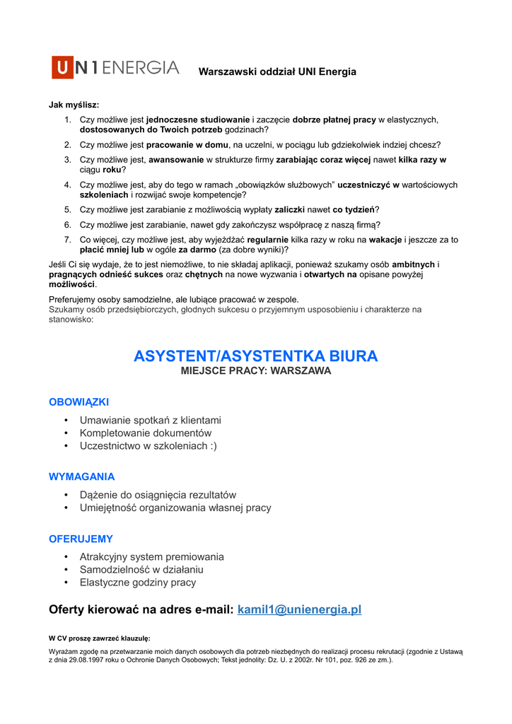 Warszawski oddział UNI Energia Jak myślisz: 1. Czy możliwe jest jednoczesne studiowanie i zaczęcie dobrze płatnej pracy w elastycznych, dostosowanych do Twoich potrzeb godzinach? 2. Czy możliwe jest pracowanie w domu, na uczelni, w pociągu lub gdziekolwiek indziej chcesz? 3. Czy możliwe jest, awansowanie w strukturze firmy zarabiając coraz więcej nawet kilka razy w ciągu roku? 4. Czy możliwe jest, aby do tego w ramach „obowiązków służbowych” uczestniczyć w wartościowych szkoleniach i rozwijać swoje kompetencje? 5. Czy możliwe jest zarabianie z możliwością wypłaty zaliczki nawet co tydzień? 6. Czy możliwe jest zarabianie, nawet gdy zakończysz współpracę z naszą firmą? 7. Co więcej, czy możliwe jest, aby wyjeżdżać regularnie kilka razy w roku na wakacje i jeszcze za to płacić mniej lub w ogóle za darmo (za dobre wyniki)? Jeśli Ci się wydaje, że to jest niemożliwe, to nie składaj aplikacji, ponieważ szukamy osób ambitnych i pragnących odnieść sukces oraz chętnych na nowe wyzwania i otwartych na opisane powyżej możliwości. Preferujemy osoby samodzielne, ale lubiące pracować w zespole. Szukamy osób przedsiębiorczych, głodnych sukcesu o przyjemnym usposobieniu i charakterze na stanowisko: ASYSTENT/ASYSTENTKA BIURA MIEJSCE PRACY: WARSZAWA OBOWIĄZKI • • • Umawianie spotkań z klientami Kompletowanie dokumentów Uczestnictwo w szkoleniach :) WYMAGANIA • • Dążenie do osiągnięcia rezultatów Umiejętność organizowania własnej pracy OFERUJEMY • • • Atrakcyjny system premiowania Samodzielność w działaniu Elastyczne godziny pracy Oferty kierować na adres e-mail: [email protected] W CV proszę zawrzeć klauzulę: Wyrażam zgodę na przetwarzanie moich danych osobowych dla potrzeb niezbędnych do realizacji procesu rekrutacji (zgodnie z Ustawą z dnia 29.08.1997 roku o Ochronie Danych Osobowych; Tekst jednolity: Dz. U. z 2002r. Nr 101, poz. 926 ze zm.).