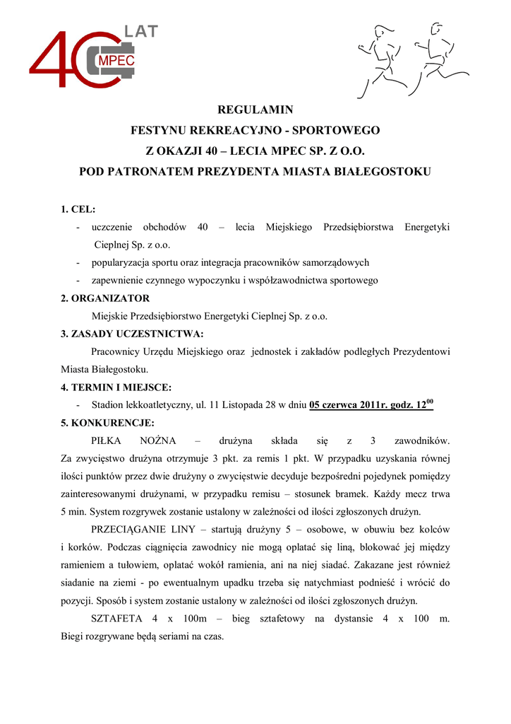 REGULAMIN FESTYNU REKREACYJNO - SPORTOWEGO Z OKAZJI 40 – LECIA MPEC SP. Z O.O. POD PATRONATEM PREZYDENTA MIASTA BIAŁEGOSTOKU 1. CEL: - uczczenie obchodów 40 – lecia Miejskiego Przedsiębiorstwa Energetyki Cieplnej Sp. z o.o. - popularyzacja sportu oraz integracja pracowników samorządowych - zapewnienie czynnego wypoczynku i współzawodnictwa sportowego 2. ORGANIZATOR Miejskie Przedsiębiorstwo Energetyki Cieplnej Sp. z o.o. 3. ZASADY UCZESTNICTWA: Pracownicy Urzędu Miejskiego oraz jednostek i zakładów podległych Prezydentowi Miasta Białegostoku. 4. TERMIN I MIEJSCE: - Stadion lekkoatletyczny, ul. 11 Listopada 28 w dniu 05 czerwca 2011r. godz. 1200 5. KONKURENCJE: PIŁKA NOŻNA – drużyna składa się z 3 zawodników. Za zwycięstwo drużyna otrzymuje 3 pkt. za remis 1 pkt. W przypadku uzyskania równej ilości punktów przez dwie drużyny o zwycięstwie decyduje bezpośredni pojedynek pomiędzy zainteresowanymi drużynami, w przypadku remisu – stosunek bramek. Każdy mecz trwa 5 min. System rozgrywek zostanie ustalony w zależności od ilości zgłoszonych drużyn. PRZECIĄGANIE LINY – startują drużyny 5 – osobowe, w obuwiu bez kolców i korków. Podczas ciągnięcia zawodnicy nie mogą oplatać się liną, blokować jej między ramieniem a tułowiem, oplatać wokół ramienia, ani na niej siadać. Zakazane jest również siadanie na ziemi - po ewentualnym upadku trzeba się natychmiast podnieść i wrócić do pozycji. Sposób i system zostanie ustalony w zależności od ilości zgłoszonych drużyn. SZTAFETA 4 x 100m – Biegi rozgrywane będą seriami na czas. bieg sztafetowy na dystansie 4 x 100 m. STREETBALL – Streetball to rodzaj koszykówki, w której nie kładzie się nacisku na zasady, stosuje się tylko te elementarne. Nikt tu nie liczy czasu na wyprowadzenie akcji. Mecze rozgrywane na 2 kosze przez zespoły 3 osobowe. Każdy mecz trwa 10 min, lub do zdobycia przez jedną z drużyn 16 pkt. Czas meczu jest ciągły (bez wyłączania zegara). System rozgrywek zostanie ustalony w zależności od ilości zgłoszonych drużyn. LEKKOATLETYKA mężczyźni: pchnięcie kulą – 5 kg, skok w dal, skok wzwyż kobiety: pchnięcie kulą – 4 kg, skok w dal, skok wzwyż WIELOBÓJ KIEROWNICZY – Prawo startu mają: Prezydent oraz jego zastępcy, dyrektorzy departamentów i szefowie jednostek podległych Urzędowi Miejskiemu oraz ich zastępcy. Wielobój składa się z trzech dyscyplin: skok w dal, pchnięcie kulą (mężczyźni 5 kg, kobiety 4 kg) oraz strzał na bramkę celnościową. 6. ZGŁOSZENIA - zgłoszenia imienne (na załączonym druku) z podziałem na konkurencje i dyscypliny prosimy przesyłać na adres: Miejskie Przedsiębiorstwo Energetyki Cieplnej Sp. z o.o., 15-062 Białystok, ul. Warszawska 27, fax 085 740 70 50, tel. 797 30 90 11, e-mail: [email protected] w terminie do 30 maja 2011r. 7. NAGRODY - zwycięzcy poszczególnych konkurencji otrzymają medale, zwycięzcy w punktacji generalnej otrzymają dyplomy i puchary 8. SPRAWY RÓŻNE - każda jednostka lub departament Urzędu Miejskiego ma prawo wystawić po jednym zespole w konkurencjach drużynowych oraz maksymalnie 5 zawodniczek/ków w każdej z konkurencji indywidualnych - do punktacji generalnej wliczane będą: 2 najlepsze wyniki w konkurencjach drużynowych, 10 najlepszych wyników indywidualnych oraz wielobój kierowniczy - sprawy nie ujęte w regulaminie rozstrzyga organizator - organizator nie ponosi odpowiedzialności za rzeczy pozostawione lub skradzione.