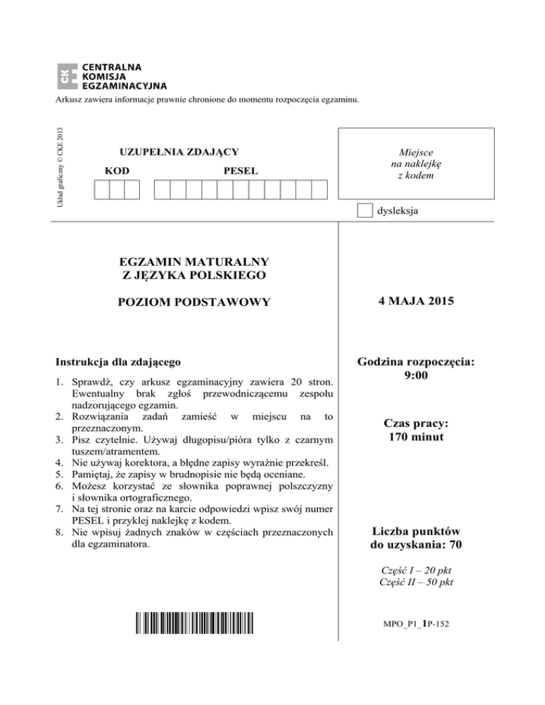 Układ graficzny © CKE 2013 Arkusz zawiera informacje prawnie chronione do momentu rozpoczęcia egzaminu. UZUPEŁNIA ZDAJĄCY KOD PESEL Miejsce na naklejkę z kodem dysleksja EGZAMIN MATURALNY Z JĘZYKA POLSKIEGO POZIOM PODSTAWOWY Instrukcja dla zdającego 1. Sprawdź, czy arkusz egzaminacyjny zawiera 20 stron. Ewentualny brak zgłoś przewodniczącemu zespołu nadzorującego egzamin. 2. Rozwiązania zadań zamieść w miejscu na to przeznaczonym. 3. Pisz czytelnie. Używaj długopisu/pióra tylko z czarnym tuszem/atramentem. 4. Nie używaj korektora, a błędne zapisy wyraźnie przekreśl. 5. Pamiętaj, że zapisy w brudnopisie nie będą oceniane. 6. Możesz korzystać ze słownika poprawnej polszczyzny i słownika ortograficznego. 7. Na tej stronie oraz na karcie odpowiedzi wpisz swój numer PESEL i przyklej naklejkę z kodem. 8. Nie wpisuj żadnych znaków w częściach przeznaczonych dla egzaminatora. 4 MAJA 2015 Godzina rozpoczęcia: 9:00 Czas pracy: 170 minut Liczba punktów do uzyskania: 70 Część I – 20 pkt Część II – 50 pkt MPO_P1_1P-152 Egzamin maturalny z języka polskiego Poziom podstawowy Część I – rozumienie czytanego tekstu Przeczytaj uważnie tekst, a następnie wykonaj zadania umieszczone pod nim. Odpowiadaj na podstawie tekstu i tylko własnymi słowami – chyba że w zadaniu polecono inaczej. Udzielaj tylu odpowiedzi, o ile jesteś proszona/y. Marcin Zamorski HIPERMARKET KULTURY 1. Występy Maryli Rodowicz, Perfectu, Kory i Maanamu, Beaty Kozidrak i Bajmu, Elektrycznych Gitar, Arki Noego, Norbiego oraz aktorów z serialu Klan to nie program festiwalu w Opolu. Najlepsi polscy artyści rozrywkowi koncertują w hipermarketach. W wielu polskich mallach1 działają już kina, galerie, organizowane są pokazy mody, występy mimów i konkursy karaoke. Jest tylko kwestią czasu, kiedy pojawi się tam pierwszy stały teatr. 2. Wizyta w hipermarkecie to spektakl. Aby zapewnić mu odpowiednią oprawę, wykorzystuje się – jak pisze Guy Debord w książce Społeczeństwo spektaklu – elementy typowe dla widowisk i feerii: światło, kolor, dźwięk, szkło, dzieła sztuki (w tym performance), parady. W ten sposób sprzedaż towarów staje się częścią nowej dziedziny zwanej detrozrywką (rozrywkowa sprzedaż detaliczna). Malle są więc łączone z parkami i centrami rozrywki, parkami tematycznymi czy kasynami (tzw. kasynotele). W Mall of America klientów kusi plan filmowy. Każdy może wziąć tam udział w zdjęciach próbnych, a potem sprawdzić się przed kamerą. Wszystko po to, by kupowanie w mallach było tylko jedną z form spędzania wolnego czasu. 3. Według badań Demoskopu już 22 procent mieszkańców dużych miast robi zakupy w hipermarketach. Najczęstszymi gośćmi centrów handlowych (bywają tam raz w miesiącu i częściej) są przedstawiciele inteligencji (81 proc.) i właściciele firm (39 proc.). Osoby te są jednocześnie największymi konsumentami kultury. Zarządzający hipermarketami zachowują się więc racjonalnie, łącząc handel z rozrywką. Hipermarket to współczesny teatr konsumpcji. 4. Niektóre amerykańskie malle budowano tak, by ich galerie kojarzyły się z wnętrzami teatralnymi. „Hipermarkety tworzą przestrzeń, w której ludzie mają możliwość autoekspresji. Takimi przestrzeniami były starożytne agory2 czy średniowieczne jarmarki. Ludyczne, zabawowe formy były nieodłącznym elementem ducha tych miejsc. Współczesne galerie handlowe tylko do tamtych wzorców nawiązują” – mówi Marta Bucholc, socjolog z Polskiej Akademii Nauk. „Hipermarket pełni obecnie takie funkcje, jakie do XIX wieku pełnił rynek, który był forum wymiany opinii, obrotu dobrami, a jednocześnie miejscem, gdzie prezentowali się muzykanci, trupy teatralne, sztukmistrzowie, gdzie publicznie ogłaszano ważne komunikaty albo wymierzano sprawiedliwość. Zamiast heroldów mamy promocje, zamiast chłosty i egzekucji – koncerty i pokazy. Bez zmian pozostały tylko występy muzyczne i teatralne” – mówi profesor Ireneusz Białecki, socjolog. 5. Przed trzema laty obok nowo otwieranych hipermarketów, hal i sklepów zaczęto budować sceny. Jedna z pierwszych powstała wiosną 1999 r. w warszawskiej galerii handlowej. Zaprezentowały się na niej zespół taneczny i kabaret, swój pokaz mieli też iluzjoniści. Artyści występują również w galeriach handlowych przed świętami Bożego Narodzenia, z okazji walentynek, Dnia Dziecka, Dnia Matki, a także podczas obchodów kolejnych rocznic powstania centrów handlowych. W 2001 r. z okazji piątej rocznicy powstania centrum pod Warszawą zagrał zespół Bad Boys Blue, grupa święcąca triumfy na przełomie lat 80. i 90. To była największa impreza koncertowa w historii polskich centrów 1 2 Mall – w kulturze amerykańskiej centrum handlowe. Agora – centralny plac miasta-państwa w starożytnej Grecji stanowiący miejsce zgromadzeń obywateli. Strona 2 z 20 MPO_1P Egzamin maturalny z języka polskiego Poziom podstawowy handlowych, rozmachem przebijająca wiele festiwali. Otwarcie nowego centrum handlowego na południu Polski uświetnił koncert Kory i Maanamu. „Dotychczas zagraliśmy dwa duże koncerty w centrach handlowych. Były bardzo profesjonalnie przygotowane, jak w salach koncertowych czy na festiwalach” – mówi menedżer grupy Maanam. W hipermarketach często występują osoby znane z telewizji. W innym centrum odbył się na przykład spektakl Klan na żywo. Aktorzy Klanu zagrali na żywo odcinek tej telenoweli. Część z nich, m.in. Tomasz Stockinger (dr Lubicz z Klanu), uważa, że „granie do koszyka” to nowa forma chałtury, czyli tego, co kiedyś określano mianem „grania do kotleta”. To typowo polskie podejście, ponieważ na Zachodzie aktorzy nie lekceważą żadnej publiczności. „Smuci mnie, że niektórzy artyści uważają występy w hipermarketach za chałturę. Ja się tego nie wstydzę: taki mam zawód i jeżeli ktoś chce mnie sł