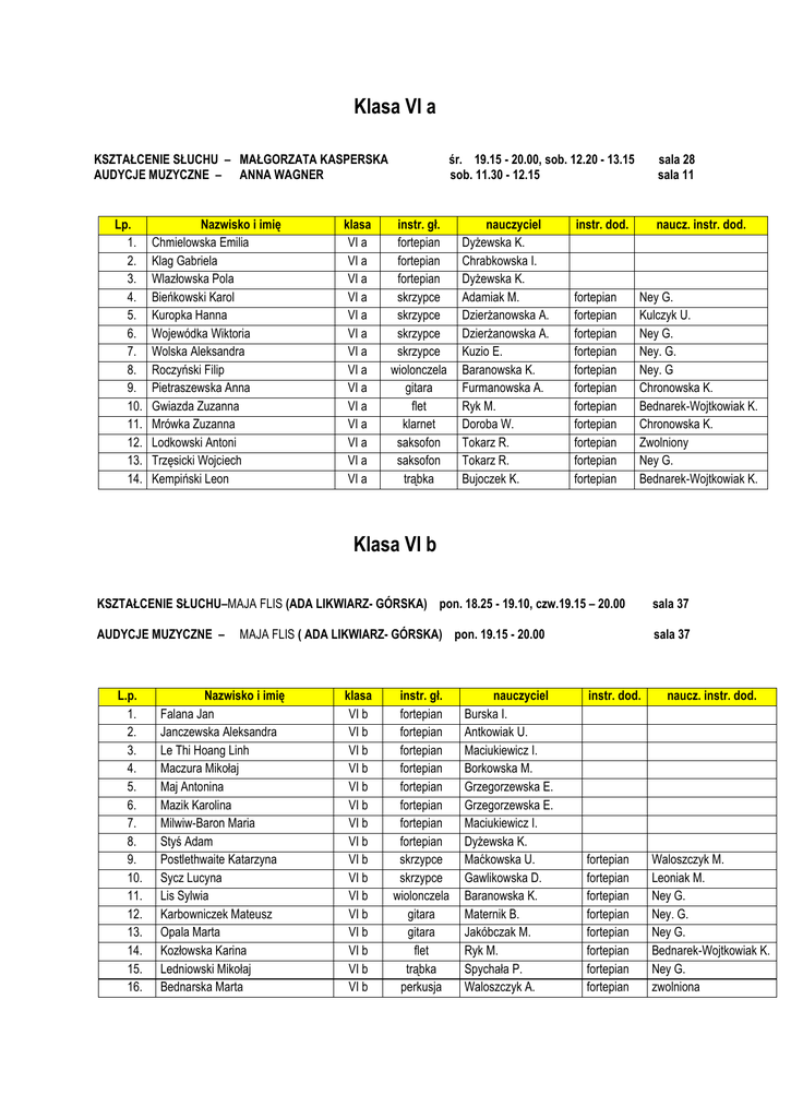 Klasa VI a KSZTAŁCENIE SŁUCHU – MAŁGORZATA KASPERSKA AUDYCJE MUZYCZNE – ANNA WAGNER Lp. 1. 2. 3. 4. 5. 6. 7. 8. 9. 10. 11. 12. 13. 14. Nazwisko i imię Chmielowska Emilia Klag Gabriela Wlazłowska Pola Bieńkowski Karol Kuropka Hanna Wojewódka Wiktoria Wolska Aleksandra Roczyński Filip Pietraszewska Anna Gwiazda Zuzanna Mrówka Zuzanna Lodkowski Antoni Trzęsicki Wojciech Kempiński Leon klasa VI a VI a VI a VI a VI a VI a VI a VI a VI a VI a VI a VI a VI a VI a śr. 19.15 - 20.00, sob. 12.20 - 13.15 sob. 11.30 - 12.15 instr. gł. fortepian fortepian fortepian skrzypce skrzypce skrzypce skrzypce wiolonczela gitara flet klarnet saksofon saksofon trąbka nauczyciel Dyżewska K. Chrabkowska I. Dyżewska K. Adamiak M. Dzierżanowska A. Dzierżanowska A. Kuzio E. Baranowska K. Furmanowska A. Ryk M. Doroba W. Tokarz R. Tokarz R. Bujoczek K. sala 28 sala 11 instr. dod. fortepian fortepian fortepian fortepian fortepian fortepian fortepian fortepian fortepian fortepian fortepian naucz. instr. dod. Ney G. Kulczyk U. Ney G. Ney. G. Ney. G Chronowska K. Bednarek-Wojtkowiak K. Chronowska K. Zwolniony Ney G. Bednarek-Wojtkowiak K. Klasa VI b KSZTAŁCENIE SŁUCHU–MAJA FLIS (ADA LIKWIARZ- GÓRSKA) pon. 18.25 - 19.10, czw.19.15 – 20.00 sala 37 AUDYCJE MUZYCZNE – sala 37 L.p. 1. 2. 3. 4. 5. 6. 7. 8. 9. 10. 11. 12. 13. 14. 15. 16. MAJA FLIS ( ADA LIKWIARZ- GÓRSKA) pon. 19.15 - 20.00 Nazwisko i imię Falana Jan Janczewska Aleksandra Le Thi Hoang Linh Maczura Mikołaj Maj Antonina Mazik Karolina Milwiw-Baron Maria Styś Adam Postlethwaite Katarzyna Sycz Lucyna Lis Sylwia Karbowniczek Mateusz Opala Marta Kozłowska Karina Ledniowski Mikołaj Bednarska Marta klasa VI b VI b VI b VI b VI b VI b VI b VI b VI b VI b VI b VI b VI b VI b VI b VI b instr. gł. fortepian fortepian fortepian fortepian fortepian fortepian fortepian fortepian skrzypce skrzypce wiolonczela gitara gitara flet trąbka perkusja nauczyciel Burska I. Antkowiak U. Maciukiewicz I. Borkowska M. Grzegorzewska E. Grzegorzewska E. Maciukiewicz I. Dyżewska K. Maćkowska U. Gawlikowska D. Baranowska K. Maternik B. Jakóbczak M. Ryk M. Spychała P. Waloszczyk A. instr. dod. fortepian fortepian fortepian fortepian fortepian fortepian fortepian fortepian naucz. instr. dod. Waloszczyk M. Leoniak M. Ney G. Ney. G. Ney G. Bednarek-Wojtkowiak K. Ney G. zwolniona Klasa VI c KSZTAŁCENIE SŁUCHU - MAJA FLIS (ADA LIKWIARZ- GÓRSKA) wt.- pt. 17.35 – 18.20 sala 37 AUDYCJE MUZYCZNE – ANNA WAGNER wt. sala 11 Lp. 1. 2. 3. 4. 5. 6. 7. 8. 9. 10. 11. 12. 13. 14. 15. 16. 17. Nazwisko i imię CalińskI Łukasz Flegel Katarzyna Kuźniar Zofia Rejda Tymon Szydłowska Hanna Tyburczy Julia Wolska Barabra Żłobińska Paulina Barwińska Jagoda Galant Roksana Kołodyńska Helena Tomanek Zofia Gdesz Dominik Nowakowski Stanisław Witkowska Barbara Blew Jan Abulewicz Mateusz klasa VI c VI c VI c VI c VI c VI c VI c VI c VI c VI c VI c VI c VI c VI c VI c VI c VI c instr. gł. fortepian fortepian fortepian fortepian fortepian fortepian fortepian fortepian skrzypce skrzypce skrzypce skrzypce gitara gitara gitara klarnet perkusja 16.45 – 17.30 nauczyciel Antkowiak U. Florek E. Chrabkowska I. Grzegorzewska E. Kulczyk U. Jasińska M. Grzegorzewska E. Antkowiak U. Maćkowska U. Dzierżanowska A. Dzierżanowska A. Maćkowska U. Jakóbczak M. Furmanowska A. Furmanowska A. Bulińskia J. Waloszczyk a. instr. dod. fortepian fortepian fortepian fortepian fortepian fortepian fortepian fortepian fortepian naucz. instr. dod. Florek E. Waloszczyk M. Waloszczyk M. Kwinta M. Zwolniony Kwinta M. Wota G. Chronowska K. Florek E.