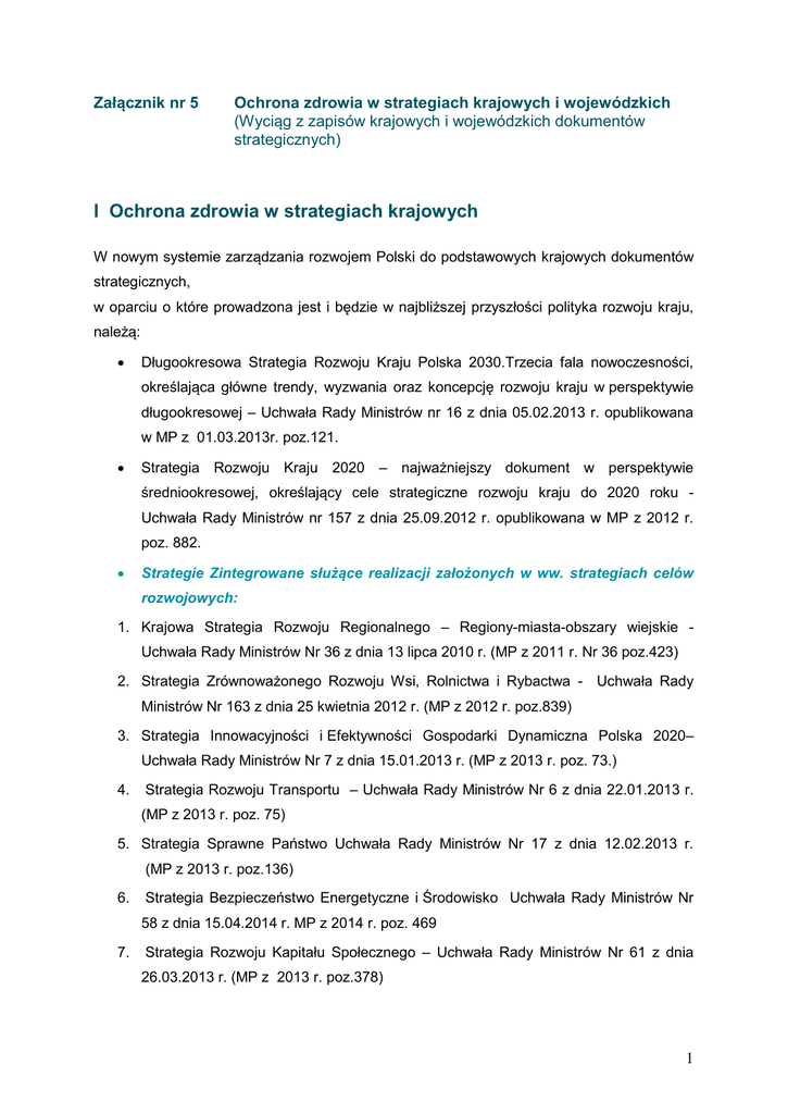 Załącznik nr 5 Ochrona zdrowia w strategiach krajowych i wojewódzkich (Wyciąg z zapisów krajowych i wojewódzkich dokumentów strategicznych) I Ochrona zdrowia w strategiach krajowych W nowym systemie zarządzania rozwojem Polski do podstawowych krajowych dokumentów strategicznych, w oparciu o które prowadzona jest i będzie w najbliższej przyszłości polityka rozwoju kraju, należą: Długookresowa Strategia Rozwoju Kraju Polska 2030.Trzecia fala nowoczesności, określająca główne trendy, wyzwania oraz koncepcję rozwoju kraju w perspektywie długookresowej – Uchwała Rady Ministrów nr 16 z dnia 05.02.2013 r. opublikowana w MP z 01.03.2013r. poz.121. Strategia Rozwoju Kraju 2020 – najważniejszy dokument w perspektywie średniookresowej, określający cele strategiczne rozwoju kraju do 2020 roku Uchwała Rady Ministrów nr 157 z dnia 25.09.2012 r. opublikowana w MP z 2012 r. poz. 882. Strategie Zintegrowane służące realizacji założonych w ww. strategiach celów rozwojowych: 1. Krajowa Strategia Rozwoju Regionalnego – Regiony-miasta-obszary wiejskie Uchwała Rady Ministrów Nr 36 z dnia 13 lipca 2010 r. (MP z 2011 r. Nr 36 poz.423) 2. Strategia Zrównoważonego Rozwoju Wsi, Rolnictwa i Rybactwa - Uchwała Rady Ministrów Nr 163 z dnia 25 kwietnia 2012 r. (MP z 2012 r. poz.839) 3. Strategia Innowacyjności i Efektywności Gospodarki Dynamiczna Polska 2020– Uchwała Rady Ministrów Nr 7 z dnia 15.01.2013 r. (MP z 2013 r. poz. 73.) 4. Strategia Rozwoju Transportu – Uchwała Rady Ministrów Nr 6 z dnia 22.01.2013 r. (MP z 2013 r. poz. 75) 5. Strategia Sprawne Państwo Uchwała Rady Ministrów Nr 17 z dnia 12.02.2013 r. (MP z 2013 r. poz.136) 6. Strategia Bezpieczeństwo Energetyczne i Środowisko Uchwała Rady Ministrów Nr 58 z dnia 15.04.2014 r. MP z 2014 r. poz. 469 7. Strategia Rozwoju Kapitału Społecznego – Uchwała Rady Ministrów Nr 61 z dnia 26.03.2013 r. (MP z 2013 r. poz.378) 1 8. Strategia Rozwoju Systemu Bezpieczeństwa Narodowego RP – Uchwała Rady Ministrów Nr 67 z dnia 09.04.2013 r. (MP z 2013r. poz.377) 9. Strategia Rozwoju Kapitału Ludzkiego - Uchwała Rady Ministrów Nr 104 z dnia 18. 06. 2013 r. (MP z 2013r. poz.640) Problemy ochrony zdrowia oraz cele i kierunki interwencji w tym obszarze zostały uwzględnione w Długookresowej Strategii Rozwoju Kraju Polska 2030 - DSRK i w Strategii Rozwoju Kraju 2020 - ŚSRK oraz w strategiach zintegrowanych w szczególności w: Strategii Rozwoju Kapitału Ludzkiego, Strategii Sprawne Państwo, Krajowej Strategii Rozwoju Regionalnego – Regiony – miasta - obszary wiejskie. Strategii Innowacyjności i Efektywności Gospodarki Dynamiczna Polska 2020 Strategii Zrównoważonego Rozwoju Wsi , Rolnictwa i Rybactwa na lata 2012-2020. 1. Długookresowa Strategia Rozwoju Kraju Polska 2030 Celem głównym Długookresowej Strategii Rozwoju Kraju Polska 2030. Trzecia Fala Nowoczesności jest poprawa jakości życia Polaków. W świetle zapisów strategii, zapewnienie efektywnej opieki zdrowotnej jest jednym z kluczowych warunków dla tworzenia optymalnego rozwoju w XXI wieku. W DSRK inwestycje w zdrowie traktowane są jako tzw. wydatki prorozwojowe, dzięki którym możliwe jest dążenie do kompleksowego rozwoju „jakości życia” jako dobrostanu w różnych obszarach bytu, które przejawia się m.in. w długości życia w zdrowiu. Z punktu widzenia długofalowych wyzwań rozwojowych Polski najistotniejsze staje się stworzenie warunków dla poprawy wskaźników dzietności, modernizacja struktury wydatków publicznych, co oznacza wzrost inwestycji publicznych, nakładów na naukę, badania, kulturę oraz zdrowie. Długofalowy rozwój Polski, a także istotnie zwiększenie szans na osiągnięcie zakładanych celów zatrudnienia osób w wieku 60+ nie będą możliwe bez znacząco większych nakładów na profilaktykę i promocję prozdrowotnych wzorców stylu życia. Długookresowa Strategia Rozwoju Kraju prezentuje nowe podejście do działań prozdrowotnych, traktując dobrostan zdrowotny społeczeństwa, jako integralną zmienną charakteryzującą jakość kapitału ludzkiego. Konsekwencją takiego podejścia 2 jest umiejscowienie zagadnień dotyczących ochrony zdrowia w celu 6 pn. Rozwój kapitału ludzkiego poprzez wzrost zatrudnienia i stworzenie „workfare state1.”. Dobry stan zdrowia populacji został uznany za istotną przesłankę poprawy jakości życia. Zmniejszenie przedwczesnej umieralności, zachorowalności i niepełnosprawności uwarunkowane jest przyspieszeniem postępów w zwalczaniu szkodliwych dla zdrowia zachowań i warunków, które prowadzą do większej zapadalności na choroby cywilizacyjne (głównie nowotwory, choroby układu oddechowego, układu krążenia, cukrzycę i choroby psychiczne). Zgodnie z zapisami strategii niezbędne jest zintensyfikowanie działań profilaktycznych promujących zdrowy styl życia, wdrożenie działań eliminujących różnice w zdrowiu wynikające między innymi z uwarunkowań społecznych oraz poprawa dostępu do wysokiej jakości usług zdrowotnych, tak aby umożliwić szybki i efektywny powrót na rynek pracy. Długookresowa Strategia Rozwoju Kraju definiuje w obszarze zdrowia następujące kierunki interwencji: - Wdrożenie instrumentów podnoszących jakość świadczonych usług zdrowotnych i efektywność systemu opieki zdrowotnej . Powyższe zostanie osiągnięte m.in. poprzez wprowadzenie zmian w zarządzaniu i finansowaniu ochrony zdrowia w obszarach o zasadniczym znaczeniu dla sprostania obecnym i nadchodzącym wyzwaniom cywilizacyjnym, gospodarczym i demograficznym. Wskazany kierunek interwencji realizowany będzie również poprzez wdrażanie systemów stałej poprawy jakości w ochronie zdrowia, poprawę infrastruktury ochrony zdrowia, rozwój bazy dydaktycznej uczelni medycznych oraz instytutów naukowych. - Dostosowanie systemu opieki zdrowotnej do prognozowanych do roku 2030 zmian demograficznych, w szczególności wzmocnienie