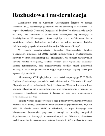 Rozbudowa i modernizacja Zakończenie prac na Centralnej Oczyszczalni Ścieków w ramach Kontraktu pn. „Modernizacja gospodarki wodno-ściekowej w Gliwicach – II etap – Modernizacja Centralnej Oczyszczalni Ścieków” to niewątpliwie powód do dumy dla realizatora i jednocześnie Beneficjenta tej inwestycji – Przedsiębiorstwa Wodociągów i Kanalizacji Sp. z o.o. w Gliwicach. Jest to największe zadanie budowlane wchodzące w zakres unijnego Projektu „Modernizacja gospodarki wodno-ściekowej w Gliwicach – II etap”. W ramach przedsięwzięcia, Centralna Oczyszczalnia Ścieków w Gliwicach, pracująca od 2001r. została rozbudowana i zmodernizowana zarówno w części mechanicznej jak i biologicznej. Na obiekcie powstały m.in. czwarty reaktor biologiczny, osadnik wtórny, dwie wydzielone zamknięte komory fermentacyjne, hala magazynowania osadów, trzeci piaskownik wirowy, a także stacja dozowania węgla organicznego. Łączny koszt prac wyniósł 40,5 mln PLN. Modernizacja COŚ była jedną z trzech części rozpoczętego 27.07.2010r. Projektu „Modernizacja gospodarki wodno-ściekowej w Gliwicach – II etap”. Obejmuje on także modernizację Stacji Uzdatniania Wody w Łabędach, która powinna zakończyć się w przyszłym roku, oraz refinansowanie wykonanej już przebudowy kanalizacji sanitarnej i deszczowej oraz sieci wodociągowej w rejonie ul. Dolnej Wsi. Łączna wartość całego projektu w jego podstawowym zakresie wynosiła 94,6 mln PLN, z czego dofinansowanie ze środków unijnych stanowiło 35,4 mln PLN. W efekcie starań PWiK w Gliwicach, w lutym bieżącego roku Ministerstwo Środowiska przyznało z uwagi na przebieg wszystkich dotychczasowych inwestycji wodno-ściekowych w Gliwicach, dodatkowe środki na realizację rozszerzonego zakresu inwestycji, której całkowita wartość zwiększyła się do ponad 202 mln PLN, a kwota dofinansowania ze środków Funduszu Spójności wzrosła o 53 mln PLN i aktualnie wynosi 88,7 mln PLN. Dzięki temu, obejmie ona także budowę kanalizacji sanitarnej w ostatnich do tej pory nieskanalizowanych dzielnicach Gliwic – Bojkowie (24,4 km) i Ostropie (36 km), jak również częściowo w dzielnicy Wójtowa Wieś. Mieszkańcy tych obszarów Gliwic uzyskają dostęp do sieci kanalizacyjnej najpóźniej w maju 2015r. Warto podkreślić, że obecny Projekt stanowi kontynuację realizowanego przez 10 lat i zakończonego w 2010r. przedsięwzięcia pod nazwą „Modernizacja gospodarki ściekowej w Gliwicach”, w ramach którego wykonano łącznie 109 km kanalizacji sanitarnej, 52 km kanalizacji deszczowej, oraz 7,4 km kanalizacji ogólnospławnej. Całkowita wartość tej największej w powojennej historii Gliwic inwestycji wyniosła około 40 mln euro, z czego 20,9 mln euro stanowiło dofinansowanie z Unii Europejskiej. Małgorzata Kapela-Leks