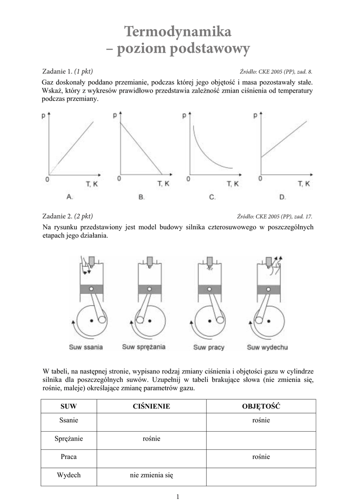 Termodynamika – poziom podstawowy Zadanie 1. (1 pkt) Źródło: CKE 2005 (PP), zad. 8. Zadanie 2. (2 pkt) Źródło: CKE 2005 (PP), zad. 17. 1 Zadanie 3. (3 pkt) Źródło: CKE 2005 (PP), zad. 19. 2 Zadanie 4. (2 pkt) Źródło: CKE 2005 (PP), zad. 21. 3 2 Egzamin maturalny z fizyki i astronomii Arkusz I W zadaniach od 1. do 8. wybierz i zaznacz jedną poprawną odpowiedĨ. Zadanie 1. (1 pkt) Dwaj kolarze zbliĪali siĊ do mety, jadąc jeden obok drugiego ruchem jednostajnym z prĊdkoĞcią 15 m/s. W odlegáoĞci 100 m od mety jeden z nich przyspieszyá i jadąc ruchem jednostajnie przyspieszonym po szeĞciu sekundach minąá metĊ. W jakiej odlegáoĞci od mety znajdowaá siĊ wówczas drugi kolarz jadący do koĔca z niezmienną prĊdkoĞcią? A. 2,5 m B. 5 m C. 10 m D. 15 m Zadanie 2. (1 pkt) Cechy charakterystyczne róĪnych typów gwiazd przedstawia siĊ za pomocą diagramu Hertzspunga-Russella (H – R). Na osiach wspóárzĊdnych tego diagramu odáoĪona jest Zadanie 5. (2 pkt) Źródło: CKE 2005 (PP), zad. 26. A. temperatura powierzchni (typ widmowy) i jasnoĞü absolutna (absolutna wielkoĞü gwiazdowa). B. jasnoĞü absolutna (absolutna wielkoĞü gwiazdowa) i odlegáoĞci od Ziemi. C. Ğrednica gwiazdy i temperatura jej powierzchni. D. temperatura powierzchni i odlegáoĞci od Ziemi. Zadanie 3. (1 pkt) PomiĊdzy nieruchomy stóá i poruszającą siĊ jak na rysunku linijkĊ wáoĪono okrągáy oáówek. Oáówek porusza siĊ (zakáadając, Īe nie wystĊpują poĞlizgi) cm 4 A. w lewo z prĊdkoĞcią o wartoĞci 4 cm . s s cm B. w prawo z prĊdkoĞcią o wartoĞci 4 . s C. w prawo z prĊdkoĞcią o wartoĞci 2 cm . s D. w lewo z prĊdkoĞcią o wartoĞci 2 cm . s Zadanie 4. (1 pkt) Planety w ruchu dookoáa SáoĔca poruszają siĊ po orbitach bĊdących A. okrĊgami. B. hiperbolami. C. elipsami. D. parabolami. Zadanie 6. 5. (1 pkt) Zadanie (1 pkt) Źródło: CKE 01.2006 (PP), zad. 5. Wykres przedstawia przemianĊ gazu doskonaáego. Jest to przemiana p, Pa A. izotermiczna. B. izochoryczna. C. izobaryczna. D. adiabatyczna. T, K 4 Zadanie 7. (2 pkt) Zadanie 15. Gaz (2 pkt) Zadanie 15. Gaz (2 pkt) Wykres przedstawia zaleĪnoĞü Wykres zaleĪnoĞü ciĞnieniaprzedstawia od temperatury staáej masy ciĞnienia od temperatury staáej masy gazu doskonaáego. ObjĊtoĞü tego gazu gazu doskonaáego. ObjĊtoĞü tego gazu w stanie (1.) wynosi V0. Oblicz, ile w stanieobjĊtoĞü (1.) wynosi . Oblicz, wynosi V3 wV0stanie (3.).ile wynosi objĊtoĞü V3 w stanie (3.). Źródło: CKE 01.2006 (PP), zad. 15. p p 2p0 2p0 p0 p0 0 0 2 2 3 3 2T0 2T0 3T0 3T0 1 1 T0 T0 T T Zadanie 16. Silnik (3 pkt) Zadanie 8. 16. (3 pkt) Źródło: CKE 01.2006 (PP), zad. 16. Zadanie Silnik (3 pkt)pracĊ 2,5 kJ, przekazaá do cháodnicy Silnik cieplny, wykonując 7,5 kJ ciepáa. Oblicz Silnik cieplny, wykonując pracĊ 2,5 kJ, przekazaá do cháodnicy 7,5 kJ ciepáa. Oblicz sprawnoĞü tego silnika. sprawnoĞü tego silnika. 5 Zadanie Zbiornik z azotem (3 pkt) Zadanie 9. 20. (3 pkt) Źródło: CKE 05.2006 (PP), zad. 20. o 2 Próbnypod egzamin maturalny1200 fizyki i astronomii zbiornik zawiera Próbny azot ciĞnieniem kPa. Temperatura gazu wynosi 27 C. 2Stalowy maturalny zzz fizyki 2 Próbny egzamin egzamin maturalny fizyki ii astronomii astronomii Poziom podstawowy Zbiornik zabezpieczony jest zaworemPoziom bezpieczeĔstwa, który otwiera siĊ gdy ciĞnienie gazu podstawowy Poziom podstawowy przekroczy 1500 kPa. Zbiornik wystawiono na dziaáanie promieni sáonecznych, w wyniku ZADANIA ZAMKNIĉTE czego temperatura gazu wzrosáa do 77oC. Podaj, czy w opisanej sytuacji nastąpi otwarcie ZADANIA ZAMKNIĉTE zaworu. OdpowiedĨ uzasadnij, wykonując niezbĊdne obliczenia. Przyjmij, Īe objĊtoĞü W zadaniach zadaniach od od 1. do do 10. 10. wybierz ii zaznacz zaznacz jedną jedną poprawną poprawną odpowiedĨ. odpowiedĨ. W zbiornika mimo ogrzania1.nie ulega wybierz zmianie. Zadanie 1. 1. (1 (1 pkt) pkt) Zadanie O tym, tym, Īe Īe siáy siáy dziaáające dziaáające na na KsiĊĪyc KsiĊĪyc siĊ siĊ nie nie równowaĪą, równowaĪą, moĪemy moĪemy wnioskowaü wnioskowaü na na podstawie podstawie O tego, Īe tego, Īe A. KsiĊĪyc KsiĊĪyc porusza porusza siĊ siĊ po po torze torze krzywoliniowym. krzywoliniowym. A. B. okres okres obiegu obiegu KsiĊĪyca KsiĊĪyca dookoáa dookoáa Ziemi Ziemi jest jest wiĊkszy wiĊkszy niĪ niĪ okres okres obrotu obrotu Ziemi Ziemi wokóá wokóá osi. osi. B. C. KsiĊĪyc jest zwrócony do Ziemi zawsze tą samą stroną. C. KsiĊĪyc jest zwrócony do Ziemi zawsze tą samą stroną. D. okres okres obiegu obiegu KsiĊĪyca KsiĊĪyca wokóá wokóá Ziemi Ziemi jest jest równy równy okresowi okresowi jego jego obrotu obrotu wokóá wokóá osi. osi. D. Zadanie 2. 2. (1 (1 pkt) pkt) Zadanie G Na cząstkĊ cząstkĊ poruszającą poruszającą siĊ siĊ zz prĊdkoĞcią prĊdkoĞcią vGv w w obszarze obszarze pola pola magnetycznego magnetycznego oo indukcji indukcji Na G G G G B dziaáa dziaáa siáa siáa F F (rys.).Sytuacja (rys.).Sytuacja przedstawiona przedstawiona na na rysunku rysunku dotyczy dotyczy B GG A. protonu. protonu. vv A. GG G B. elektronu. elektronu. F G B. F B B C. neutronu. neutronu. C. D. cząstki cząstki DD.. D. Zadanie 3.(1(1 (1 pkt) Zadanie 10.3. pkt) Zadanie pkt) Wypeánia Nr zadania 18.1 18.2 19 20 11.2006 (PP), zad. 3. Źródło: CKE Maks. liczba pkt 1 2 3 3 JeĪeli zaáoĪymy, zaáoĪymy,egzaminator! Īe podczas podczas powolnego powolnego zmniejszania zmniejszania objĊtoĞci objĊtoĞci gazu gazu jego temperatura temperatura JeĪeli Īe jego Uzyskana liczba pkt pozostaje staáa, staáa, to to na na pewno pewno pozostaje A. praca praca wykonana wykonana nad nad gazem gazem jest jest równa równa zeru. zeru. A. B. praca praca wykonana wykonana nad nad gazem gazem jest jest równa równa ciepáu ciepáu oddanemu oddanemu przez przez gaz. gaz. B. C. ciepáo pobrane przez gaz jest równe pracy wykonanej przez gaz. C. ciepáo pobrane przez gaz 