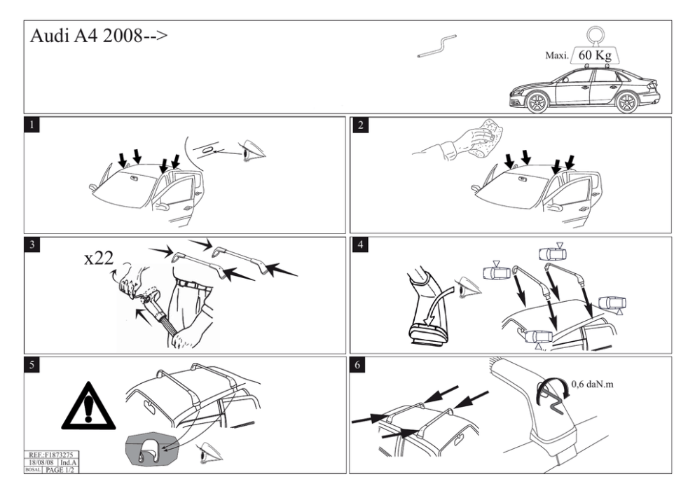 Audi A4 2008--> 608 600 Maxi. VERT &%56%24 :) ELA0LAINED ELgAIN 3!).465,"!3 .²VERT &EU !6!.4$2/)4 !.4%2)/2%$%342! 02:/$02!7!342/.! !6!.4'!5#(% !.4%2)/2%3).)342! 02:/$,%7!342/.! !22)%2%$2/)4 0/34%2)/2%$%342! 49,02!7!342/.! VERT &EU !22)%2%'!5#(% 0/34%2)/2%3).)342! 49,,%7!342/.! 1 2 3 4 5 60 Kg x22 6 0,6 daN.m T VER &EU REF.:F1873275 Réf.:F1883275 18/08/08 18/08/08ind.A Ind.A BOSAL PAGE 1/2 BOSAL PAGE 1/2 Français Sécurité - Prière de bien lire l’instruction de montage avant de commencer. - Veuillez vérifier que tous les articles sont inclus dans la boite. - Suivez l’ordre de numérotation 1,2,3 etc… - Ces barres de toit ne conviennent qu’au véhicule spécifié au recto de cette notice. - Fixer de façon sûre et correcte la charge. - Il est recommandé d’utiliser les accessoires adaptés au transport de la charge considérée (porte-vélo, porte-ski, etc…) - Faire attention à ne pas abîmer les barres de toit (chocs, etc…) et de veiller à un bon entretien des barres. - Nettoyer et sécher les surfaces en contact avec le véhicule avant montage. - Ces barres ont été conçues pour être placées à un endroit précis du véhicule. - La fixation sur le véhicule n’est plus garantie si le positionnement est différent de celui indiqué sur cette notice. - Les dispositifs de fixation doivent être serrés correctement et vérifiés régulièrement au cours des trajets. - L’arrimage des bagages avec des liens élastiques (sandow, tendeurs, etc...) est interdit; sangles conseillées. - Les pattes métalliques de fixation ont reçu un traitement spécial anti-agression de la peinture de votre véhicule ; ce traitement a fait l’objet de recherches approfondies. - N’intercaler aucune garniture supplémentaire (caoutchouc, plastique ou autre) entre la patte de fixation et la carrosserie, la bonne tenue des barres ne serait plus assurée. - Respecter la charge maximum admissible par le véhicule préconisée au recto. - La hauteur de la charge ne doit pas dépasser celle préconisée par le constructeur dans le manuel d’utilisation. - Planches à voile et charges longues: réduire la vitesse, 90 km/heure conseillé. - Pour économie d’énergie, les barres seront enlevées si elles ne sont pas utilisées. - Toute charge transportée sur le pavillon d’un véhicule affecte de manière sensible son comportement en particulier la sensibilité au vent latéral et le comportement en virage et au freinage. Il est conseillé de conduire avec plus de prudence (réduire la vitesse, tenir compte de l’augmentation des distances de freinage) - Important : Suivre correctement les instructions de montage et d’utilisation. Le non respect de cette notice d’utilisation dégage la responsabilité du constructeur. OK NO ESPAÑOL SEGURIDAD - Leer atentamente las instrucciones de montaje antes de comenzar. - Verificar que todos los artículos se encuentran en la caja. - Seguir el orden de numeración 1, 2, 3, etc. - Estas barras de techo sólo sirven para el vehículo especificado en el anverso de estas instrucciones. - Fijar la carga adecuadamente y de forma segura. - Se recomienda utilizar accesorios adaptados al transporte de la carga en cuestión (portabicicletas, portaesquís, etc.) - Prestar atención para no deteriorar las barras de techo (golpes, etc.) y realizar correctamente su mantenimiento. - Antes del montaje, limpiar y secar las superficies en contacto con el vehículo. - Estas barras han sido diseñadas para ser montadas en un lugar preciso del vehículo. - La fijación en el vehículo no está garantizada si la posición es diferente de la indicada en estas instrucciones. - Es imprescindible apretar correctamente los dispositivos de fijación y comprobarlos periódicamente durante el trayecto. - Se prohíbe sujetar el equipaje con elásticos (pulpos, tensores, etc.); se aconseja utilizar correas. - Las patillas metálicas de fijación han recibido un tratamiento especial antiagresión de la pintura de su vehículo; este tratamiento ha sido objeto de minuciosas investigaciones. - No intercalar ninguna guarnición suplementaria (caucho, plástico u otros) entre la patilla de fijación y la carrocería ya que, de lo contrario, no se garantizaría la correcta sujeción de las barras. - Respecte la carga máxima admitida por el vehículo que se indica en el anverso. - La altura de la carga no debe sobrepasar la recomendada por el fabricante en el manual de utilización. - Tablas de vela y cargas largas: reducir la velocidad; se recomienda circular a 90 km/h. - Para ahorrar energía, desmontar las barras si no se utilizan. - Todas las cargas que se transporten en el techo de un vehículo afectan de manera importante en su comportamiento, en especial en la sensibilidad al viento lateral y en el comportamiento en los giros y en la frenada. Se aconseja conducir con mayor prudencia (reducir la velocidad y tener en cuenta el aumento de la distancia para frenar) - Importante: Seguir correctamente las instrucciones de montaje y utilización. El incumplimiento de estas instrucciones de utilización exime de responsabilidad al Fabricante. POLSKI BEZPIECZEŃSTWO - Przed przystąpieniem do pracy należy dokładnie przeczytać instrukcję montażu. - Prosimy o sprawdzenie, czy wszystkie elementy znajdują się w opakowaniu. - Należy sprawdzić je zgodnie z kolejnymi numerami 1, 2, 3 itd. - Listwy dachowe przeznaczone są jedynie do samochodów wymienionych na odwrocie niniejszej instrukcji. - Należy zawsze zamocować ładunek w sposób prawidłowy i pewny. - Zalecane jest korzystanie z akcesoriów odpowiednich dla przewożonego ładunku (bagażnik na rowery, bagażnik na narty itd.). - Należy uważać, aby nie uszkodzić listew dachowych (poprzez uderzenie itd.) oraz zwracać uwagę na ich prawidłowe utrzymanie i konserwację. - Przed przystąpieniem do montażu należy wyczyścić i wysuszyć powierzchnie kontaktu z pojazdem. - Listwy zostały zaprojektowane do umieszczenia 