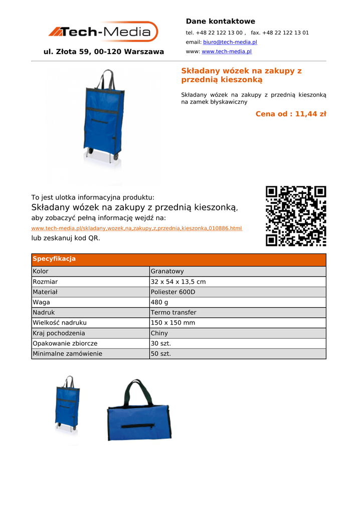 Dane kontaktowe tel. +48 22 122 13 00 , fax. +48 22 122 13 01 email: [email protected] ul. Złota 59, 00-120 Warszawa www: www.tech-media.pl Składany wózek na zakupy z przednią kieszonką Składany wózek na zakupy z przednią kieszonką na zamek błyskawiczny Cena od : 11,44 zł To jest ulotka informacyjna produktu: Składany wózek na zakupy z przednią kieszonką, aby zobaczyć pełną informację wejdź na: www.tech-media.pl/skladany,wozek,na,zakupy,z,przednia,kieszonka,010886.html lub zeskanuj kod QR. Specyfikacja Kolor Granatowy Rozmiar 32 x 54 x 13,5 cm Materiał Poliester 600D Waga 480 g Nadruk Termo transfer Wielkość nadruku 150 x 150 mm Kraj pochodzenia Chiny Opakowanie zbiorcze 30 szt. Minimalne zamówienie 50 szt.