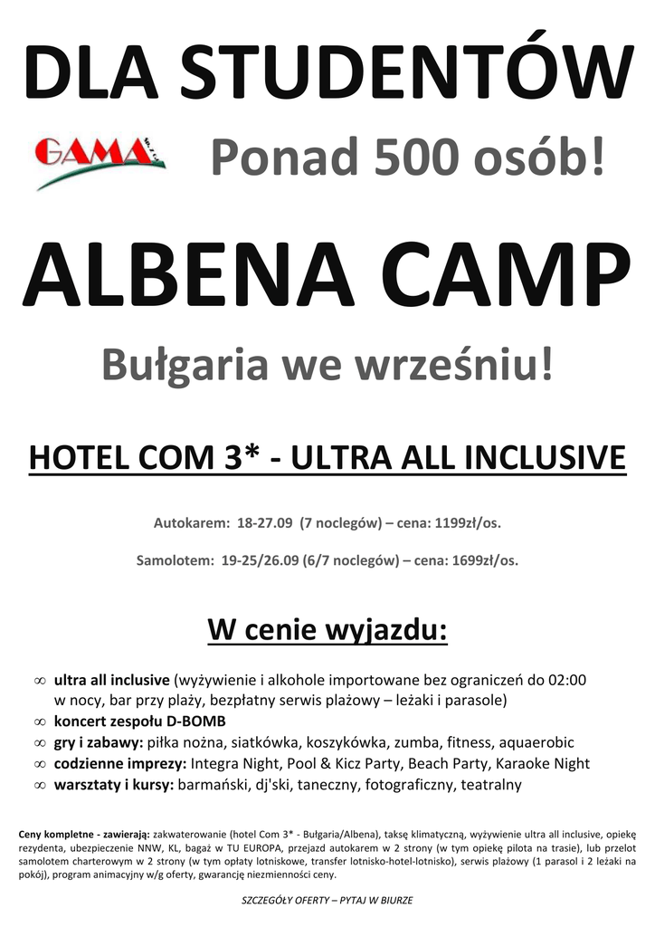 DLA STUDENTÓW Ponad 500 osób! ALBENA CAMP Bułgaria we wrześniu! HOTEL COM 3* - ULTRA ALL INCLUSIVE Autokarem: 18-27.09 (7 noclegów) – cena: 1199zł/os. Samolotem: 19-25/26.09 (6/7 noclegów) – cena: 1699zł/os. W cenie wyjazdu: • ultra all inclusive (wyżywienie i alkohole importowane bez ograniczeń do 02:00 w nocy, bar przy plaży, bezpłatny serwis plażowy – leżaki i parasole) • koncert zespołu D-BOMB • gry i zabawy: piłka nożna, siatkówka, koszykówka, zumba, fitness, aquaerobic • codzienne imprezy: Integra Night, Pool & Kicz Party, Beach Party, Karaoke Night • warsztaty i kursy: barmański, dj'ski, taneczny, fotograficzny, teatralny Ceny kompletne - zawierają: zakwaterowanie (hotel Com 3* - Bułgaria/Albena), taksę klimatyczną, wyżywienie ultra all inclusive, opiekę rezydenta, ubezpieczenie NNW, KL, bagaż w TU EUROPA, przejazd autokarem w 2 strony (w tym opiekę pilota na trasie), lub przelot samolotem charterowym w 2 strony (w tym opłaty lotniskowe, transfer lotnisko-hotel-lotnisko), serwis plażowy (1 parasol i 2 leżaki na pokój), program animacyjny w/g oferty, gwarancję niezmienności ceny. SZCZEGÓŁY OFERTY – PYTAJ W BIURZE