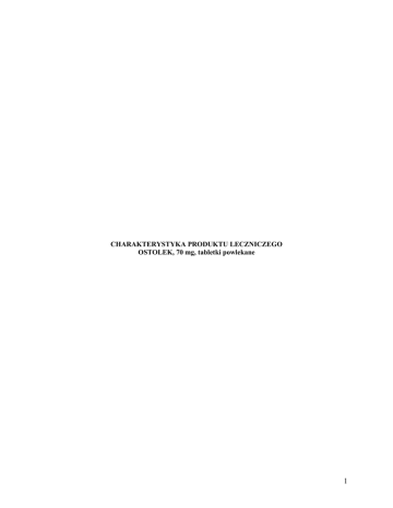 CHARAKTERYSTYKA PRODUKTU LECZNICZEGO OSTOLEK, 70 mg, tabletki powlekane 1 CHARAKTERYSTYKA PRODUKTU LECZNICZEGO 1. NAZWA PRODUKTU LECZNICZEGO Ostolek, 70 mg, tabletki powlekane 2. SKŁAD JAKOŚCIOWY I ILOŚCIOWY Jedna tabletka powlekana zawiera 70 mg kwasu alendronowego (Acidum alendronicum) w postaci trójwodnego alendronianu sodu 91,35 mg. Produkt leczniczy Ostolek zawiera 60 mg laktozy jednowodnej. Pełny wykaz substancji pomocniczych, patrz punkt 6.1. 3. POSTAĆ FARMACEUTYCZNA Tabletki powlekane Tabletki powlekane są podłużne, koloru błękitnego, bez plam i uszkodzeń. 4. SZCZEGÓŁOWE DANE KLINICZNE 4.1 Wskazania do stosowania Leczenie osteoporozy u kobiet po menopauzie. Alendronian zmniejsza ryzyko złamań kręgów i szyjki kości udowej. Osteoporoza u mężczyzn z grupy zwiększonego ryzyka wystąpienia złamań. Wykazano zmniejszenie liczby przypadków złamań kręgów, nie wykazano zmniejszenia przypadków złamań innych niż złamania kręgów. 4.2 Dawkowanie i sposób podawania Do stosowania doustnego. Osteoporoza kobiet po menopauzie Zalecana dawka to jedna tabletka 70 mg raz na tydzień. Osteoporoza u mężczyzn Zalecana dawka to jedna tabletka 70 mg raz na tydzień. Aby uzyskać odpowiednie wchłanianie alendronianu Produkt leczniczy Ostolek należy przyjmować na pusty żołądek rano, natychmiast po przebudzeniu, popijając jedynie zwykłą wodą, co najmniej 30 minut przed przyjęciem pierwszego posiłku, napoju lub leku. Inne płyny (w tym woda mineralna), jedzenie oraz niektóre leki mogą zmniejszać wchłanianie alendronianu (patrz punkt 4.5). Instrukcja dotycząca stosowania produktu leczniczego (patrz punkt 4.4 ) 2 • Produkt leczniczy Ostolek, tabletki powlekane 70 mg można połykać tylko na początku dnia, popijając całą szklanką wody (nie mniej niż 200 ml). • Produkt leczniczy Ostolek, tabletki powlekane 70 mg należy połykać w całości. Tabletek nie wolno żuć, ssać i nie wolno dopuścić do ich rozpuszczenia w jamie ustnej z powodu ryzyka owrzodzenia błony śluzowej jamy ustnej i gardła. • Pacjentom nie wolno kłaść się aż do spożycia pierwszego posiłku w ciągu dnia, który należy zjeść nie wcześniej niż 30 minut po przyjęciu leku. • Pacjentom nie wolno kłaść się w ciągu 30 minut od przyjęcia produktu leczniczego Ostolek, tabletki powlekane 70 mg. • Produktu leczniczego Ostolek, tabletki powlekane 70 mg nie należy przyjmować wieczorem przed położeniem się spać lub rano przed wstaniem z łóżka. W przypadku nieodpowiedniej diety pacjenci powinni przyjmować suplementy wapnia i witaminy D (patrz punkt 4.4). Pacjenci w podeszłym wieku W czasie badań klinicznych w profilach skuteczności lub bezpieczeństwa stosowania alendronianu nie wystąpiły różnice wynikające z wieku. Z tego powodu nie ma konieczności dostosowywania dawki w przypadku pacjentów w podeszłym wieku. Pacjenci z niewydolnością nerek Nie ma konieczności dostosowywania dawki u pacjentów ze współczynnikiem przesączania kłębuszkowego (GFR) wyższym niż 35 ml/min. Alendronianu nie zaleca się pacjentom z niewydolnością nerek, jeżeli GFR jest niższy niż 35 ml/min, z powodu braku danych. Pacjenci z zaburzeniami czynności wątroby Nie jest konieczne dostosowanie dawki. Dzieci i młodzież Ostolek, tabletki powlekane 70 mg nie jest zalecany do stosowania u dzieci i młodzieży ze względu na brak danych dotyczących bezpieczeństwa stosowania i skuteczności. 4.3 Przeciwwskazania • Nadwrażliwość na substancję czynną lub na którąkolwiek substancję pomocniczą. • Zaburzenia przełyku oraz inne czynniki, które opóźniają opróżnianie przełyku, takie jak zwężenie lub skurcz dolnej części przełyku. • Brak możliwości zachowania pozycji pionowej przez co najmniej 30 minut. • Hipokalcemia. Patrz także punkt 4.4 4.4 Specjalne ostrzeżenia i środki ostrożności dotyczące stosowania Alendronian może wywoływać miejscowe podrażnienia błony śluzowej górnego odcinka układu pokarmowego. Istnieje ryzyko nasilenia chorób współistniejących, należy więc zachować ostrożność, jeżeli alendronian podawany jest pacjentom: z chorobami górnego odcinka układu pokarmowego, takimi jak trudności z przełykaniem, choroby przełyku, zapalenie błony śluzowej żołądka, zapalenie dwunastnicy lub owrzodzenia przewodu pokarmowego, lub u których niedawno (w ciągu ostatniego roku) występowały poważne choroby układu pokarmowego, takie jak choroba wrzodowa żołądka, aktywne krwawienia z żołądka lub dwunastnicy, lub u pacjentów którzy zostali poddani interwencjom chirurgicznym w obrębie górnych odcinków przewodu pokarmowego z wyłączeniem plastyki 3 odźwiernika (patrz punkt 4.3). U pacjentów ze zdiagnozowanym przełykiem Barretta, zastosowanie kwasu alendronowego powinno zostać poprzedzone medyczną analizą korzyści i ryzyka indywidualnych przypadków. U pacjentów leczonych alendronianem zanotowano działania niepożądane w obrębie przełyku (w niektórych przypadkach poważne i wymagające hospitalizacji), takie jak zapalenie przełyku, owrzodzenie przełyku lub nadżerka przełyku, w rzadkich przypadkach powodujące zwężenie przełyku. Z tego powodu lekarz powinien zwracać szczególną uwagę na objawy przedmiotowe i podmiotowe wskazujące na reakcję przełykową. Pacjenta należy pouczyć, by przerwał przyjmowanie alendronianu i zgłosił się do lekarza, jeśli zauważy u siebie narastanie objawów podrażnienia przełyku, takich jak trudności w przełykaniu, ból w trakcie przełykania, ból zamostkowy lub wystąpienie bądź nasilenie zgagi. Przyjmuje się, że ryzyko wystąpienia ciężkich działań niepożądanych dotyczących przełyku jest większe w przypadku pacjentów, którzy nie przyjmują alendronianu w sposób prawidłowy i (lub) kontynuują przyjmowanie alendronianu po nasileniu się objawów podrażnienia przełyku. Ważne jest, aby pacjent otrzymał wyczerpujące