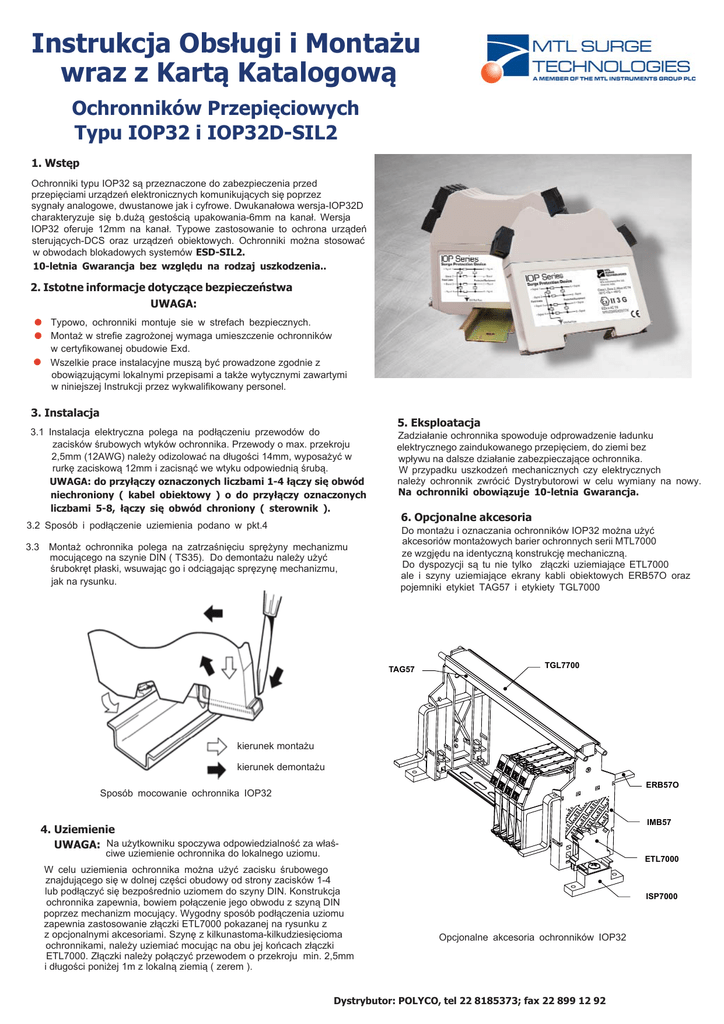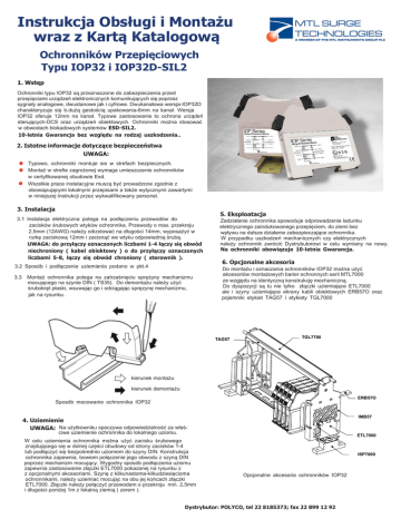 Instrukcja Obsługi i Montażu wraz z Kartą Katalogową Ochronników Przepięciowych Typu IOP32 i IOP32D-SIL2 1. Wstęp Ochronniki typu IOP32 są przeznaczone do zabezpieczenia przed przepięciami urządzeń elektronicznych komunikujących się poprzez sygnały analogowe, dwustanowe jak i cyfrowe. Dwukanałowa wersja-IOP32D charakteryzuje się b.dużą gestością upakowania-6mm na kanał. Wersja IOP32 oferuje 12mm na kanał. Typowe zastosowanie to ochrona urządeń sterujących-DCS oraz urządzeń obiektowych. Ochronniki można stosować w obwodach blokadowych systemów ESD-SIL2. 10-letnia Gwarancja bez względu na rodzaj uszkodzenia.. 2. Istotne informacje dotyczące bezpieczeństwa UWAGA: O O O Typowo, ochronniki montuje sie w strefach bezpiecznych. Montaż w strefie zagrożonej wymaga umieszczenie ochronników w certyfikowanej obudowie Exd. Wszelkie prace instalacyjne muszą być prowadzone zgodnie z obowiązującymi lokalnymi przepisami a także wytycznymi zawartymi w niniejszej Instrukcji przez wykwalifikowany personel. 3. Instalacja 3.1 Instalacja elektryczna polega na podłączeniu przewodów do zacisków śrubowych wtyków ochronnika. Przewody o max. przekroju 2,5mm (12AWG) należy odizolować na długości 14mm, wyposażyć w rurkę zaciskową 12mm i zacisnąć we wtyku odpowiednią śrubą. UWAGA: do przyłączy oznaczonych liczbami 1-4 łączy się obwód niechroniony ( kabel obiektowy ) o do przyłączy oznaczonych liczbami 5-8, łączy się obwód chroniony ( sterownik ). 3.2 Sposób i podłączenie uziemienia podano w pkt.4 3.3 Montaż ochronnika polega na zatrzaśnięciu sprężyny mechanizmu mocującego na szynie DIN ( TS35). Do demontażu należy użyć śrubokręt płaski, wsuwając go i odciągając spręzynę mechanizmu, jak na rysunku. 5. Eksploatacja Zadziałanie ochronnika spowoduje odprowadzenie ładunku elektrycznego zaindukowanego przepięciem, do ziemi bez wpływu na dalsze działanie zabezpieczające ochronnika. W przypadku uszkodzeń mechanicznych czy elektrycznych należy ochronnik zwrócić Dystrybutorowi w celu wymiany na nowy. Na ochronniki obowiązuje 10-letnia Gwarancja. 6. Opcjonalne akcesoria Do montażu i oznaczania ochronników IOP32 można użyć akcesoriów montażowych barier ochronnych serii MTL7000 ze wzgjędu na identyczną konstrukcję mechaniczną. Do dyspozycji są tu nie tylko złączki uziemiające ETL7000 ale i szyny uziemiające ekrany kabli obiektowych ERB57O oraz pojemniki etykiet TAG57 i etykiety TGL7000 TAG57 TGL7700 kierunek montażu l kierunek demontażu ERB57O Sposób mocowanie ochronnika IOP32 IMB57 4. Uziemienie UWAGA: Na użytkowniku spoczywa odpowiedzialność za właściwe uziemienie ochronnika do lokalnego uziomu. ETL7000 W celu uziemienia ochronnika można użyć zacisku śrubowego znajdującego się w dolnej części obudowy od strony zacisków 1-4 lub podłączyć się bezpośrednio uziomem do szyny DIN. Konstrukcja ochronnika zapewnia, bowiem połączenie jego obwodu z szyną DIN poprzez mechanizm mocujący. Wygodny sposób podłączenia uziomu zapewnia zastosowanie złączki ETL7000 pokazanej na rysunku z z opcjonalnymi akcesoriami. Szynę z kilkunastoma-kilkudziesięcioma ochronnikami, należy uziemiać mocując na obu jej końcach złączki ETL7000. Złączki należy połączyć przewodem o przekroju min. 2,5mm i długości poniżej 1m z lokalną ziemią ( zerem ). ISP7000 Opcjonalne akcesoria ochronników IOP32 Dystrybutor: POLYCO, tel 22 8185373; fax 22 899 12 92 DANE TECHNICZNE dane w temperaturze 25C Maksymalny prąd przepięciowy 20kA w szczycie (8/20µs standard ) Prąd upływu Mniej niż 1µA przy max. napięciu zasilania Maksymalny prąd obciążenia 0,675A. Pasmo przenoszenia 6,5MHz Rezystancja wnoszona Całkowita w pętli: 4ohm Temperatura otoczenia -40°C to +85°C (-40°F to +185°F) (praca) -40°C to +85°C (-40°F to +185°F) (magazynowanie) Wilgotnosć powietrza 5% to 95% RH (nie kondensująca) Przyłącza Wtyki z zaciskami śrubowymi M o d el Nominalne napięcie Un Uc in Napiecie pracy max. (MCOV Prąd nominalny IOP32D 32V 32V 36V 36V 675mA 675mA i sn I max 3kA 3kA Max. prąd przepięciowy (8/20µs) 20kA 20kA Prąd w impulsie wyładowania atm.(10/350µs) I imp 2.5kA 2.5kA Max. napięcie przy i sn Max napięcie przy 1kV/µs Up 45V 45V Up <38V <38V Pasmo przenoszenia fG 6.5MHz 6.5MHz R 2 2 Nominalny prąd przepięciowy (8/20µs) Rezystancja szeregowa Zakres temperatur pracy -40°C to +80°C Testowane jako kategoria ochronnika A2, B2, C1, C2, C3, D1 Max prąd przeciążenia dla in=3kA Wytrzymałośc na impulsy prądowe (8/20µs) 22kA 22kA 10kA Poziom ochrony obudowy 10kA IP20 1A rms, 5T 80kPa-160kP5% - 95% RH Wytrzymałość na przeciążenie prądem ac Waunki atmosferyczne-praca Średnica przewodów przyłączeniowych 2,5mm ( 12AWG ) Sposób montażu Na szynie DIN ( TS35 ) Waga 175g, odporność na ogień UL94-VO Wymiary Rysunek Odporność na zakłócenia EMC Zgodna ze standardem EN 60950: 1992 EN 61000-6-2: 1999, EN 61010-1: 1993 Stosowanie w strefach zagrożonych Zgodnie z Certyfikatem IOP3 2 Tesowane zgodnie ze standartem IEC 61643-21. Loop 1 Loop 2 Schemat elektryczny Schemat elektryczny Wymiary CERTYFIKATY Standard Standard Dokument Cechy Ex EU (Baseefa) EN 50014:1997 + A1 & A2 EN 50020:2002 EN60079-26:2004 Baseefa06ATEX0036X EEx ia IIC T4 IOP32 IOP32D EU (MTL) BS EN 50014:1998 BS EN 50021:1999 EN 60079-15:2003 MTL06ATEX0132X EEx n IIC T4 IOP32 IOP32D Dystrybutor: POLYCO, tel 22 8185373; fax 22 899 12 92 [email protected]; www.polyco.com.pl reserves the right to MTL Surge Technologechnologies ies s specification without notice. Bedfordshire, England LU1 3JJ Power Court, Luton, Tel: +44 (0)1582 723633 Fax: +44 (0)1582 483180 E-mail: [email protected] WWW: www.mtlsurge.com A member of the MTL Instruments Group plc Ochronnik typ 901-130 Rev A 11/16/06 Typ Typ Rodzaj Typ Type