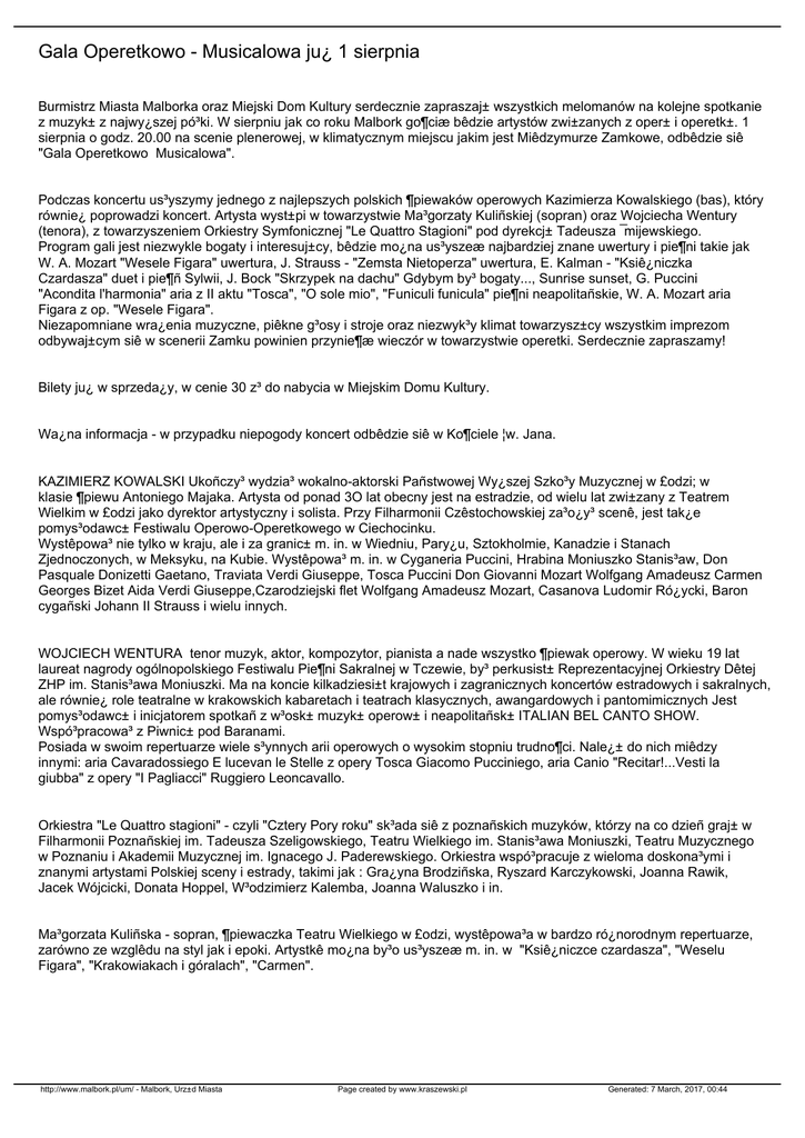 Gala Operetkowo - Musicalowa ju¿ 1 sierpnia Burmistrz Miasta Malborka oraz Miejski Dom Kultury serdecznie zapraszaj± wszystkich melomanów na kolejne spotkanie z muzyk± z najwy¿szej pó³ki. W sierpniu jak co roku Malbork go¶ciæ bêdzie artystów zwi±zanych z oper± i operetk±. 1 sierpnia o godz. 20.00 na scenie plenerowej, w klimatycznym miejscu jakim jest Miêdzymurze Zamkowe, odbêdzie siê "Gala Operetkowo Musicalowa". Podczas koncertu us³yszymy jednego z najlepszych polskich ¶piewaków operowych Kazimierza Kowalskiego (bas), który równie¿ poprowadzi koncert. Artysta wyst±pi w towarzystwie Ma³gorzaty Kuliñskiej (sopran) oraz Wojciecha Wentury (tenora), z towarzyszeniem Orkiestry Symfonicznej "Le Quattro Stagioni" pod dyrekcj± Tadeusza ¯mijewskiego. Program gali jest niezwykle bogaty i interesuj±cy, bêdzie mo¿na us³yszeæ najbardziej znane uwertury i pie¶ni takie jak W. A. Mozart "Wesele Figara" uwertura, J. Strauss - "Zemsta Nietoperza" uwertura, E. Kalman - "Ksiê¿niczka Czardasza" duet i pie¶ñ Sylwii, J. Bock "Skrzypek na dachu" Gdybym by³ bogaty..., Sunrise sunset, G. Puccini "Acondita l'harmonia" aria z II aktu "Tosca", "O sole mio", "Funiculi funicula" pie¶ni neapolitañskie, W. A. Mozart aria Figara z op. "Wesele Figara". Niezapomniane wra¿enia muzyczne, piêkne g³osy i stroje oraz niezwyk³y klimat towarzysz±cy wszystkim imprezom odbywaj±cym siê w scenerii Zamku powinien przynie¶æ wieczór w towarzystwie operetki. Serdecznie zapraszamy! Bilety ju¿ w sprzeda¿y, w cenie 30 z³ do nabycia w Miejskim Domu Kultury. Wa¿na informacja - w przypadku niepogody koncert odbêdzie siê w Ko¶ciele ¦w. Jana. KAZIMIERZ KOWALSKI Ukoñczy³ wydzia³ wokalno-aktorski Pañstwowej Wy¿szej Szko³y Muzycznej w £odzi; w klasie ¶piewu Antoniego Majaka. Artysta od ponad 3O lat obecny jest na estradzie, od wielu lat zwi±zany z Teatrem Wielkim w £odzi jako dyrektor artystyczny i solista. Przy Filharmonii Czêstochowskiej za³o¿y³ scenê, jest tak¿e pomys³odawc± Festiwalu Operowo-Operetkowego w Ciechocinku. Wystêpowa³ nie tylko w kraju, ale i za granic± m. in. w Wiedniu, Pary¿u, Sztokholmie, Kanadzie i Stanach Zjednoczonych, w Meksyku, na Kubie. Wystêpowa³ m. in. w Cyganeria Puccini, Hrabina Moniuszko Stanis³aw, Don Pasquale Donizetti Gaetano, Traviata Verdi Giuseppe, Tosca Puccini Don Giovanni Mozart Wolfgang Amadeusz Carmen Georges Bizet Aida Verdi Giuseppe,Czarodziejski flet Wolfgang Amadeusz Mozart, Casanova Ludomir Ró¿ycki, Baron cygañski Johann II Strauss i wielu innych. WOJCIECH WENTURA tenor muzyk, aktor, kompozytor, pianista a nade wszystko ¶piewak operowy. W wieku 19 lat laureat nagrody ogólnopolskiego Festiwalu Pie¶ni Sakralnej w Tczewie, by³ perkusist± Reprezentacyjnej Orkiestry Dêtej ZHP im. Stanis³awa Moniuszki. Ma na koncie kilkadziesi±t krajowych i zagranicznych koncertów estradowych i sakralnych, ale równie¿ role teatralne w krakowskich kabaretach i teatrach klasycznych, awangardowych i pantomimicznych Jest pomys³odawc± i inicjatorem spotkañ z w³osk± muzyk± operow± i neapolitañsk± ITALIAN BEL CANTO SHOW. Wspó³pracowa³ z Piwnic± pod Baranami. Posiada w swoim repertuarze wiele s³ynnych arii operowych o wysokim stopniu trudno¶ci. Nale¿± do nich miêdzy innymi: aria Cavaradossiego E lucevan le Stelle z opery Tosca Giacomo Pucciniego, aria Canio "Recitar!...Vesti la giubba" z opery "I Pagliacci" Ruggiero Leoncavallo. Orkiestra "Le Quattro stagioni" - czyli "Cztery Pory roku" sk³ada siê z poznañskich muzyków, którzy na co dzieñ graj± w Filharmonii Poznañskiej im. Tadeusza Szeligowskiego, Teatru Wielkiego im. Stanis³awa Moniuszki, Teatru Muzycznego w Poznaniu i Akademii Muzycznej im. Ignacego J. Paderewskiego. Orkiestra wspó³pracuje z wieloma doskona³ymi i znanymi artystami Polskiej sceny i estrady, takimi jak : Gra¿yna Brodziñska, Ryszard Karczykowski, Joanna Rawik, Jacek Wójcicki, Donata Hoppel, W³odzimierz Kalemba, Joanna Waluszko i in. Ma³gorzata Kuliñska - sopran, ¶piewaczka Teatru Wielkiego w £odzi, wystêpowa³a w bardzo ró¿norodnym repertuarze, zarówno ze wzglêdu na styl jak i epoki. Artystkê mo¿na by³o us³yszeæ m. in. w "Ksiê¿niczce czardasza", "Weselu Figara", "Krakowiakach i góralach", "Carmen". http://www.malbork.pl/um/ - Malbork, Urz±d Miasta Page created by www.kraszewski.pl Generated: 7 March, 2017, 00:44 Miejski Dom Kultury Plac S³owiañski 18 82-200 Malbork tel.(055) 272-38-52 fax (055) 272-46-01 e-mail: [email protected] www.mdk.malbork.pl http://www.malbork.pl/um/ - Malbork, Urz±d Miasta Page created by www.kraszewski.pl Generated: 7 March, 2017, 00:44