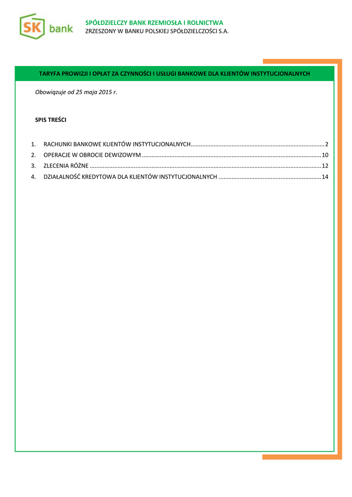 SPÓŁDZIELCZY BANK RZEMIOSŁA I ROLNICTWA ZRZESZONY W BANKU POLSKIEJ SPÓŁDZIELCZOŚCI S.A. TARYFA PROWIZJI I OPŁAT ZA CZYNNOŚCI I USŁUGI BANKOWE DLA KLIENTÓW INSTYTUCJONALNYCH Obowiązuje od 25 maja 2015 r. SPIS TREŚCI 1. RACHUNKI BANKOWE KLIENTÓW INSTYTUCJONALNYCH .................................................................................. 2 2. OPERACJE W OBROCIE DEWIZOWYM .............................................................................................................. 10 3. ZLECENIA RÓŻNE .............................................................................................................................................. 12 4. DZIAŁALNOŚĆ KREDYTOWA DLA KLIENTÓW INSTYTUCJONALNYCH ............................................................... 14 1. RACHUNKI BANKOWE KLIENTÓW INSTYTUCJONALNYCH LP RODZAJ USŁUGI (CZYNNOŚCI) Warunek korzystania z pakietu Korzyści PAKIET Start Pakiet dostępny dla nowych klientów, klient może korzystać z pakietu przez 6 m-cy, niewybranie do końca okresu docelowego pakietu skutkuje przekształceniem na pakiet Standard Otwarcie pierwszego rachunku pomocniczego – Prowadzenie pierwszego rachunku pomocniczego (w tym walutowego) – Mała Firma Brak Brak Business Brak Dopłata Udziałowiec Wspólnota Pakiet dostępny dla rolników na Pakiet dostępny rachunek których jedynie dla wpływają środki z Członków Banku tytułu dopłat bezpośrednich Pakiet dostępny dla Wspólnot Mieszkaniowych 0,00 zł 0,00 zł – 0,00 zł 0,00 zł 0,00 zł 0,00 zł – 0,00 zł 0,00 zł 5 szt. 20 szt. 30 szt. – 40 szt. 30 szt. 5 szt. 20 szt. 30 szt. – 40 szt. – 2 szt. 2 szt. 4 szt. 6 szt. – 8 szt. – 0,00 zł 0,00 zł 0,00 zł 0,00 zł 0,00 zł 0,00 zł 0,00 zł 2) pomocniczego 20,00 zł 30,00 zł 50,00 zł 75,00 zł 30,00 zł 30,00 zł 75,00 zł 3) środków funduszy specjalnego przeznaczenia1 20,00 zł 20,00 zł 20,00 zł 20,00 zł 20,00 zł 20,00 zł 20,00 zł Ilość darmowych przelewów zewnętrznych w miesiącu w ramach systemu eFirma24 Ilość darmowych komunikatów SMS w miesiącu w ramach usługi SMSbank Ilość kart płatniczych do rachunku bez prowizji za wydanie 0,00 zł Standard – 2 szt. – I. RACHUNKI BANKOWE 1. Otwarcie rachunku: 1) bieżącego 1 Za obsługę rachunku środków specjalnego przeznaczenia prowizję pobiera się z rachunku bieżącego lub pomocniczego Posiadacza rachunku 2 LP PAKIET RODZAJ USŁUGI (CZYNNOŚCI) Start Mała Firma Standard Business Dopłata Udziałowiec Wspólnota 1 2. Prowadzenie rachunku w ramach umowy: 1) bieżącego dla klientów którzy mają zawartą umowę z firmą oferującą terminale POS za pośrednictwem SK banku 0,00 zł 0,00 zł 0,00 zł 0,00 zł 0,00 zł 0,00 zł 0,00 zł 2) bieżącego dla pozostałych klientów 0,00 zł 19,90 zł 34,90 zł 49,90 zł 0,00 zł 24,90 zł 49,90 zł 3) pomocniczego 5,00 zł 15,00 zł 25,00 zł 25,00 zł 15,00 zł 15,00 zł 25,00 zł 4) środków funduszy specjalnego przeznaczenia 5,00 zł 5,00 zł 5,00 zł 5,00 zł 5,00 zł 5,00 zł 5,00 zł 1) składanych w placówce SK banku 2,00 zł 2,00 zł 2,00 zł 2,00 zł 5,00 zł 1,00 zł 1,00 zł 2) składane za pośrednictwem systemu eFirma24 0,00 zł 0,00 zł 0,00 zł 0,00 zł 1,00 zł 0,00 zł 0,00 zł 3) z rachunku środków funduszy specjalnego przeznaczenia 0,00 zł 0,00 zł 0,00 zł 0,00 zł 0,00 zł 0,00 zł 0,00 zł 1) składanych w placówce SK banku za pośrednictwem Elixir 0,20% 0,20% 0,20% 0,20% 0,20% min. 5,00 zł min. 5,00 zł min. 5,00 zł min. 5,00 zł min. 5,00 zł max.200,00 zł max.200,00 zł max.200,00 zł max.200,00 zł max.200,00 zł 5,00 zł 0,20% min. 5,00 zł max.200,00 zł 2) składanych w placówce SK banku za pośrednictwem Sorbnet 0,20% 0,20% 0,20% 0,20% 0,20% min. 50,00 zł min. 50,00 zł min. 50,00 zł min. 50,00 zł min. 50,00 zł max.200,00 zł max.200,00 zł max.200,00 zł max.200,00 zł max.200,00 zł 50,00 zł 0,20% min. 50,00 zł max.200,00 zł 1,00 zł 1,00 zł 3. Realizacja przelewów wewnętrznych: 4. Realizacja przelewów zewnętrznych do banków krajowych: 3) składanych za pośrednictwem systemu eFirma24 realizowanych za pośrednictwem Elixir 1 1,00 zł 2,00 zł 1,00 zł 1,00 zł 5,00 zł Miesięcznie od 20 dnia każdego miesiąca od każdego rachunku, prowizji nie pobiera się za miesiąc w którym rachunek prowadzony jest przez mniej niż 15 dni kalendarzowych w danym cyklu prowizyjnym oraz za miesiąc w którym zamknięto rachunek 3 LP RODZAJ USŁUGI (CZYNNOŚCI) PAKIET Start Mała Firma Standard Business Dopłata Udziałowiec Wspólnota 4) składanych za pośrednictwem systemu eFirma24 realizowane za pośrednictwem Sorbnet do kwoty 1 mln (obowiązuje od chwili udostępnienia usługi) 30,00 zł 30,00 zł 30,00 zł 30,00 zł 30,00 zł 30,00 zł 30,00 zł 5) składanych za pośrednictwem systemu eFirma24 realizowane za pośrednictwem Sorbnet dla kwoty powyżej 1 mln (obowiązuje od chwili udostępnienia usługi) 25,00 zł 25,00 zł 25,00 zł 25,00 zł 25,00 zł 25,00 zł 25,00 zł 6) składanych za pośrednictwem systemu eFirma24 realizowane za pośrednictwem BlueCash (obowiązuje od chwili udostępnienia usługi) 15,00 zł 15,00 zł 15,00 zł 15,00 zł 15,00 zł 15,00 zł 15,00 zł 0,00 zł 0,00 zł 0,00 zł 0,00 zł 0,00 zł 0,00 zł 0,00 zł 0,00 zł 0,00 zł 0,00 zł 0,00 zł 0,00 zł 0,00 zł 0,00 zł 0,00 zł 0,00 zł 0,00 zł 0,00 zł 0,00 zł 0,00 zł 0,00 zł a) na podstawie dyspozycji złożonej w placówce SK banku 5,00 zł 5,00 zł 3,00 zł 3,00 zł 5,00 zł 3,00 zł 3,00 zł b) na podstawie dyspozycji złożonej za pośrednictwem systemu eFirma24 5,00 zł 1,00 zł 1,00 zł 1,00 zł 5,00 zł 1,00 zł 1,00 zł 1,60 zł 1,60 zł 1,60 zł 1,60 zł 1,60 zł 1,60 zł 1,60 zł 7) z rachunku środków funduszy specjalnego przeznaczenia 5. Zlecenia stałe 1) złożenie zlecenia stałego 2) odwołanie/modyfikacja zlecenia stałego 1 3) realizacja zlecenia stałego: 6. Od operacji obciążeniowych w trybie polecenia zapłaty 1 Nie pobiera się