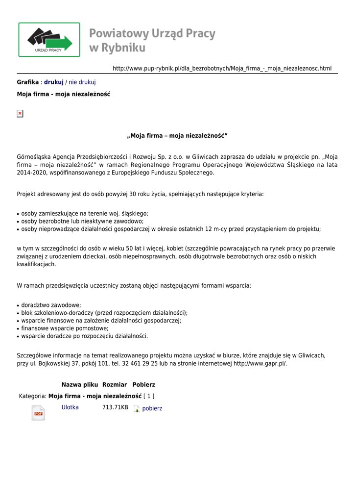 http://www.pup-rybnik.pl/dla_bezrobotnych/Moja_firma_-_moja_niezaleznosc.html Grafika : drukuj / nie drukuj Moja firma - moja niezależność „Moja firma – moja niezależność” Górnośląska Agencja Przedsiębiorczości i Rozwoju Sp. z o.o. w Gliwicach zaprasza do udziału w projekcie pn. „Moja firma – moja niezależność” w ramach Regionalnego Programu Operacyjnego Województwa Śląskiego na lata 2014-2020, współfinansowanego z Europejskiego Funduszu Społecznego. Projekt adresowany jest do osób powyżej 30 roku życia, spełniających następujące kryteria: ● ● ● osoby zamieszkujące na terenie woj. śląskiego; osoby bezrobotne lub nieaktywne zawodowo; osoby nieprowadzące działalności gospodarczej w okresie ostatnich 12 m-cy przed przystąpieniem do projektu; w tym w szczególności do osób w wieku 50 lat i więcej, kobiet (szczególnie powracających na rynek pracy po przerwie związanej z urodzeniem dziecka), osób niepełnosprawnych, osób długotrwale bezrobotnych oraz osób o niskich kwalifikacjach. W ramach przedsięwzięcia uczestnicy zostaną objęci następującymi formami wsparcia: ● ● ● ● ● doradztwo zawodowe; blok szkoleniowo-doradczy (przed rozpoczęciem działalności); wsparcie finansowe na założenie działalności gospodarczej; finansowe wsparcie pomostowe; wsparcie doradcze po rozpoczęciu działalności. Szczegółowe informacje na temat realizowanego projektu można uzyskać w biurze, które znajduje się w Gliwicach, przy ul. Bojkowskiej 37, pokój 101, tel. 32 461 29 25 lub na stronie internetowej http://www.gapr.pl/. Nazwa pliku Rozmiar Pobierz Kategoria: Moja firma - moja niezależność [ 1 ] Ulotka 713.71KB pobierz