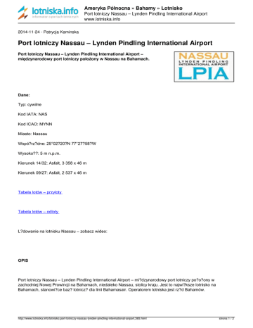 Ameryka Północna » Bahamy » Lotnisko Port lotniczy Nassau – Lynden Pindling International Airport www.lotniska.info 2014-11-24 - Patrycja Kaminska Port lotniczy Nassau – Lynden Pindling International Airport Port lotniczy Nassau – Lynden Pindling International Airport – międzynarodowy port lotniczy położony w Nassau na Bahamach. Dane: Typ: cywilne Kod IATA: NAS Kod ICAO: MYNN Miasto: Nassau Wspó?rz?dne: 25°02?20?N 77°27?58?W Wysoko??: 5 m n.p.m. Kierunek 14/32: Asfalt, 3 358 x 46 m Kierunek 09/27: Asfalt, 2 537 x 46 m Tabela lotów – przyloty Tabela lotów – odloty L?dowanie na lotnisku Nassau – zobacz wideo: OPIS Port lotniczy Nassau – Lynden Pindling International Airport – mi?dzynarodowy port lotniczy po?o?ony w zachodniej Nowej Prowincji na Bahamach, niedaleko Nassau, stolicy kraju. Jest to najwi?ksze lotnisko na Bahamach, stanowi?ce baz? lotnicz? dla linii Bahamasair. Operatorem lotniska jest rz?d Bahamów. http://www.lotniska.info/lotnisko,port-lotniczy-nassau-lynden-pindling-international-airport,365.html strona 1 / 2 Ameryka Północna » Bahamy » Lotnisko Port lotniczy Nassau – Lynden Pindling International Airport www.lotniska.info Port lotniczy Nassau zosta? otwarty 1 stycznia 1940 roku pod nazw? „Oakes Field” na cze?? milionera Harry'ego Oakes'a, który przeznaczy? znaczn? sum? pieni?dzy na budow? lotniska. By?o to pierwsze lotnisko na Bahamach, wcze?niej za? transport na wyspy odbywa? si? za pomoc? hydroplanów. Podczas II Wojny ?wiatowej, 30 grudnia 1942 roku port zosta? przemianowany na „Windsor Field” i nadano mu charakter militarny. Po zako?czeniu wojny z powrotem przywrócono mu charakter cywilny i zyska?o status g?ównego lotniska Bahamów pod nazw? Nassau International Airport. Nast?pnie, w 2006 roku nadano mu imi? na cze?? premiera Bahamów, Sir Lynden Oscar Pindling. Lotnisko Nassau znajduje si? na pi?tym miejscu w?ród najbardziej ruchliwych portów lotniczych Karaibów, z liczb? pasa?erów wynosz?c? 3,339,876 na rok 2012. DOJAZD Autobus Taxi Wynajem samochodu Strona internetowa lotniska http://www.nas.bs/Public/Home.aspx http://www.lotniska.info/lotnisko,port-lotniczy-nassau-lynden-pindling-international-airport,365.html http://www.lotniska.info/lotnisko,port-lotniczy-nassau-lynden-pindling-international-airport,365.html Powered by TCPDF (www.tcpdf.org) strona 2 / 2