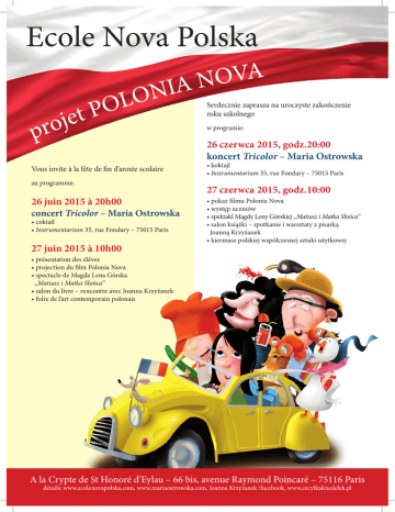 Ecole Nova Polska A V O N A I N O L O P t e j o r p 26 czerwca 2015, godz.20:00 Serdecznie zaprasza na uroczyste zakończenie roku szkolnego w programie: koncert Tricolor – Maria Ostrowska Vous invite à la fête de fin d’année scolaire au programme: 26 juin 2015 à 20h00 concert Tricolor – Maria Ostrowska • coktail • Instrumentarium 35, rue Fondary – 75015 Paris 27 juin 2015 à 10h00 • koktajl • Instrumentarium 35, rue Fondary – 75015 Paris 27 czerwca 2015, godz.10:00 • pokaz filmu Polonia Nova • występ uczniów • spektakl Magdy Leny Górskiej „Matiasz i Matka Słońca” • salon książki – spotkanie i warsztaty z pisarką Joanną Krzyżanek • kiermasz polskiej współczesnej sztuki użytkowej • présentation des élèves • projection du film Polonia Nova • spectacle de Magda Lena Górska „Matiasz i Matka Słońca” • salon du livre – rencontre avec Joanna Krzyżanek • foire de l’art contemporain polonais A la Crypte de St Honoré d’Eylau – 66 bis, avenue Raymond Poincaré – 75116 Paris détails: www.ecolenovapolska.com, www.mariaostrowska.com, Joanna Krzyżanek /facebook, www.cecylkaknedelek.pl
