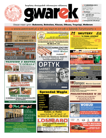19 WRZEŚNIA 2013 Nr 18/2013 (177) Nakład: 20 000 szt. ISSN: 1896-1797 Redakcja: ul. K. K. Wielkiego 29, 32-300 Olkusz tel. 698 805 242 608 696 097 e-mail: [email protected] [email protected] www.gwarek-olkuski.pl Obszar miast i gmin: Bukowno, Bolesław, Klucze, Olkusz, Trzyciąż, Wolbrom • www.asestravel.pl • tel. 32/ 647 71 07-08 • Salonik Turystyczny • STAROCIE, BIBELOTY, PORCELANA, KSIĄŻKI • SPRZEDAŻ • • SKUP • tel. 662 660 373 www.system-olkusz.pl OLKUSZ, ul. Sławkowska 22 KUCHNIE NA WYMIAR SKLEP SZAFY „ŁUKA” dypl. mistrz kucharstwa - Łukasz Szlęzak Organizacja styp i imprez okolicznościowych Olkusz, ul. Powstańców Śląskich 40 /obok cmentarza/ koszt stypy od jednej osoby - 38 zł /w tym obiad, ciasto, napoje zimne i gorące/ www.gastronomia-wolbrom.pl [email protected] ( 508 218 110 Zapraszamy również do organizacji imprez w naszych lokalach w Wolbromiu SKLEP WODNO-KANALIZACYJNY Łukasz Knapczyk Z DRZWIAMI SUWANYMI WSZYSTKO DO MEBLI czynne 9.00 - 17.00 tel./fax 32 641 32 00 kom. 502 26 15 86 WSZYSTKO Z DREWNA "U GÓRALA" U NAS NA JTANIEJ!!!! Przedsiębiorstwo Wielobranżowe SKUTERY SERWIS “U PANA LESZKA” • Naprawa chińskich skuterów, motorowerów, motocykli i quadów • Przeglądy i naprawy gwarancyjne i pogwarancyjne CZYNNE • Skutery zastępcze na czas naprawy PON. – SOB. • Możliwość transportu skutera do SERWISU • Skup skuterów uszkodzonych i powypadkowych 800 – 2200 • Sprzedaż części nowych i używanych do chińskich skuterów • Sprzedaż części używanych do WSK125 i ROMET • Sprzedaż skuterów nowych i używanych z gwarancją • Możliwość zostawienia starego lub uszkodzonego skutera w rozliczeniu • Konkurencyjne ceny napraw • Wypożyczalnia skuterów i motorowerów JERZMANOWICE 128B, Tel. 513 410 697 SALON KOTŁÓW C.O. DORADZTWO - SPRZEDAŻ - TRANSPORT - MONTAŻ ul. Główna, 32-329 Bolesław, tel. 728-820-552 Po - Pt 8.00 - 17.00, So 8.00 - 14.00 www.knapczyklukasz.bazarek.pl ECO-DOM Olkusz , ul. Sikorka 65 tel./fax 32 647 00 35, kom. 603 463 034 e-mail: [email protected] Producent wyrobów z drewna oferuje: • Boazerię świerkową: szer. 7 cm, 9 cm lub 15 cm • Podbitkę pod dachy • Bardzo duży asortyment listew wykończeniowych z lipy, świerka, buka, dębu i jesionu. Deski podłogowe, schody, poręcze, tralki, sztachety, więźby dachowe, meble oraz drzwi. tel. 32 643 22 33 kom. 662 331 345 kom. 516 969 700 Czynne: pon - piątek 9.00 - 17.15, sobota 9.00-13.00 Olkusz, ul. Wiejska 4 www.motoolkusz.otomoto.pl www.moto-olkusz.pl MOŻLIWOŚĆ DOWOZU WŁASNYM TRANSPORTEM ZAPRASZAMY pon - pt 900 - 1800 sob 900 - 1400 MOTOCYKLE SKUTERY ODZIEŻ AKCESORIA CZĘŚCI Zapraszamy na piętro Marcin Czerniak MEBLE POKOJOWE Sprzedaż Węgla MEBLE OGRODOWE 32-300 Olkusz, ul. Składowa 2, (budynek Dworca PKP) tel. (32) 754 60 10 [email protected], drzwi.olkusz24.pl ul. Nullo 2, 32-300 Olkusz na przeciwko postoju Taxi tel/fax: 32 211 03 27, kom. +48 519 409 079 [email protected] [email protected] pon - pt 9.00 ÷ 18.00, sobota 9.00 ÷ 13.00 • Nowoczesne Laptopy • Szybkie Komputery • • Tanie kasy fiskalne • • Wszystko, czego potrzebujesz do komputera • Profesjonalny serwis: Usługi związane z pełnym zakresem serwisu komputerów, laptopów oraz tabletów. WĘGIEL - orzech I - orzech II - kostka - groszek - ekogroszek - miał Rodaki, ul. Rzeka czynne: Pn-Pt od 730 - 1600, Sob 800 - 1400 Tel: 514 617 132 , 505 576 273, 728 122 613 LOMBARD Z NAMI ZAWSZE SIĘ DOGADASZ!! SKUP ZŁOTA 32-300 Olkusz, Rynek 24, tel. 32 643 34 26, 512 777 884 Czynne: 1000-1800 www.lombard.olkusz.pl PROJEKTOWANIE W 3D Al. 1000-lecia 15D, 32-300 Olkusz przy bramie wjazdowej do OFNE Emalia tel. 662 738 296, 601 432 908 [email protected] www.duodampex.pl WOBUD Sprzedaż urządzeń sanitarnych i grzewczych Autoryzowany Przedstawiciel: De Dietrich, Vailant, Junkers, SAS, Imerges ul.Nullo 23, 32-300 Olkusz, tel.32 754 26 27, 602 589 437 Projektowanie i doradztwo techniczne w zakresie instalacji gazowych, CO i Wod-Kan. - Tel 507 108 026 2 Informacje Powiatowy serwis informacyjny XXIV sesja Rady Powiatu Nad wprowadzeniem zmian w uchwale budżetowej i Wieloletniej Prognozie Finansowej Powiatu Olkuskiego oraz nad zaciągnięciem przez Powiat Olkuski kredytu bankowego długoterminowego głosowali radni 10 września, podczas XXIV sesji Rady Powiatu. Zaproponowane przez Zarząd Powiatu zmiany w uchwale budżetowej dotyczą nie tylko dochodów i wydatków, ale także przychodów i rozchodów. Dochody per saldo nie ulegają zmianie, natomiast wydatki budżetu maleją o 1.262.889 PLN i wzrastają o 912.889 PLN, co powoduje zmniejszenie deficytu budżetu o 350.000 PLN. Zmniejszenie wydatków wynika m.in. z rozwiązania rezerwy celowej na zabezpieczenie poręczenia spłaty kredytu zaciągniętego przez ZOZ Olkusz, obniżenia kosztów obsługi długu Powiatu Olkuskiego w związku z obniżką stóp procentowych od zaciągniętych kredytów w stosunku do planowanych, z korekty wydatków na druki komunikacyjne, zmiany klasyfikacji budżetowej wydatków na budowę windy w budynku Starostwa, z ograniczenia dotacji dla Gminy Wolbrom, z urealnienia o 9.000 PLN środków na ochronę budowanego CKU i KZ w Olkuszu, z urealnienia dotacji dla ZOZ Olkusz na dokumentację projektu „Najzdrowszy Powiat Europy", z urealnienia wydatków na wynagrodzenia koordynatorów rodzin zastępczych, a także ze zmiany struktury wydatków bieżących Starostwa Powiatowego ze statutowych na dotacje dla Gminy Klucze na organizację dożynek powiatowych itp. Z kolei zwiększenie wydatków wynika po pierwsze z konieczności wypłaty odpraw 3- i 6-miesięcznych dla nauczycieli. By pozostać przy sprawach oświaty, kolejną pozycją na liście wydatków jest zwiększenie sumy przeznaczonej na realizację programu unijnego „Modernizacja kształcenia zawodowego w Małopolsce”. Inny powód zwiększenia wydatków – to z konieczność zwrotu do budżetu państwa kwoty otrzym