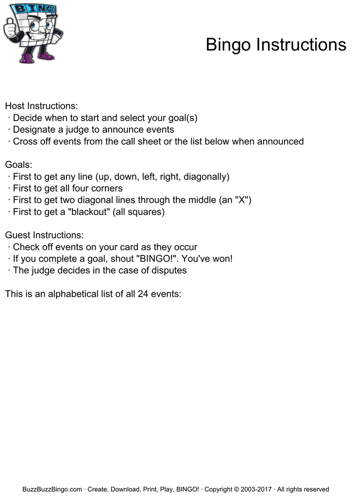 Bingo Instructions Host Instructions: · Decide when to start and select your goal(s) · Designate a judge to announce events · Cross off events from the call sheet or the list below when announced Goals: · First to get any line (up, down, left, right, diagonally) · First to get all four corners · First to get two diagonal lines through the middle (an "X") · First to get a "blackout" (all squares) Guest Instructions: · Check off events on your card as they occur · If you complete a goal, shout "BINGO!". You've won! · The judge decides in the case of disputes This is an alphabetical list of all 24 events: BuzzBuzzBingo.com · Create, Download, Print, Play, BINGO! · Copyright © 2003-2017 · All rights reserved Bingo Call Sheet This is a randomized list of all 24 bingo events in square format that you can mark off in order, choose from randomly, or cut up to pull from a hat: Sudoku i odlicznie Gra w karty Zapisz w dzienniku Porozmawiaj z przyjacielem Porysuj Porozmawiaj z personelem Taniec Obejrzyj film Czytanie Malowanie Gotowanie BuzzBuzzBingo.com · Create, Download, Print, Play, BINGO! · Copyright © 2003-2017 · All rights reserved B I N G O Porozmawiaj z personelem Malowanie Gra w karty Zapisz w dzienniku Czytanie Sudoku i odlicznie Porysuj Porozmawiaj z przyjacielem Taniec Gotowanie Obejrzyj film This bingo card was created randomly from a total of 24 events. BuzzBuzzBingo.com · Create, Download, Print, Play, BINGO! · Copyright © 2003-2017 · All rights reserved B I N G O Porozmawiaj z personelem Malowanie Taniec Czytanie Sudoku i odlicznie Porozmawiaj z przyjacielem Porysuj Zapisz w dzienniku Gra w karty Obejrzyj film Gotowanie This bingo card was created randomly from a total of 24 events. BuzzBuzzBingo.com · Create, Download, Print, Play, BINGO! · Copyright © 2003-2017 · All rights reserved